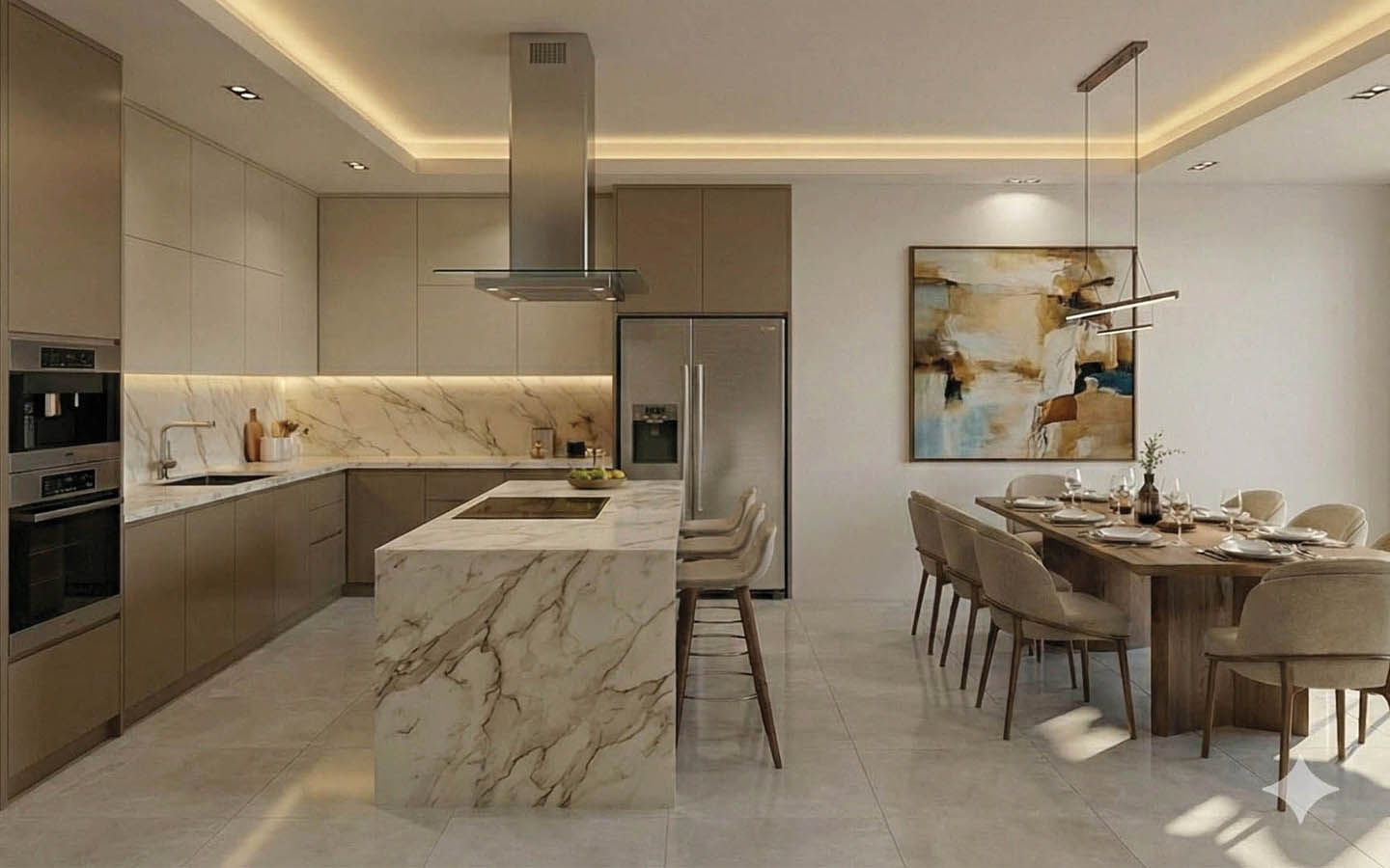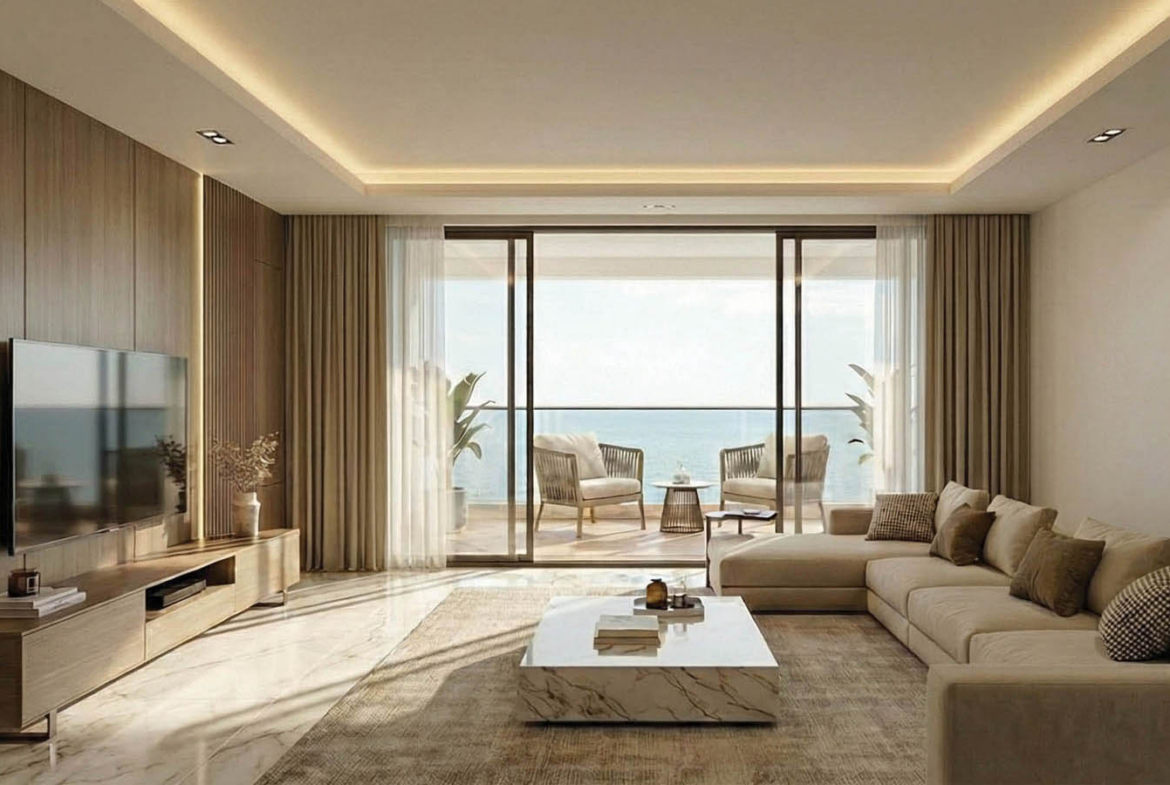 The visualisations reveal the spirit of the future interior particularly well. It is important to note that the apartment is being sold unfurnished, and the images shown are interior designers’ interpretations of how the space may look once completed and styled. Yet this is precisely what makes them so valuable: they help capture the full potential of the property. In these renderings, the living room opens through wide sliding glass doors, drawing in as much natural light as possible. The kitchen and dining area are united in one open-plan setting, where the central island becomes more than a practical surface; it acts as the visual anchor of the entire daytime living area. A light colour palette, marble-inspired textures, soft beige and wood tones, built-in storage solutions, and clean architectural lines create an interior that feels both refined and calm. This is not ostentatious luxury, but the kind of contemporary elegance that never grows tired of itself.