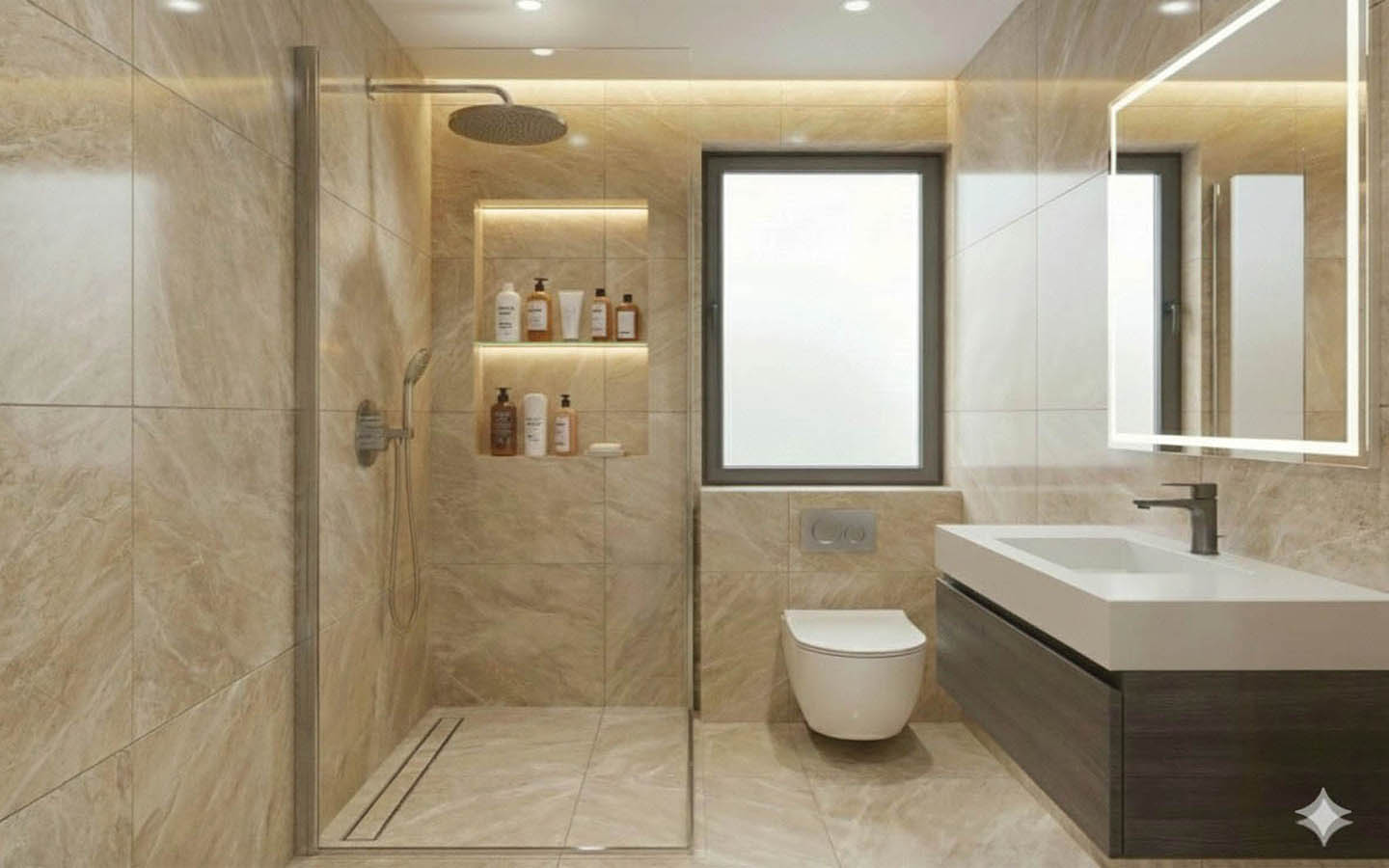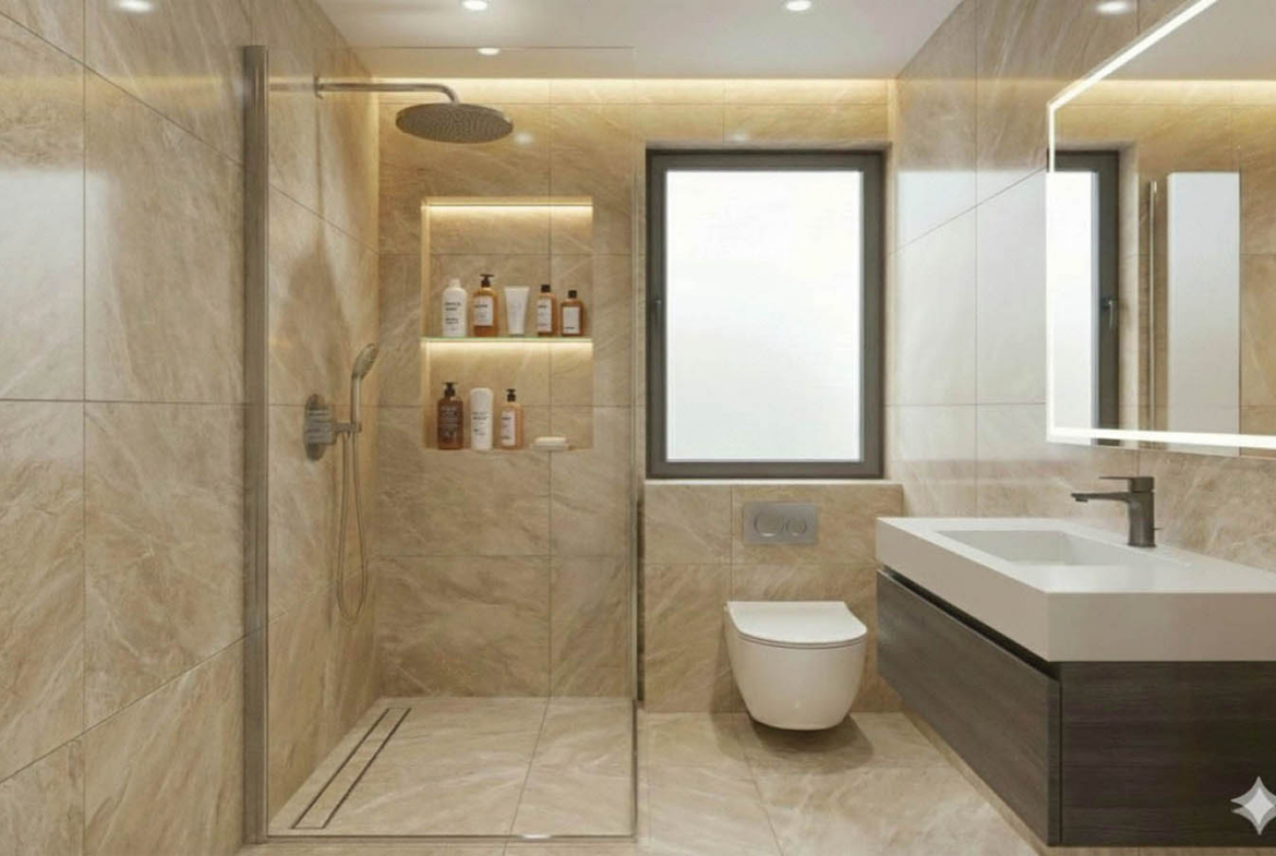 The bedroom, as imagined in the visualisations, follows the same sense of proportion and restraint. Nothing feels overloaded with detail, yet everything contributes to a proper sense of calm and personal space. Built-in wardrobes, generous window openings, a neutral palette, and soft lighting create an atmosphere in which it is easy to picture a measured daily rhythm, free from visual noise. The bathroom continues this idea with large-format tiles, a contemporary shower, wall-mounted sanitary ware, and crisp geometric lines that underline the project’s commitment to lasting comfort rather than short-term decorative effect.