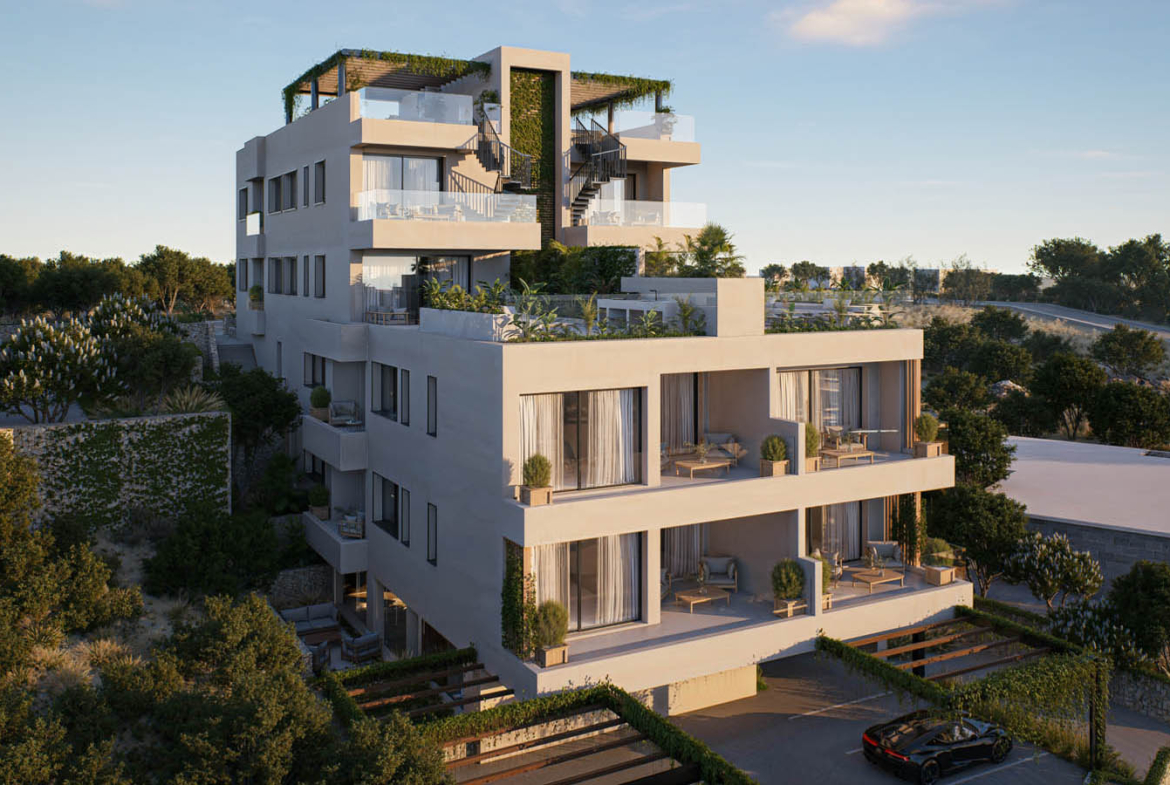The architectural concept of the complex is striking from the very first glance. The building appears to rise naturally from the contours of the land, not in contrast to the landscape, but as a continuation of it. Light-toned volumes, clean geometry, broad horizontal terraces, expansive glazing, natural textures and elegant vertical slatted details come together to create a contemporary Mediterranean aesthetic in which restraint becomes the purest expression of luxury. What makes this project especially compelling is that it offers more than visual beauty alone. Its composition has been thoughtfully considered, allowing the residence to open towards the panorama, the light and the distant sea horizon, while still preserving the intimacy and privacy of each individual home.