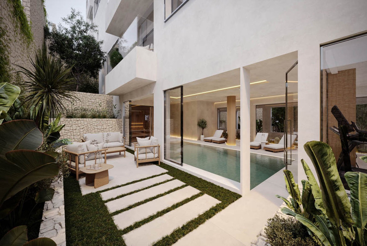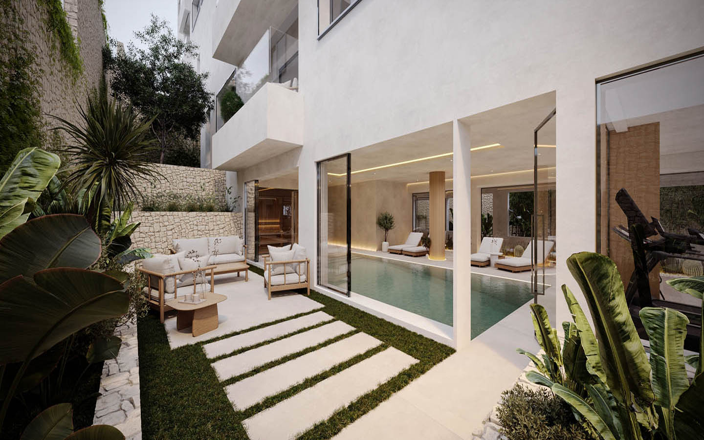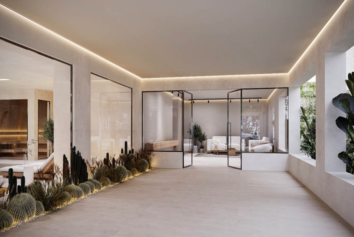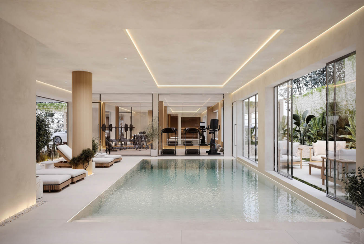 The communal areas hold a special place within this project, and they are very much what elevate it into the category of genuinely high-end living. The indoor heated swimming pool has been conceived not as a purely functional feature, but as a complete wellness environment. Here, water becomes part of the architectural language itself, reflecting the light, enhancing the depth of the interiors and reinforcing the overall feeling of calm. Through large glazed openings, the pool is visually connected to green outdoor patios, where stone, planting and soft garden furnishings create the atmosphere of a private resort. It is easy to imagine beginning the day with an unhurried swim and ending it in a state of total restoration, with the outside world left quietly behind. The addition of a private gym and sauna further strengthens this sense of comfort, privacy and understated exclusivity.