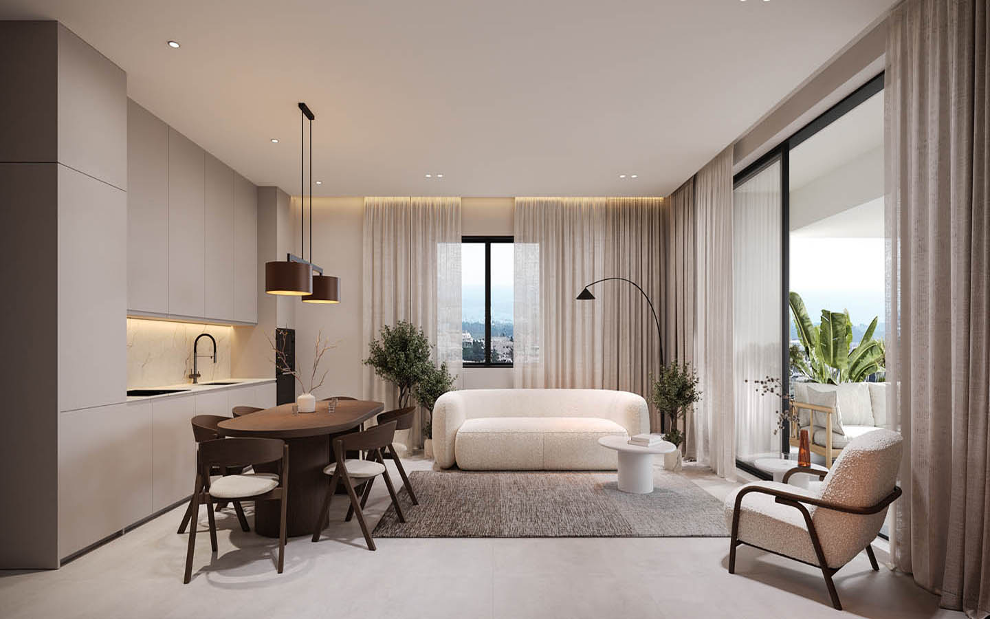 The terraces deserve particular attention. They are not experienced as a simple extension of the apartment, but as a natural continuation of the living space. This is where one finds that rare Mediterranean lifestyle so many buyers seek in Cyprus: morning coffee against the softened line of the horizon, a relaxed lunch in the winter sun, or an evening spent reading in warm air scented with greenery. These generous outdoor spaces allow the architecture to merge gently with the landscape and the distant views of the sea, bringing a wonderful sense of openness and ease to daily life.
