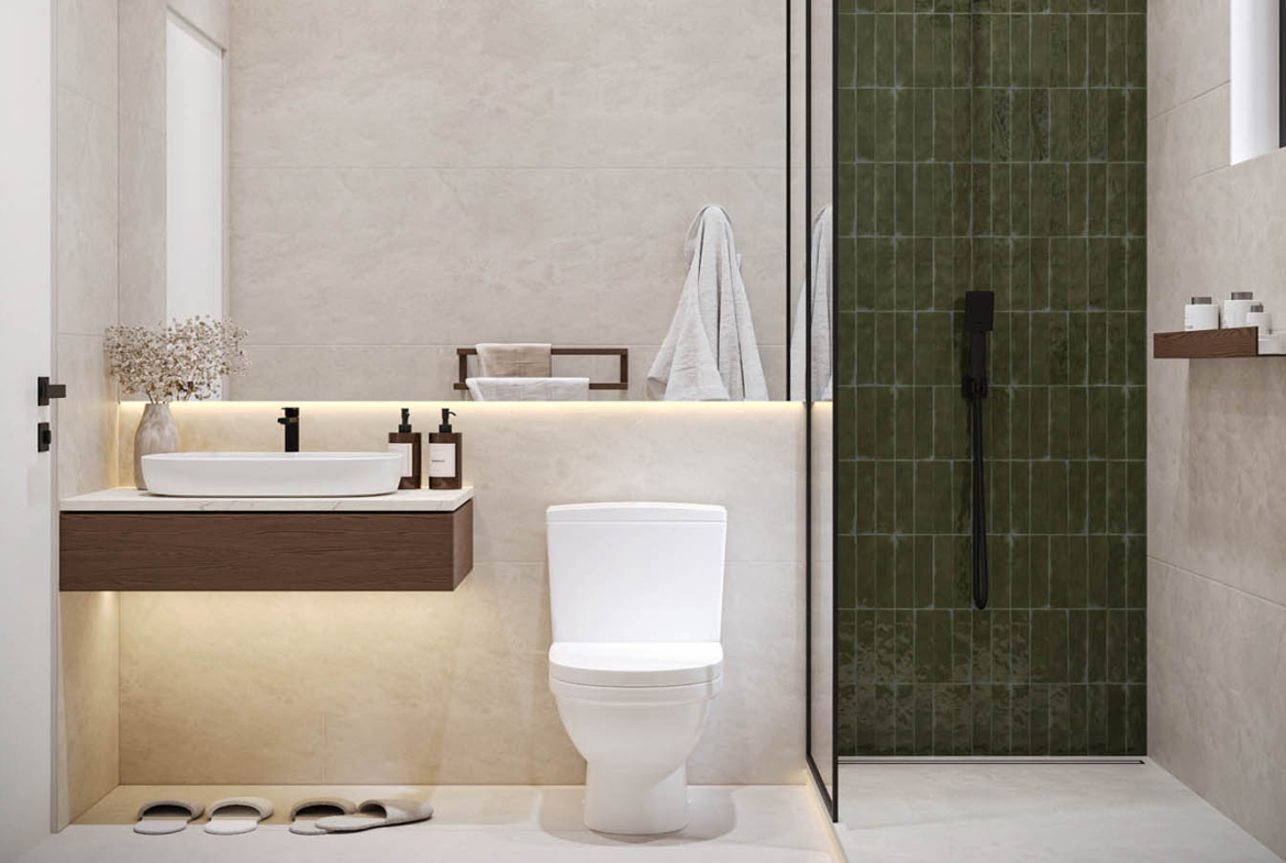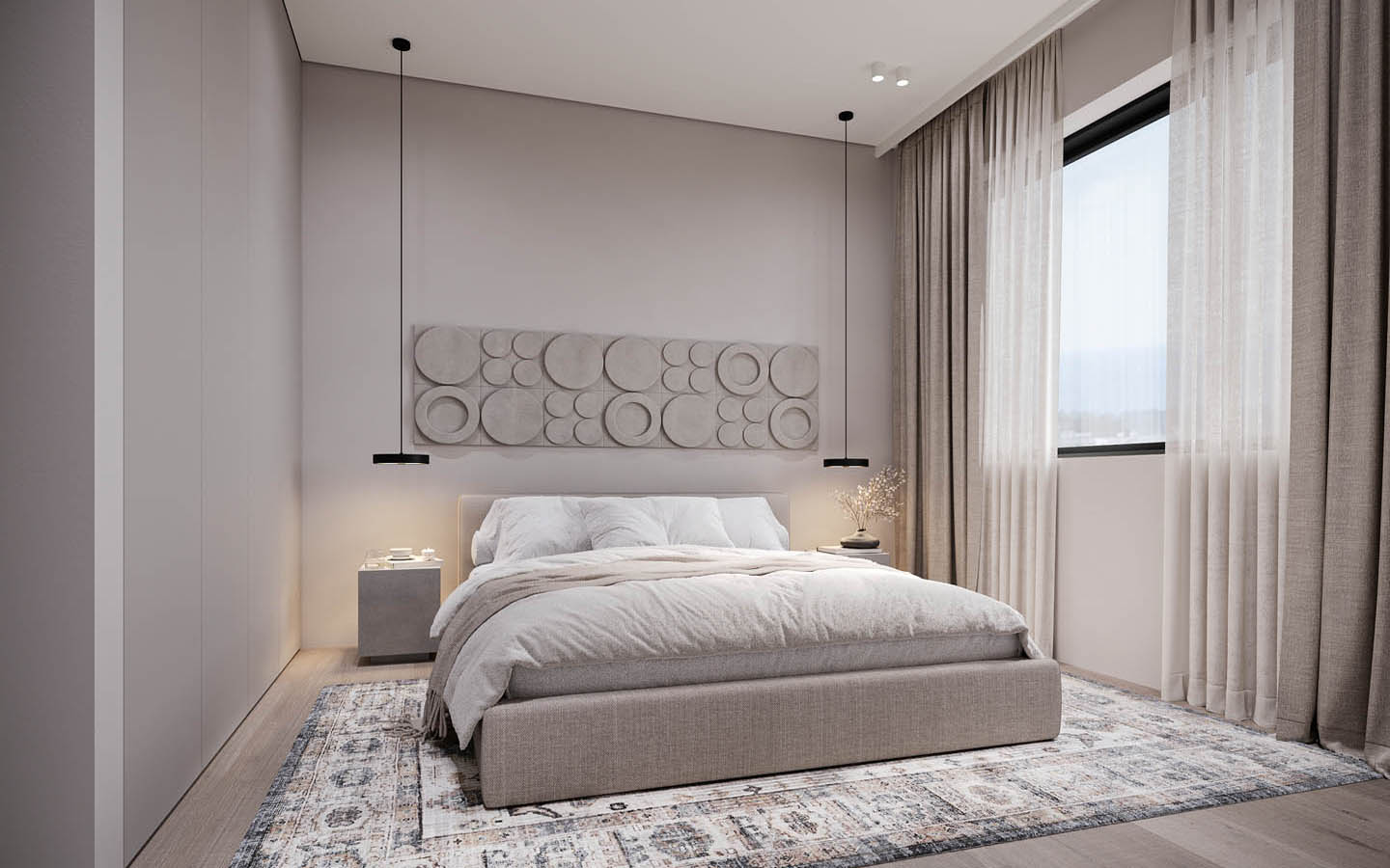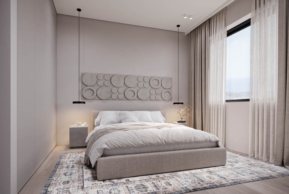 For a one-bedroom apartment, it is not only the square meters that matter, but the quality of the space itself. The visual character of the interiors suggests a beautifully cohesive atmosphere: a gentle palette of natural tones, discreet integrated lighting, minimalist kitchen lines, softly contoured furnishings, generous windows and a seamless transition from the living area to the spacious veranda. The interior has been designed so that light becomes part of the architecture. By day, the rooms are filled with a soft natural glow that draws attention to the textures of wood, stone and fabric. By evening, the space takes on an almost boutique-hotel softness — calm, inviting and deeply refined. In the bedroom, this mood continues in a quieter, more intimate register, where everything is arranged around rest, silence and a sense of shelter.