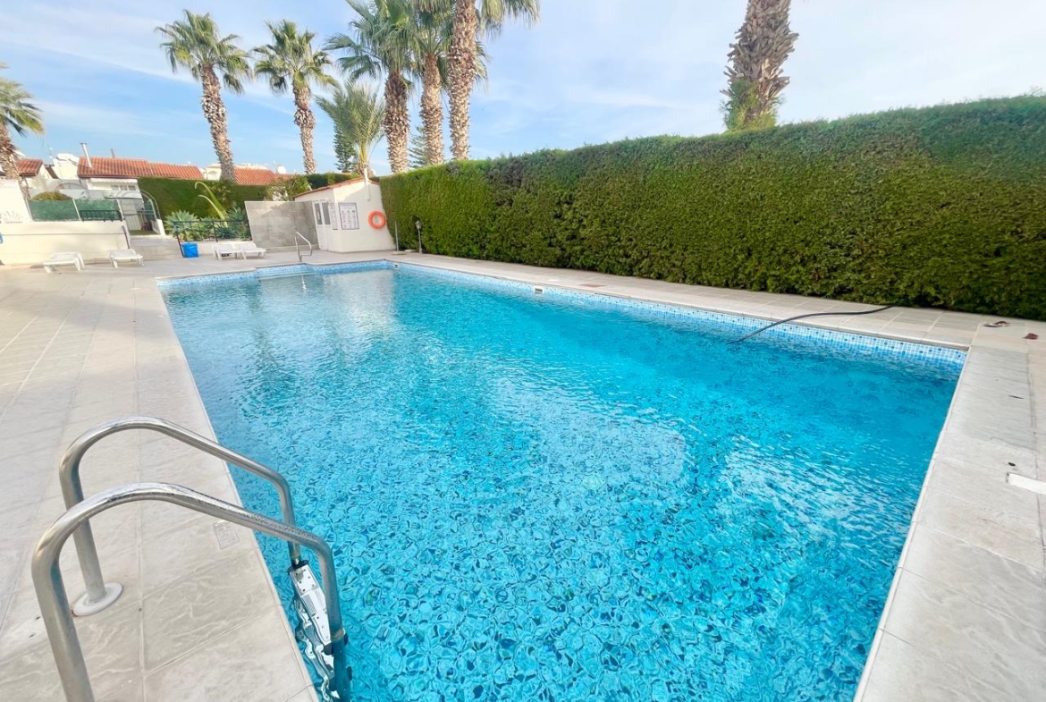 The terrace is one of the true pleasures of this home. It’s spacious enough for a proper outdoor table and dinners with friends under the open sky, yet it still feels cosy: part of the railing is finished with decorative screens that give privacy without turning it into a closed-off courtyard. In front of you is the green territory of the complex — tidy palm trees, a well-kept lawn — and a little further, the area’s characteristic low-rise neighbourhood. The sea feels close in a very physical way: in the light, in the air, in how quickly the mood of the day changes. On clear days, when your взгляд drifts above the rooftops, that fine blue sea line appears — the very reason many people choose Kato Paphos. There’s also a view towards the shared leisure area: a large communal swimming pool with wide sun terraces and loungers, where it’s easy to relax without fuss — just step outside and you’re “on holiday” without even starting the car.