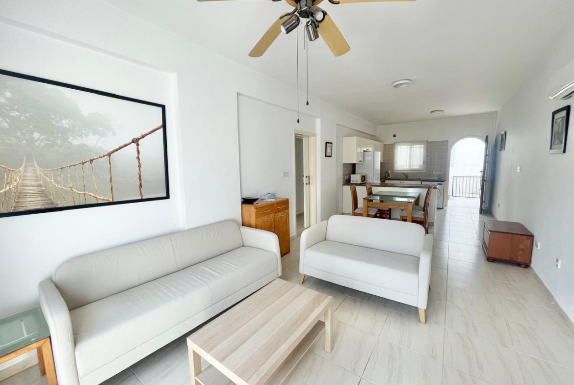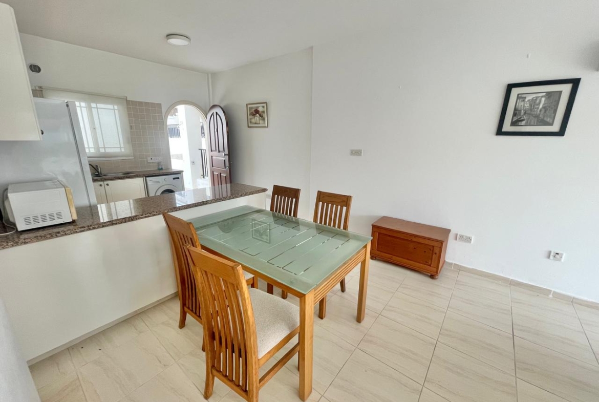 The building follows a classic low-rise Cypriot style: a light façade, clean lines, and arched openings that soften the architecture and give it that unmistakable southern feel. One of those arches leads from the apartment onto the terrace, and that sense of space is there from the moment you step inside. The layout is open, with no unnecessary corridors or dark corners: the kitchen, dining area, and living room flow together as one coherent space. Light walls and neutral floor tiles create a fresh backdrop that always looks airy and easy, while the wooden furniture adds warmth and a homely character.