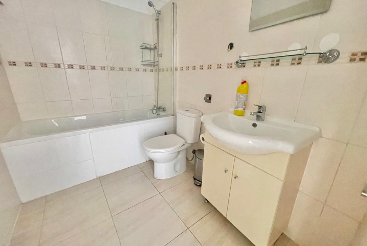 Both bedrooms are as straightforward and well thought-out as the rest of the apartment. One features a large wooden bed, bedside tables, and soft lighting; it also has access to the terrace, so mornings can start not with a phone, but with fresh air and quiet. The second bedroom, with two single beds, is a great option for children, guests, or anyone planning to rent the property out: it’s bright, tidy, air-conditioned, and doesn’t feel cramped. The family bathroom is finished in neutral tiling and includes a bathtub with shower, a practical vanity with sink and mirror — clean, calm, and with no unpleasant surprises.