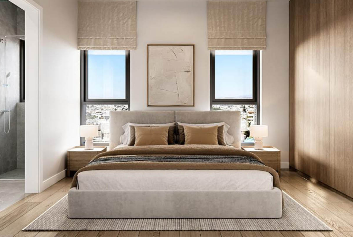 The bedrooms are envisioned as the private part of the home, where quiet, softness, and a sense of shelter matter most. According to the project materials, the bedrooms have been designed with an emphasis on comfort and storage, while the bathrooms follow a modern, understated direction with durable materials and a carefully considered aesthetic. In the visualizations, the principal bedroom appears as a calm retreat above the city: a light palette, warm wood, large windows, and restrained décor create that rare atmosphere in which rest truly becomes restoration.