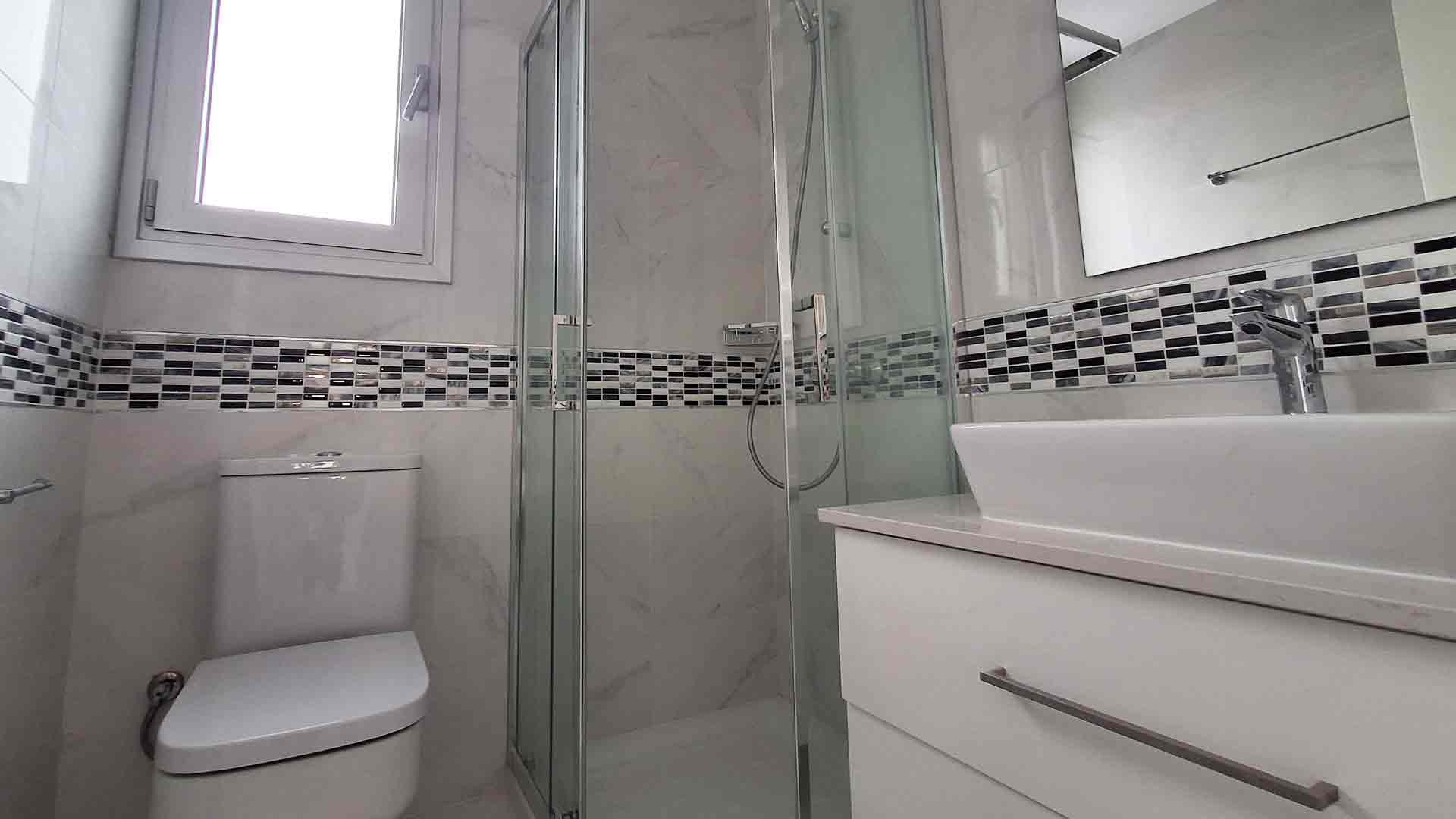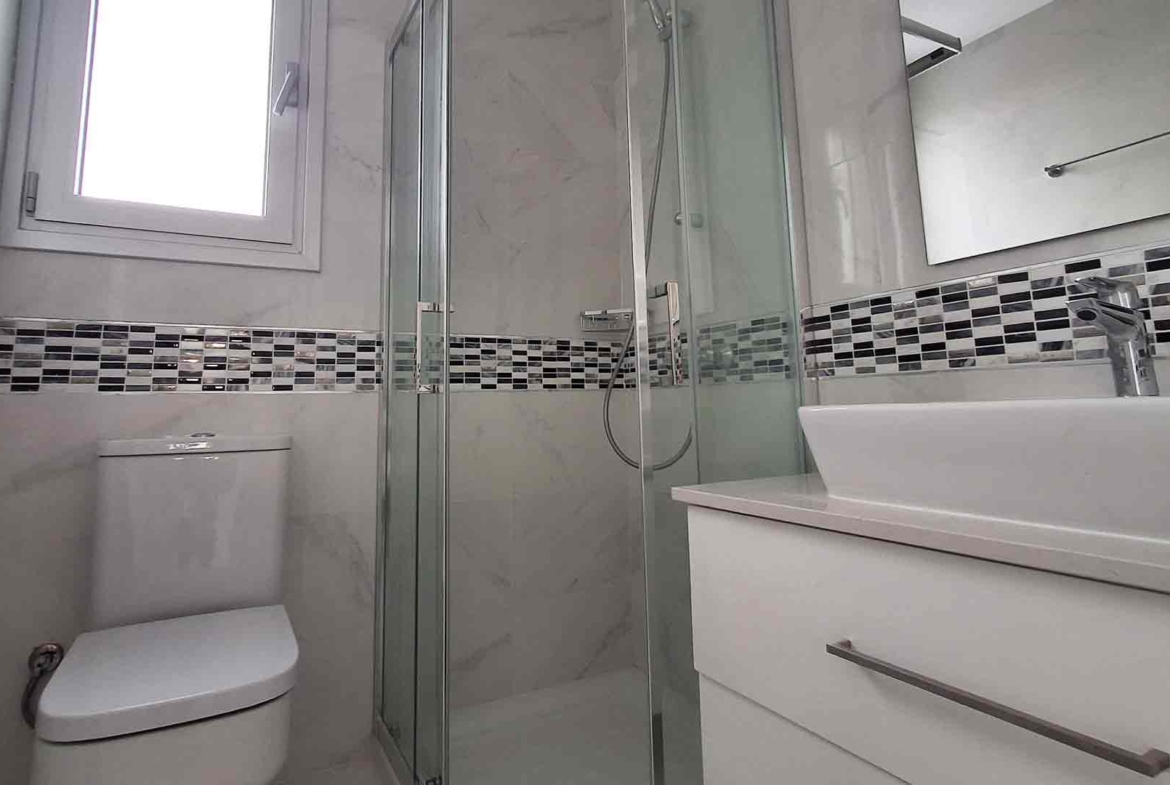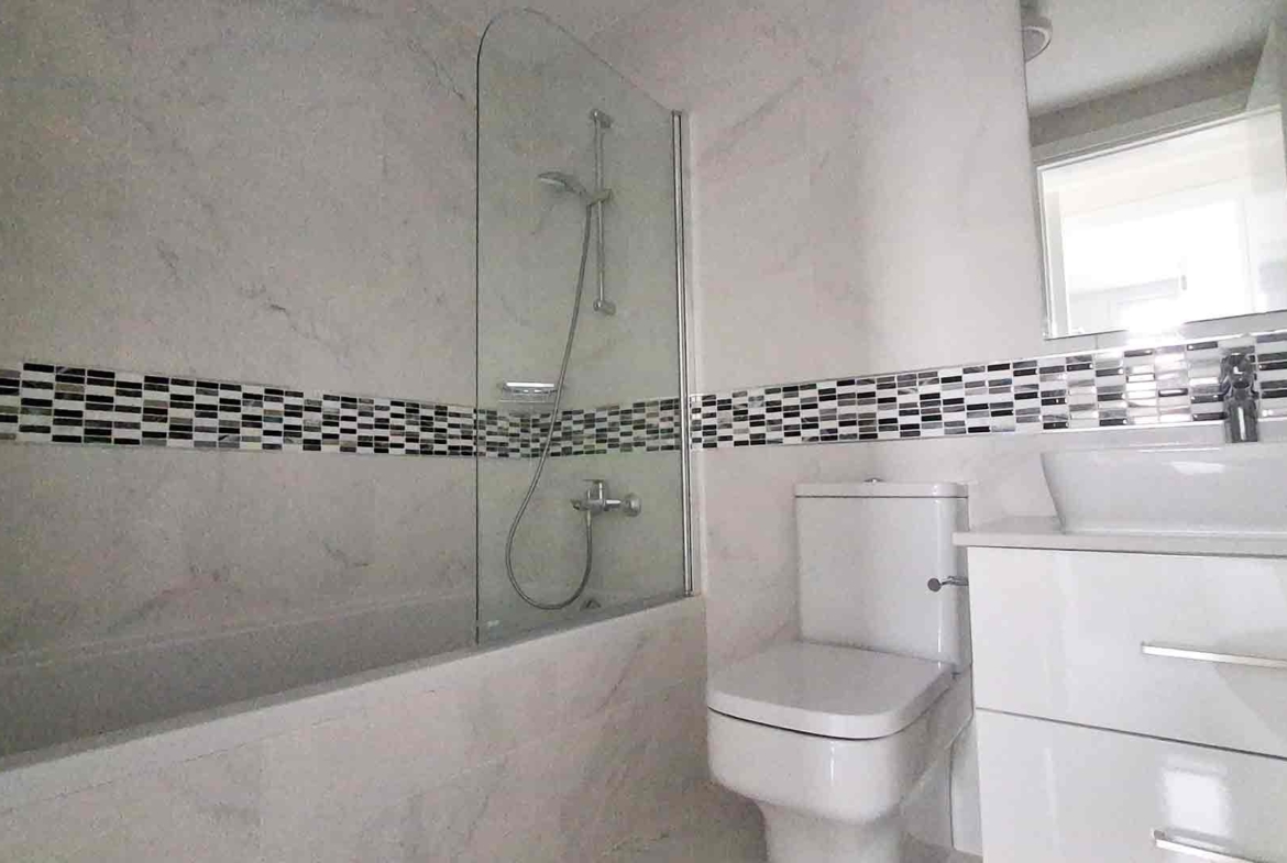 Bathrooms are another strong advantage — there are two of them. One is located near the bedrooms, the other closer to the entrance. Both are designed in a clean modern style — white with dark mosaic accents, glass shower enclosures, and sleek furnishings. Everything is new, spotless, and ready to use — designed for stress-free living.