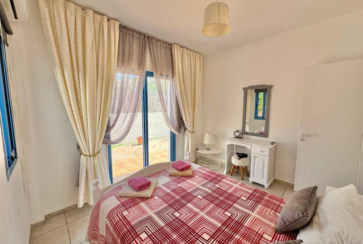 The bedrooms are simple and welcoming. One features a bunk bed, playful wall art reading “Laugh” and “Love,” a large wardrobe, and cool tiled floors — a perfect space for kids, grandchildren, or guests who won’t want to leave. The second bedroom offers a full-size bed with a bright red cover, delicate white furniture, a charming pouffe, and soft drapes that filter the morning sun. Both rooms open directly onto the private courtyard.