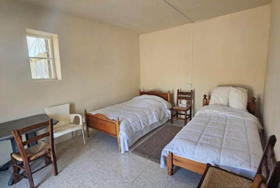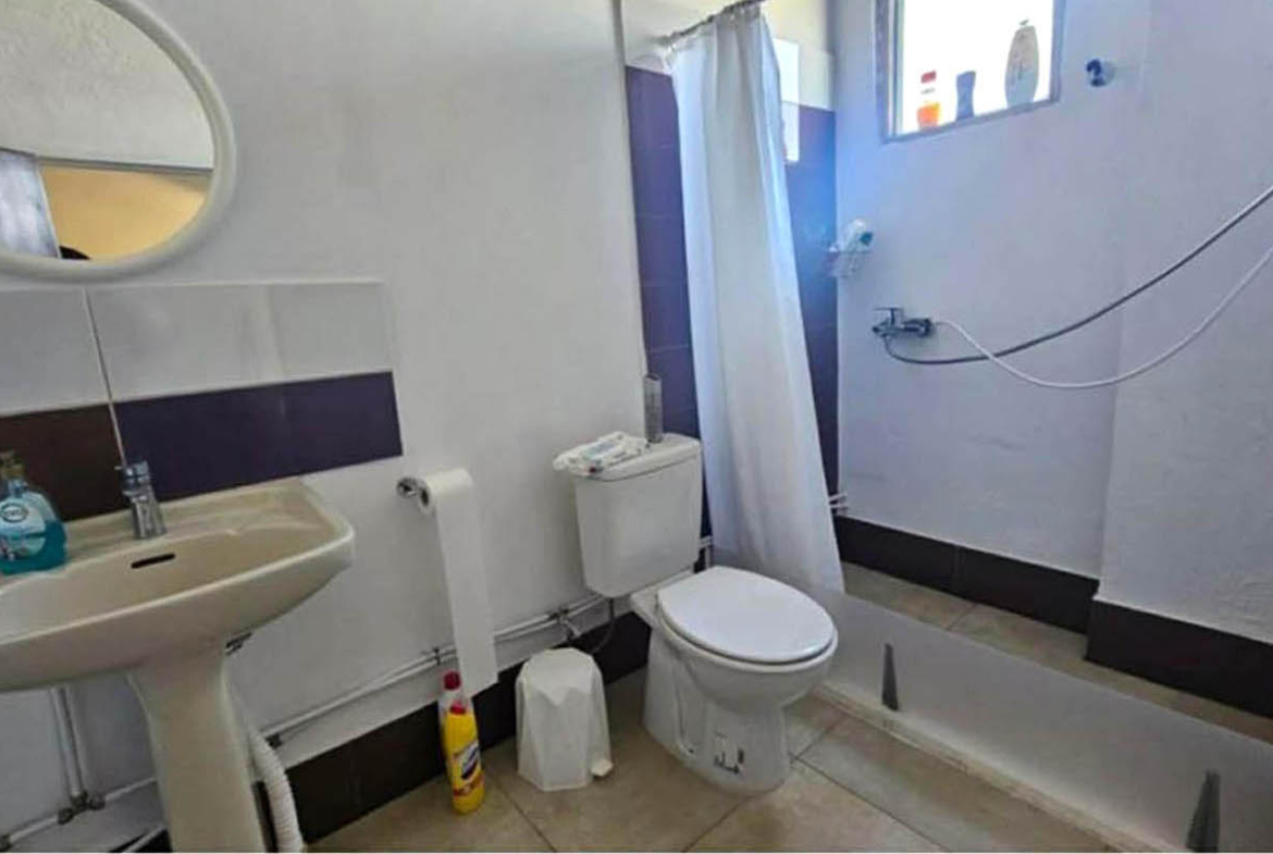 The two bedrooms are simple, bright, and pleasantly quiet. One has the feel of a guest room, with twin beds and minimal details—an honest, relaxed “country house” atmosphere that can be transformed into anything you need, from a cosy children’s room to a calm home office for remote work. The bathroom is equally practical, with a bathtub, a shower area, and natural daylight from the window—something especially appreciated in homes like this, where morning routines don’t have to happen in total darkness.
