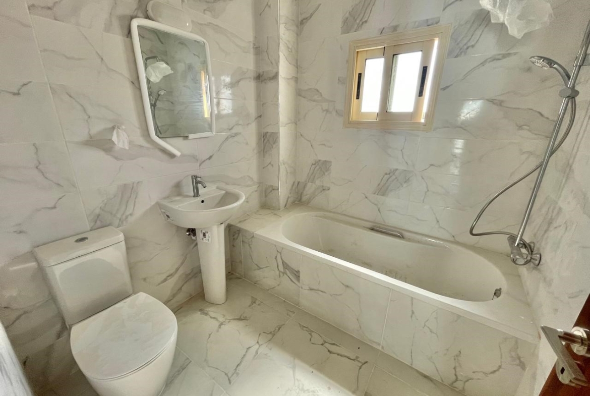 The upper floor is dedicated to the private family quarters. Three spacious bedrooms create that rare feeling that everyone has enough room—there’s no need to choose between a home office, a child’s room, and a guest bedroom, because everything can be arranged sensibly. Two bedrooms face south and open onto the veranda, with sea views that are especially enjoyable because the sea here is not a distant picture—it becomes part of your everyday mood. The master bedroom offers the best perspective of all: step onto the balcony, breathe in the salty air, and catch that unmistakable Cypriot lightness that inspires so many people to slow down and change their pace of life. The third bedroom sits in a quieter part of the house—ideal for a child, a home office, or a comfortable guest room. The family bathroom is finished in a bright marble style: clean lines, neat fittings, a bathtub for relaxation, and a window for natural ventilation—everything feels fresh, well-kept, and ready.