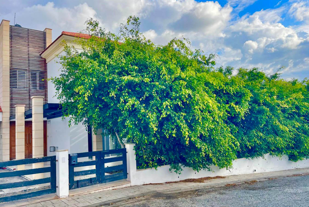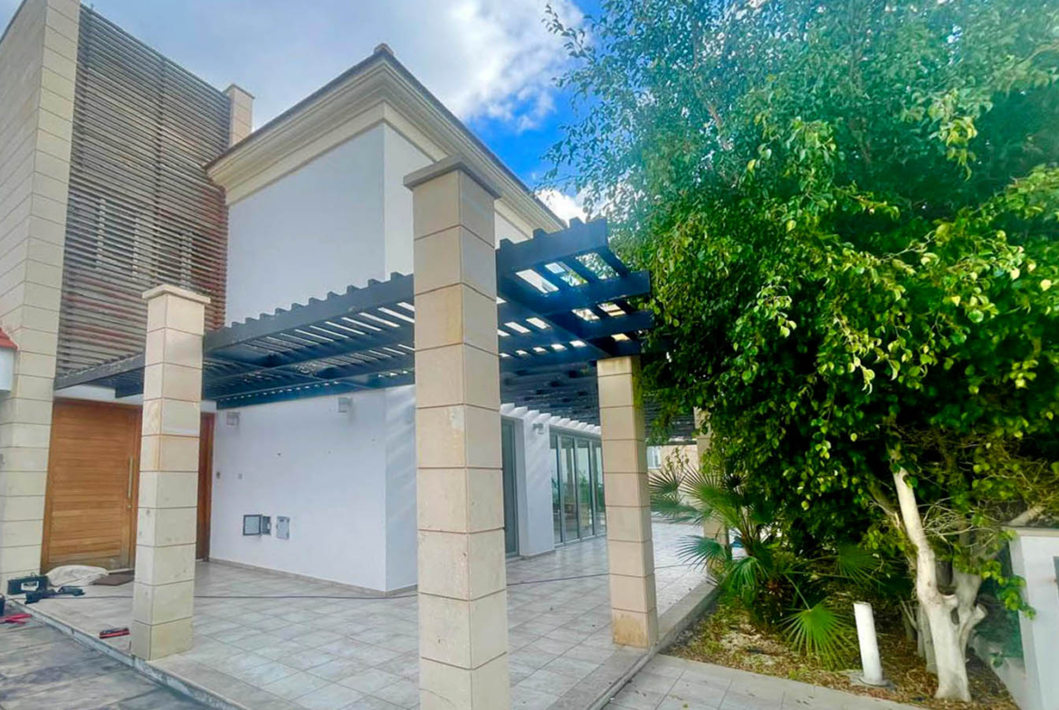 This two-storey villa in Coral Bay will feel like a safe haven for those who value the quiet of a private home, yet don’t want to “hide” from the sea and from life itself. From the street, the villa looks neat and contemporary: crisp white facades, warm stone columns, and a striking pergola that, on sunny days, paints a beautiful play of light and shadow across the tiled terraces. The driveway is secured by gates, the home includes a garage, and a lush “green wall” of mature trees and shrubs creates a soothing sense of seclusion—as if you were living not in a sought-after neighbourhood, but in your own small oasis.