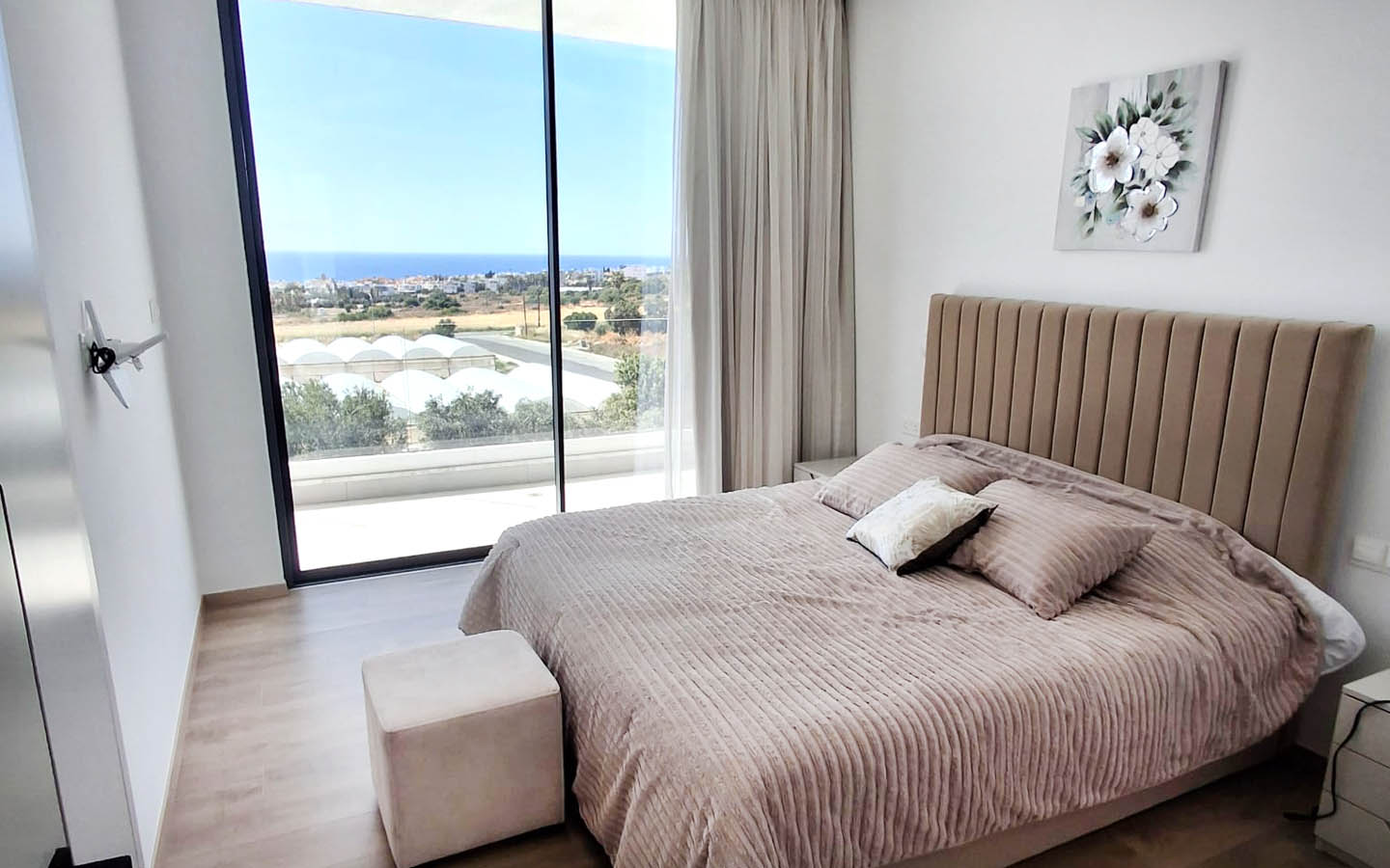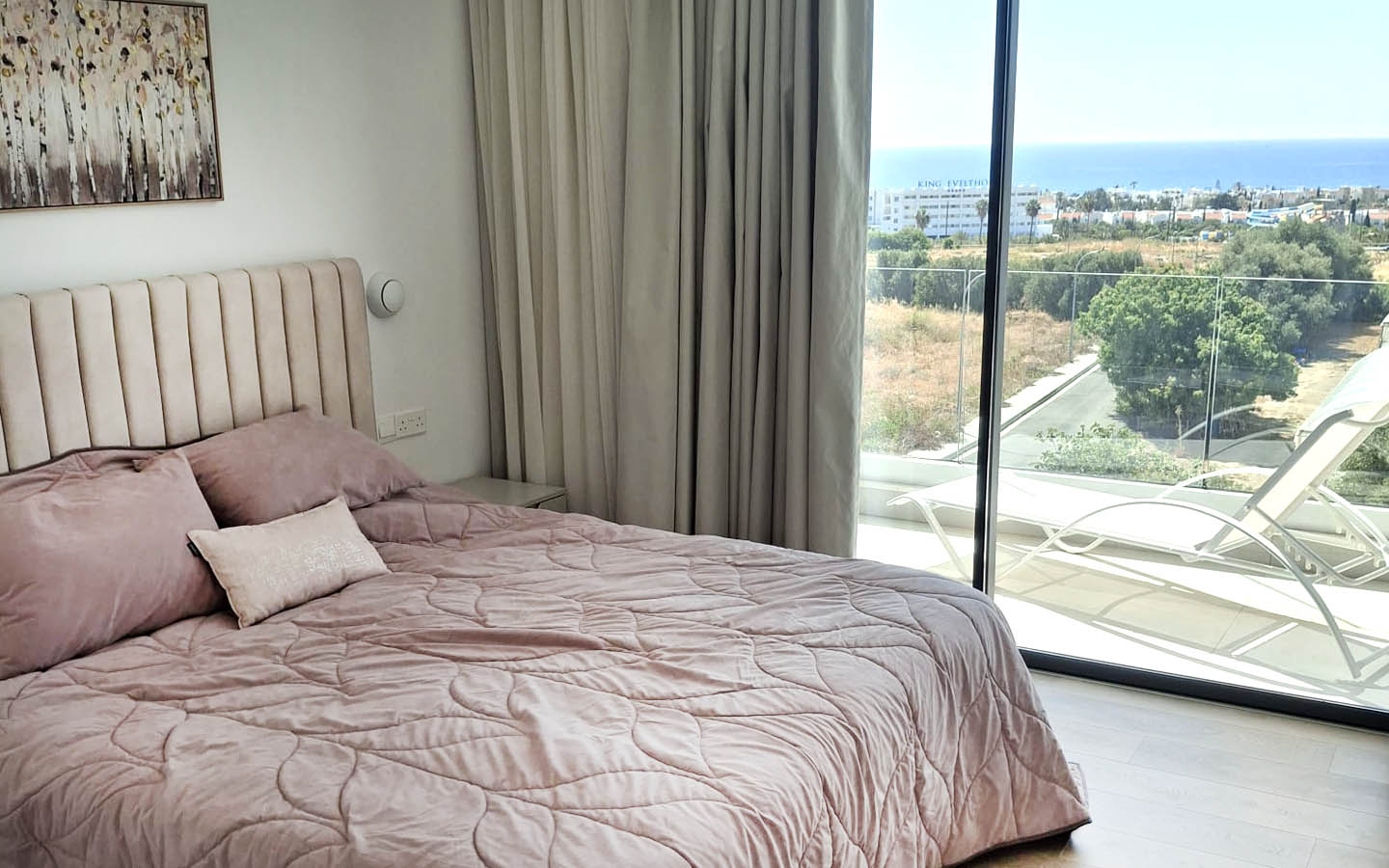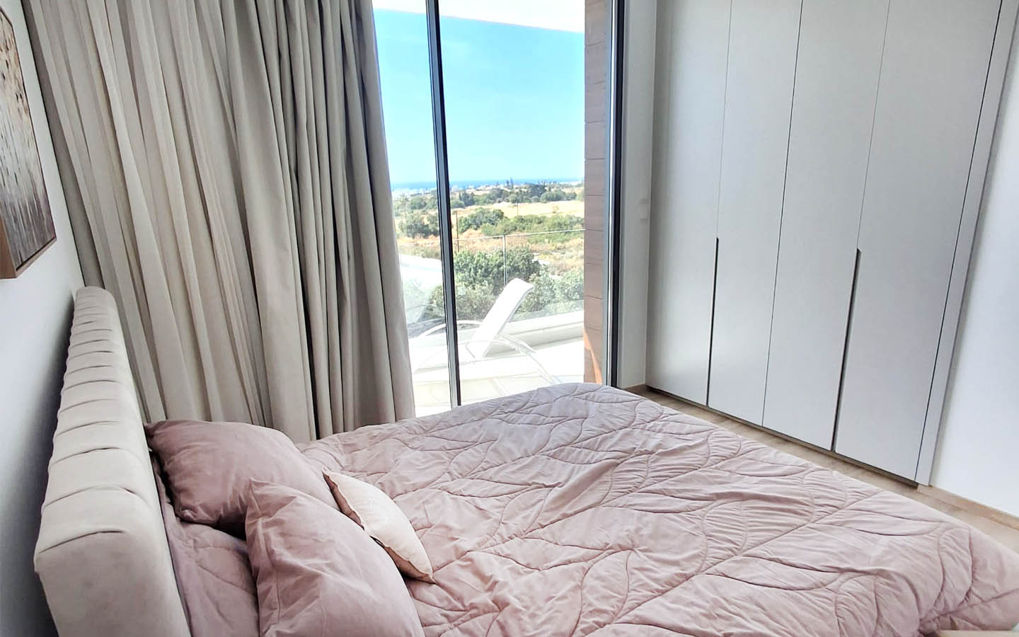 The bedrooms in this villa feel especially soft in mood. One of them is decorated in gentle powdery beige tones: a high upholstered headboard, cozy textiles, calm curtains, and artwork above the bed create an intimate, very homely feeling. Yet the main luxury of the room is its access to the balcony and the sea view. Here, the morning does not begin with the noise of the city, but with light passing through the glass and gradually filling the room with warmth. The panorama of the coastline, greenery, and open sky becomes a natural continuation of the interior.