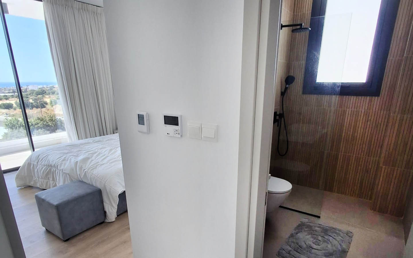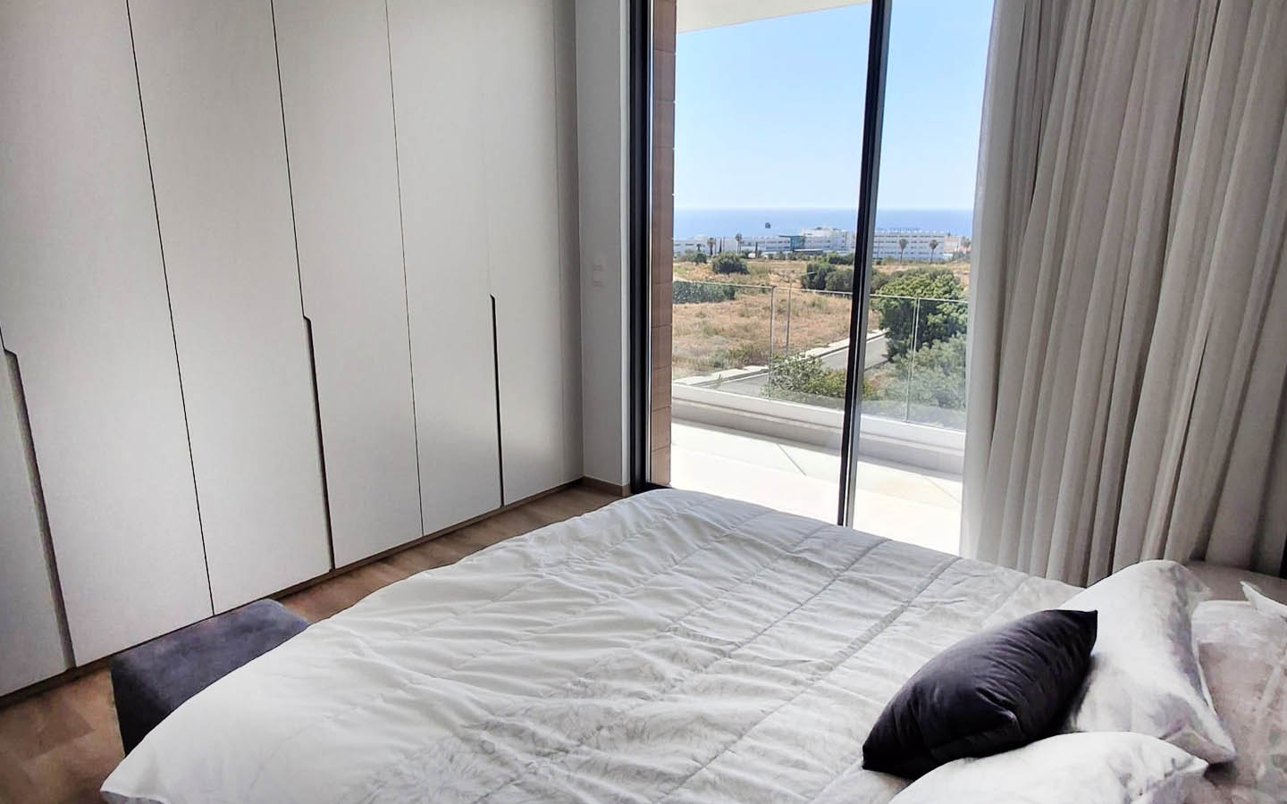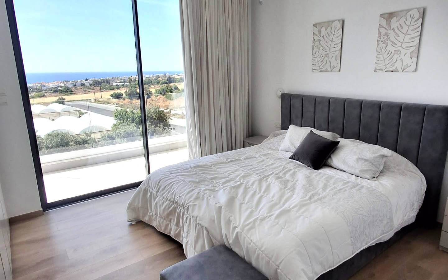 The bedrooms in this villa feel especially soft in mood. One of them is decorated in gentle powdery beige tones: a high upholstered headboard, cozy textiles, calm curtains, and artwork above the bed create an intimate, very homely feeling. Yet the main luxury of the room is its access to the balcony and the sea view. Here, the morning does not begin with the noise of the city, but with light passing through the glass and gradually filling the room with warmth. The panorama of the coastline, greenery, and open sky becomes a natural continuation of the interior.