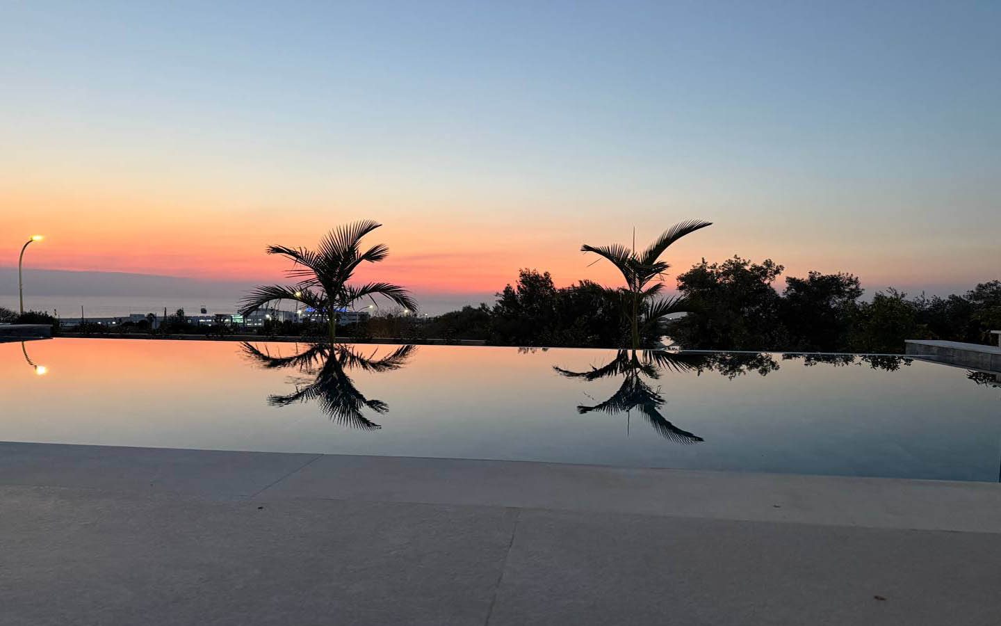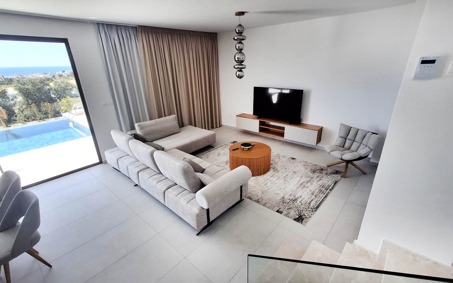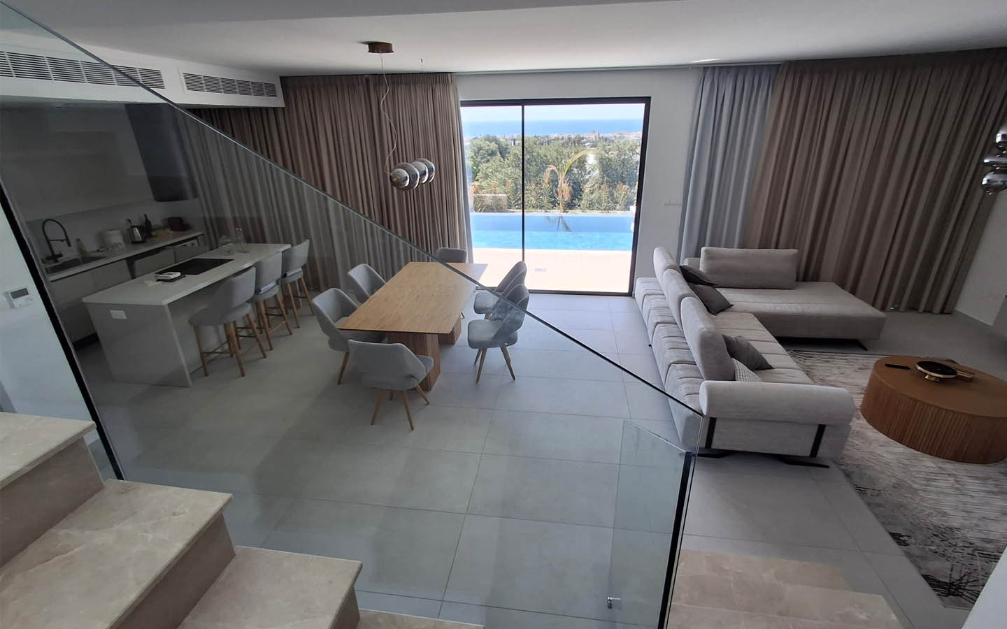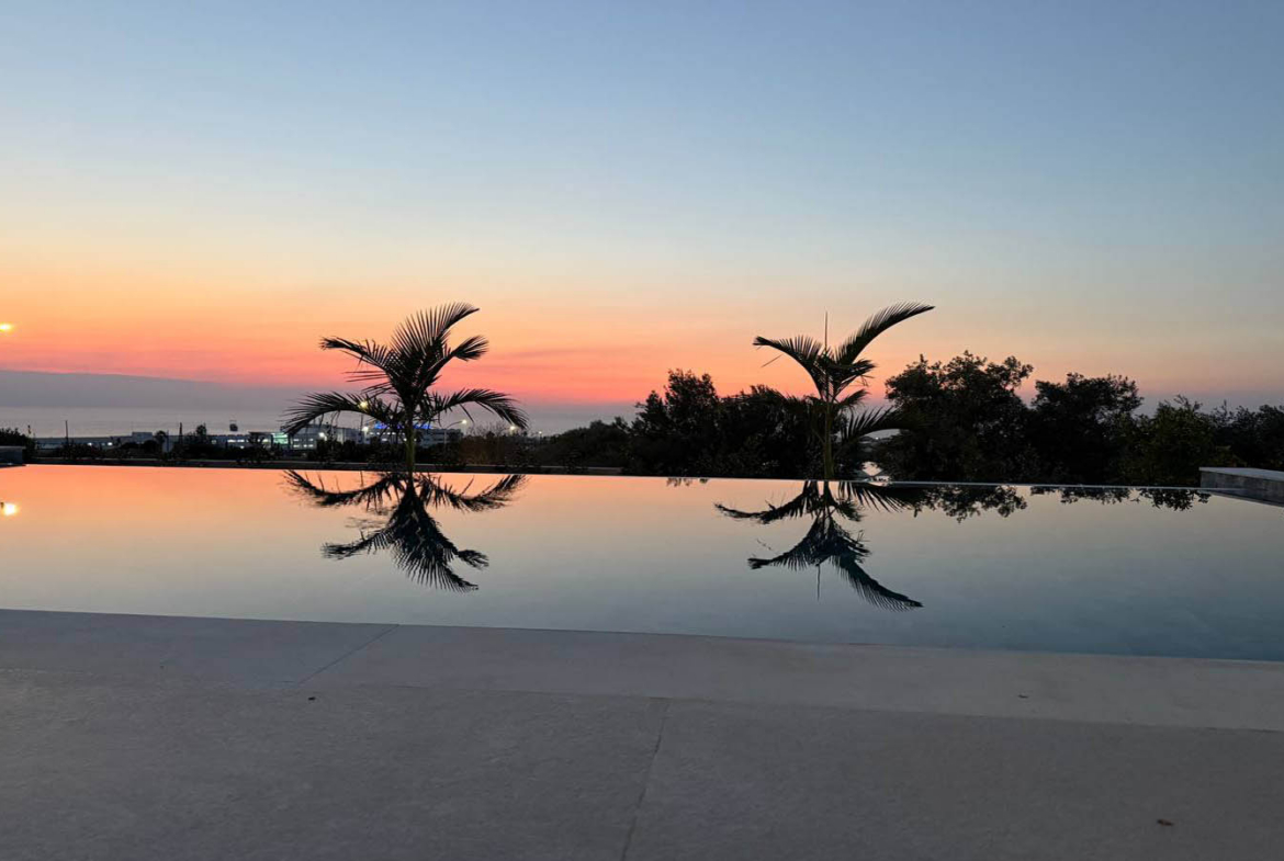 Large sliding doors erase the boundary between the house and the outdoor space. From the living room, the eye moves directly toward the pool, garden, and sea, and it seems as if the water outside becomes part of the interior. There is a special charm in this kind of Cypriot life: breakfast may begin at the kitchen island, continue with a cup of coffee on the terrace, and quietly turn into a lazy morning by the pool. In the evening, the same area becomes a peaceful place for dinner, rest, and conversation, when the glass reflects soft light and the line of the horizon grows darker beyond it.
