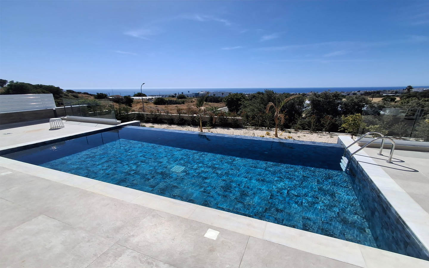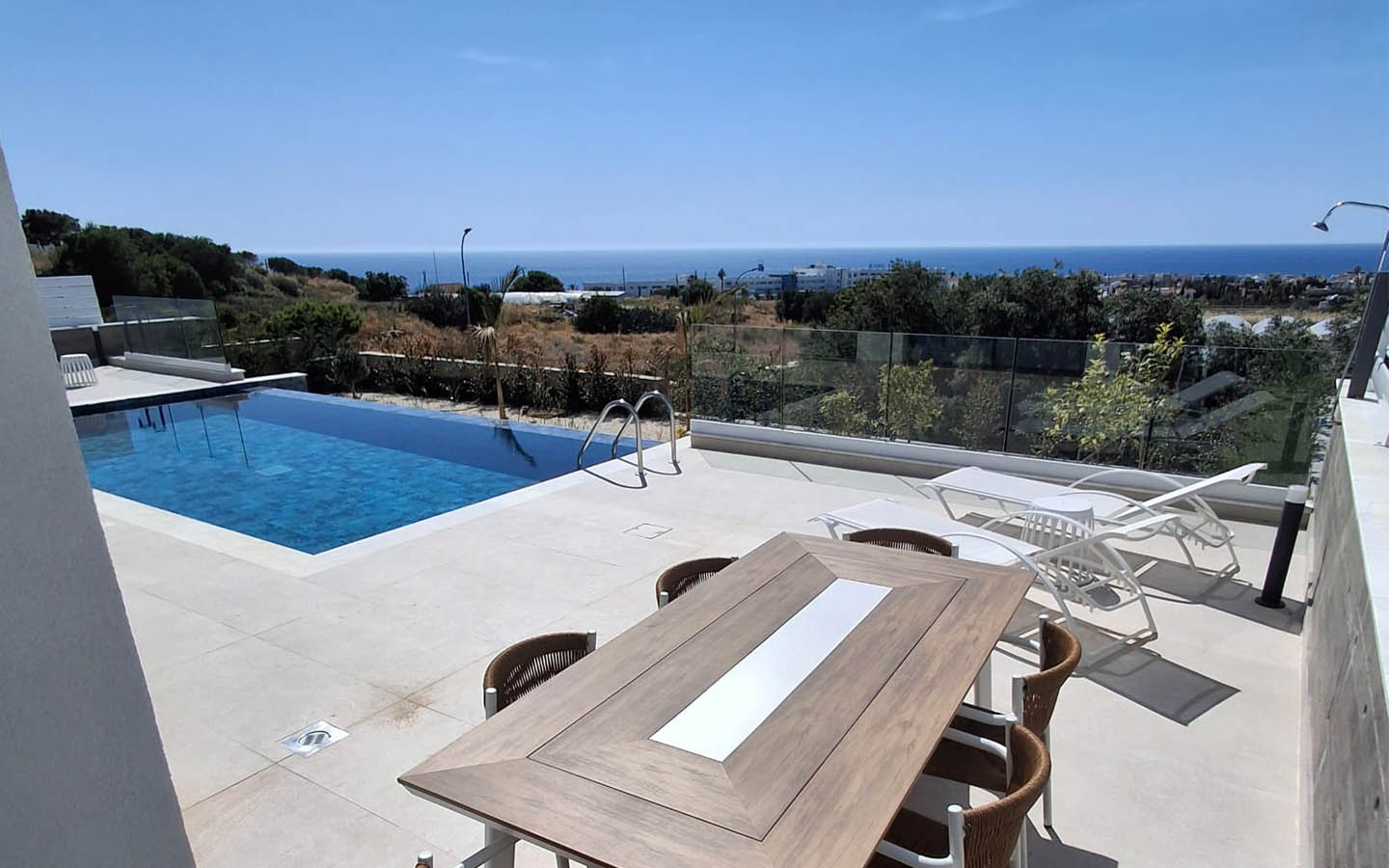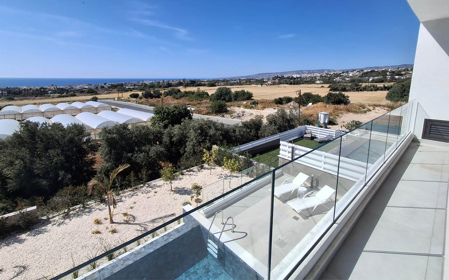 The private grounds are arranged in a modern, low-maintenance style. White gravel, neat young trees, green islands of lawn, small palms, and decorative planting emphasize the southern character of the plot without overloading the space. The private infinity pool is positioned to strengthen the feeling of openness, while the sun-lounger area and the covered part of the terrace allow you to choose between sun and shade throughout the day. This is not just a yard, but a full outdoor living zone for relaxation, entertaining guests, and quiet family evenings.