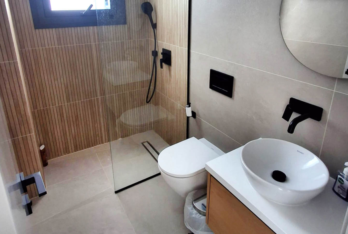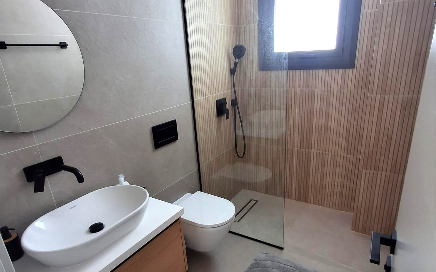 The bathrooms support the overall character of the home: modern, clean, practical, and carefully finished. Large tiles in calm shades, glass shower partitions, black sanitary fittings, round mirrors, and wooden accents in the furniture are used here. Thanks to these details, the space looks fresh, but not sterile. It keeps the same idea as the whole house: minimum excess, maximum convenience, light, and a feeling of thoughtful design.