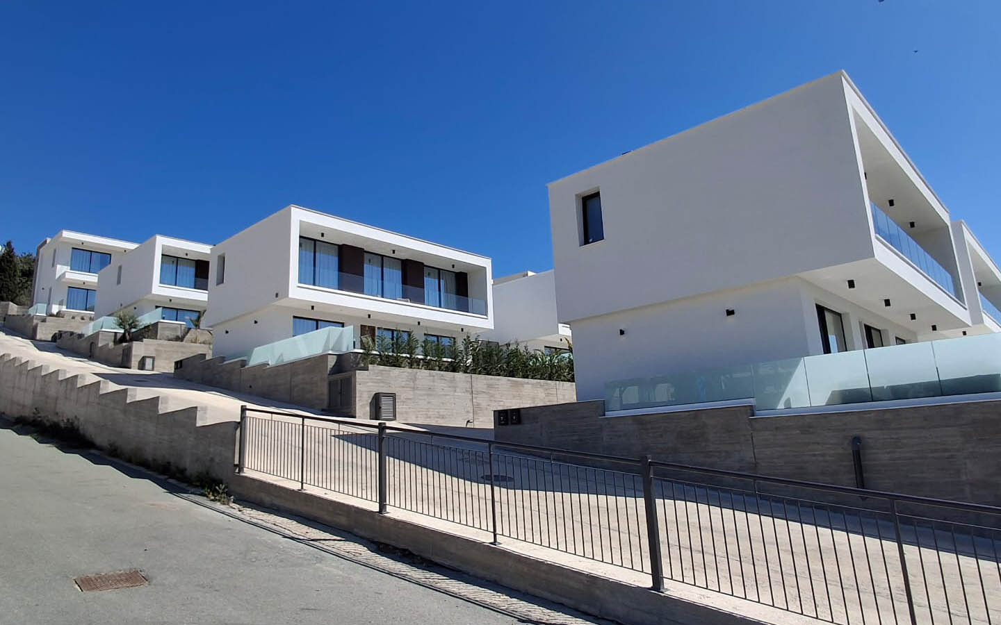 This home is arranged over two floors, and this layout makes it especially clear, practical, and convenient for everyday living. The exterior of the villa is designed in a modern Mediterranean style: snow-white geometric volumes, large glass openings, dark accent panels, transparent balcony railings, and textured grey retaining walls create a neat, fresh, and very confident architectural image. Against the deep blue sky, the house looks almost graphic, while the swimming pool by the façade adds lively, sunny energy to the entire composition.