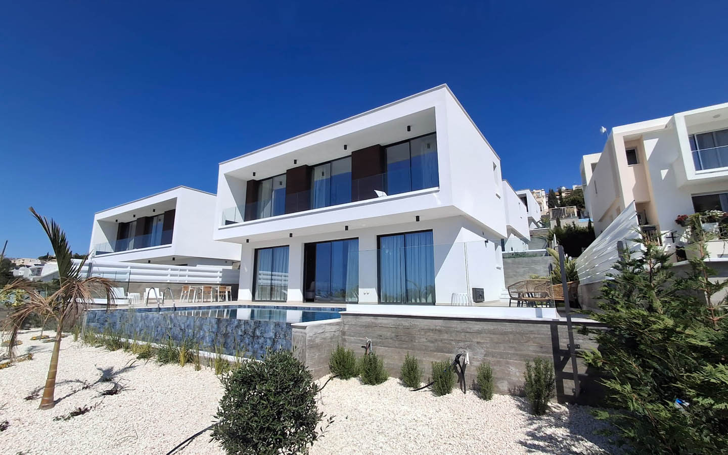 This villa seems to have been created for those who love the clarity of modern lines, open space, and that special feeling of lightness that appears in a home when water, garden, sea, and the wide Cypriot sky can be seen immediately behind the glass doors. Its beauty is built on the purity of form, balanced proportions, a calm colour palette, and the ability of architecture not to compete with the natural landscape, but to gently use it to its advantage.