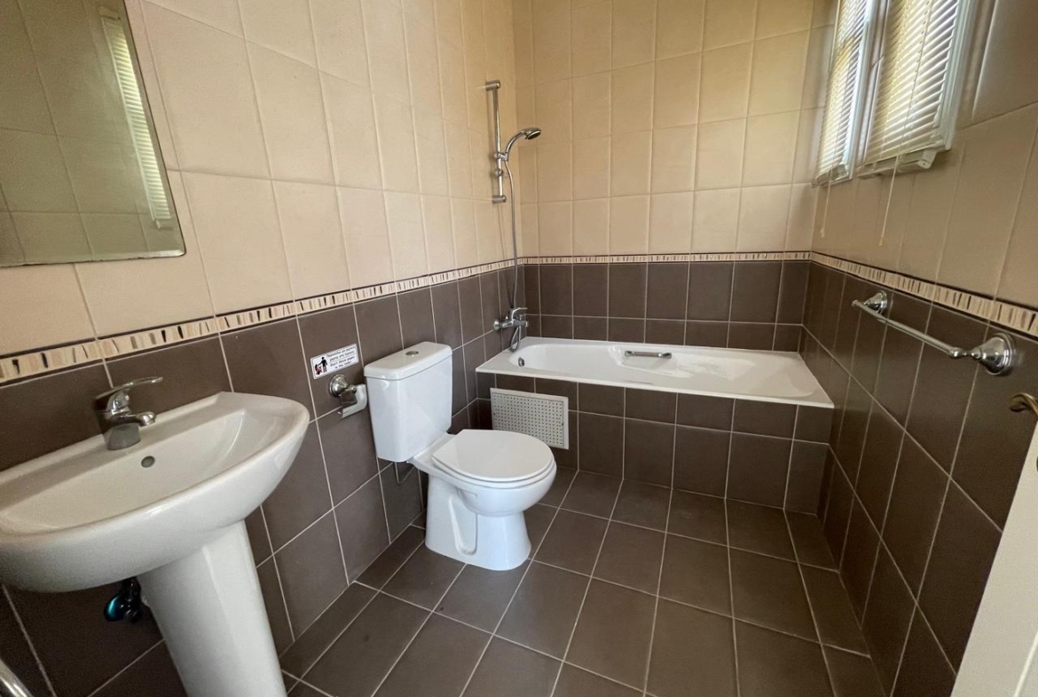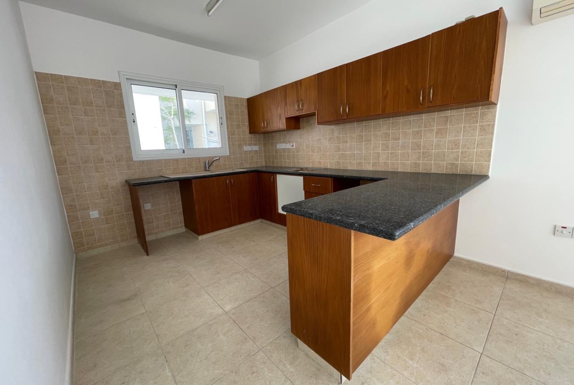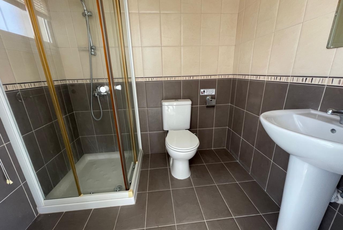 The kitchen is practical and honest: warm wood cabinets, a modest tiled backsplash, dark countertops, and a semi-island that works as a breakfast bar, prep space, or social hub. The house is fitted with air conditioning units, and hot water is heated by solar panels — a simple but crucial detail that makes life in Cyprus notably more pleasant. A guest toilet is thoughtfully included on the ground floor — a small feature that adds great comfort for both family and visitors.