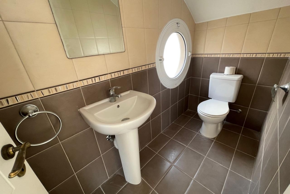 Upstairs is your private zone. Three bedrooms offer flexibility: the master has its own en-suite with a shower; the other two can be used for children, guests, or a home office. There’s a second full bathroom for the other rooms. Even in the details, the house shows character — a round porthole-style window in one of the bathrooms brings in extra light and charm, while the clean lines of the finishes keep the whole atmosphere fresh.