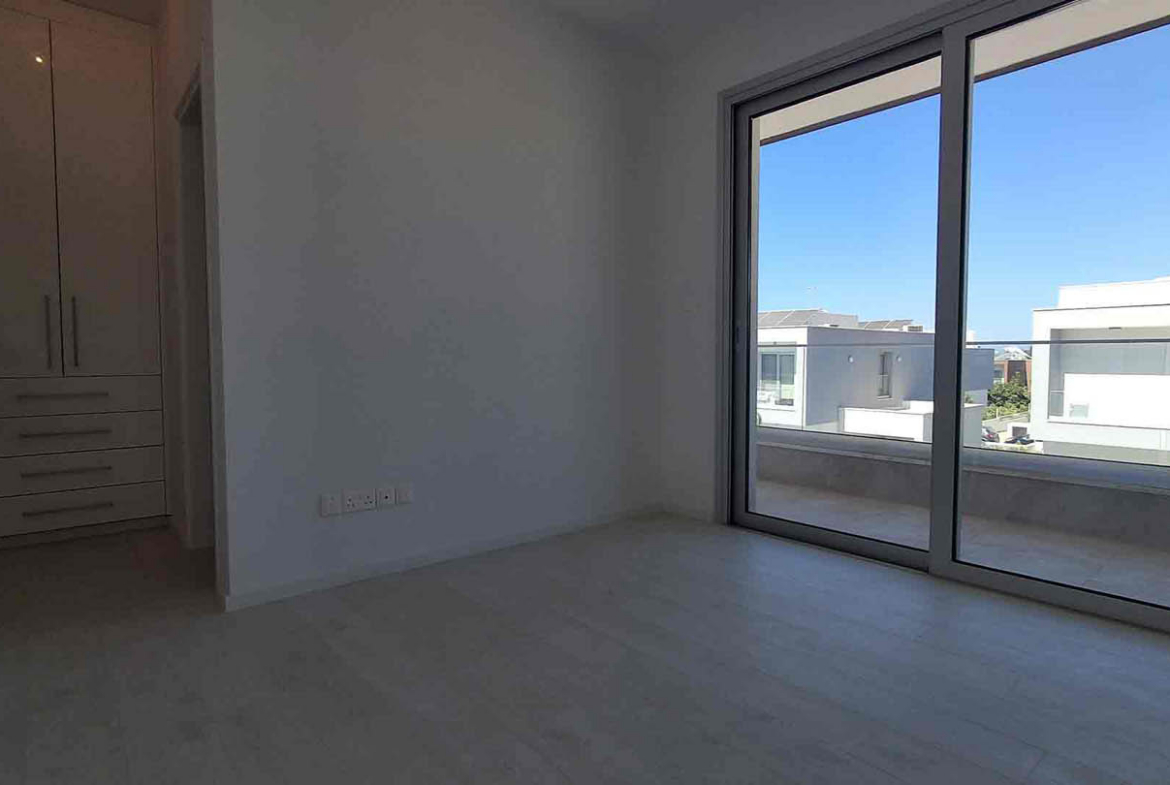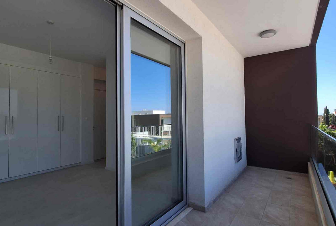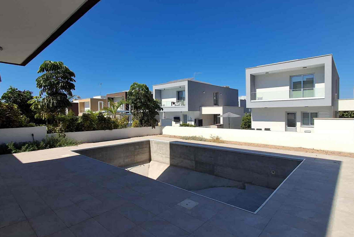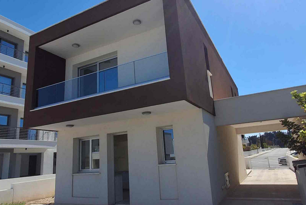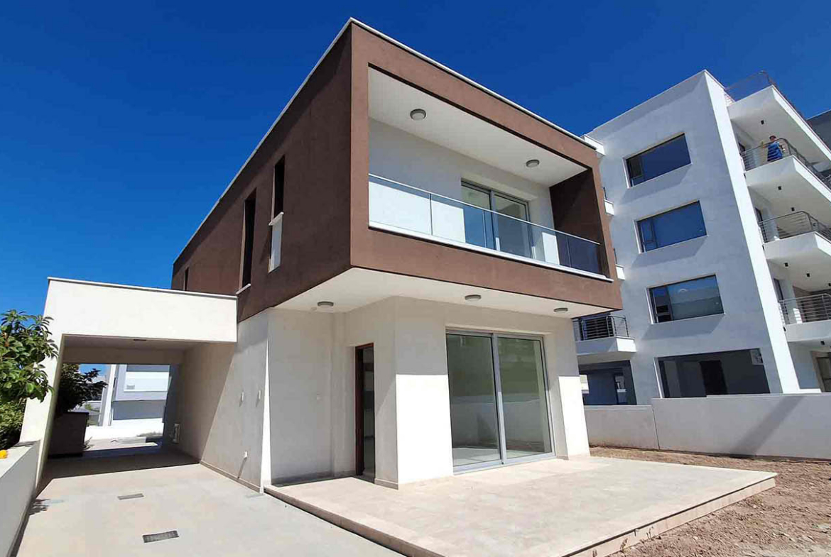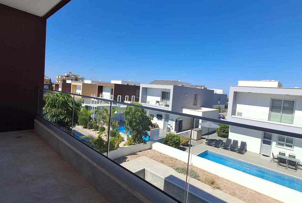 As you enter through the neat white gates, it becomes clear that the space here was designed with real everyday comfort in mind. Covered parking within the plot solves a practical need once and for all, while the paved courtyard flows naturally toward the private swimming pool — rectangular, elegant, and carefully positioned within the 333 m² plot so that there is still plenty of room around it for sun loungers, evenings with guests, or simply a quiet morning coffee while the whole neighbourhood is still asleep. The open-air pool sits beside a covered veranda — exactly the kind of place where you can step out of the midday sun without ever feeling cut off from the garden. From the balcony on the upper floor, there is a calm view across the surrounding complex with its pools and greenery — a living panorama of a modern Cypriot residential setting that never feels repetitive.