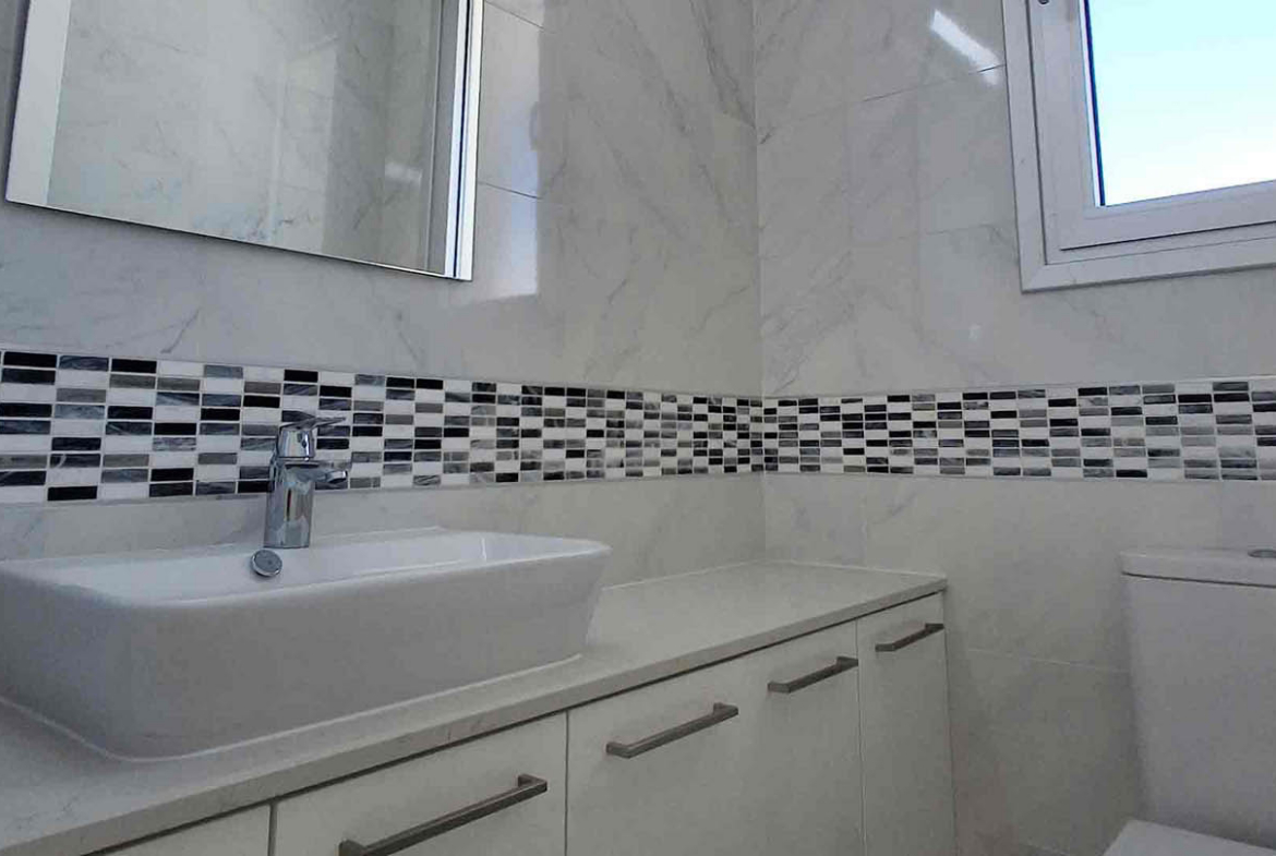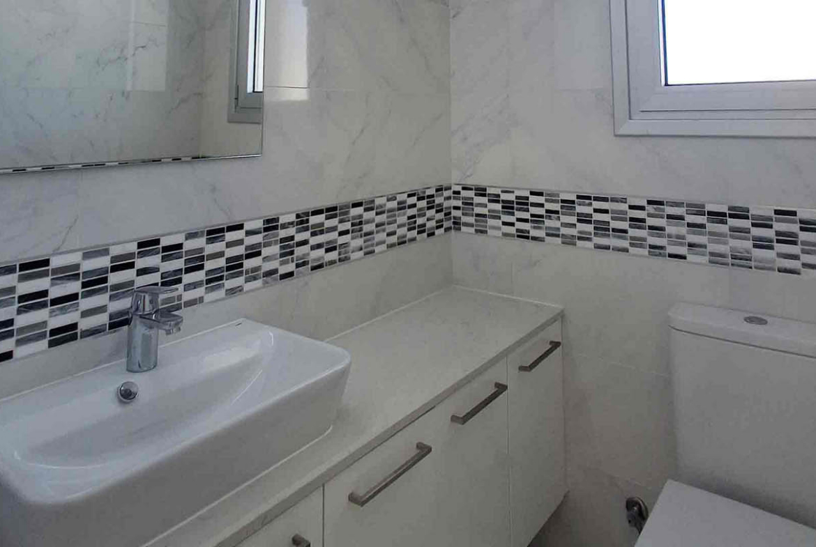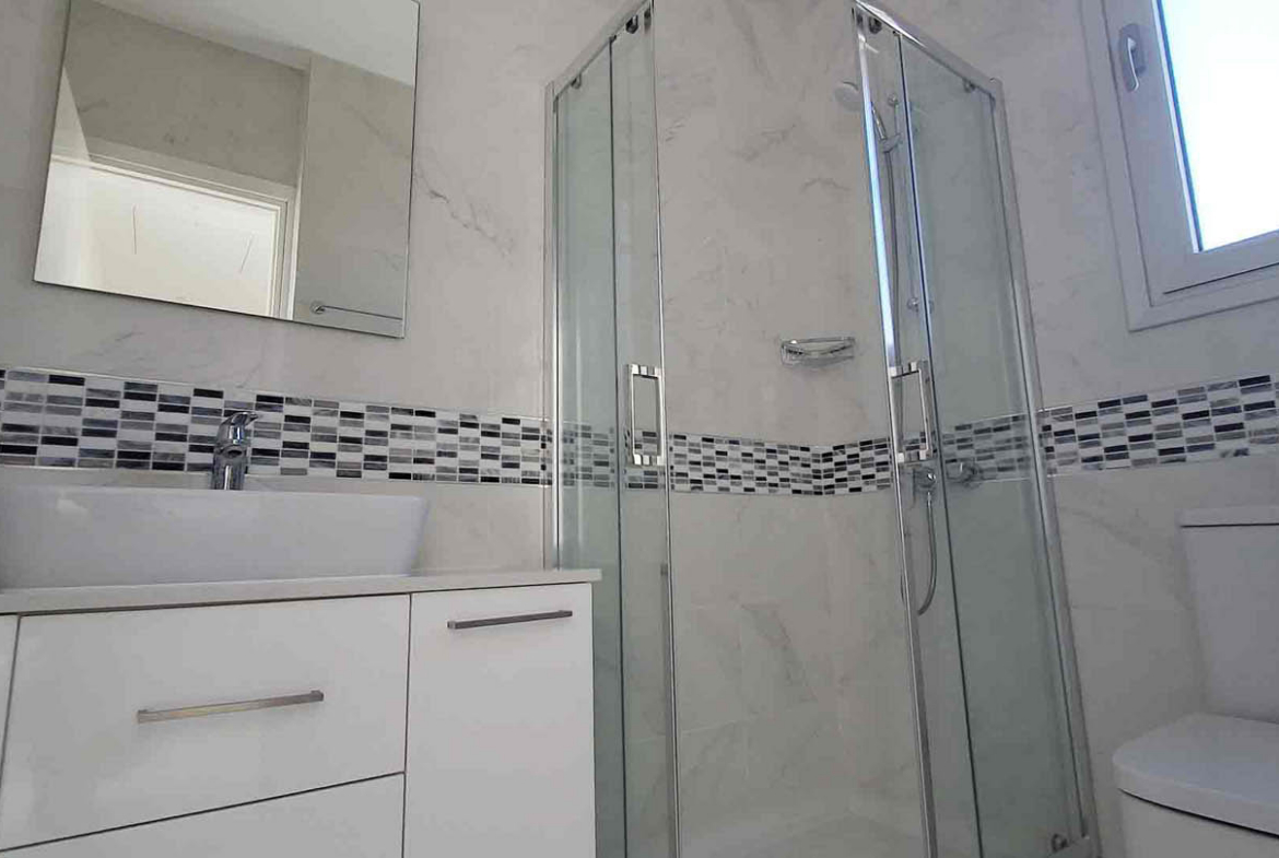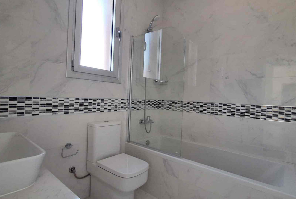Going upstairs means entering the more private side of the home. There are three bedrooms, each with well-planned storage, and three bathrooms in total, two of them being full bathrooms. The master bedroom, with its own en-suite bathroom, feels like a private world of its own, where mornings begin without haste. The bathrooms are finished in large-format white marble-effect tiles with delicate veining — restrained, elegant, and quietly confident. A mosaic border adds rhythm to the design and keeps the space from feeling cold. One bathroom includes a full bathtub with a shower area, while another features a corner shower enclosure with chrome fittings and a suspended vanity topped with a vessel sink. Everything is new, untouched, and ready to be lived in. The villa is offered unfurnished, which gives the future owner a rare chance to make this home entirely their own from the very beginning, without having to undo someone else’s choices.