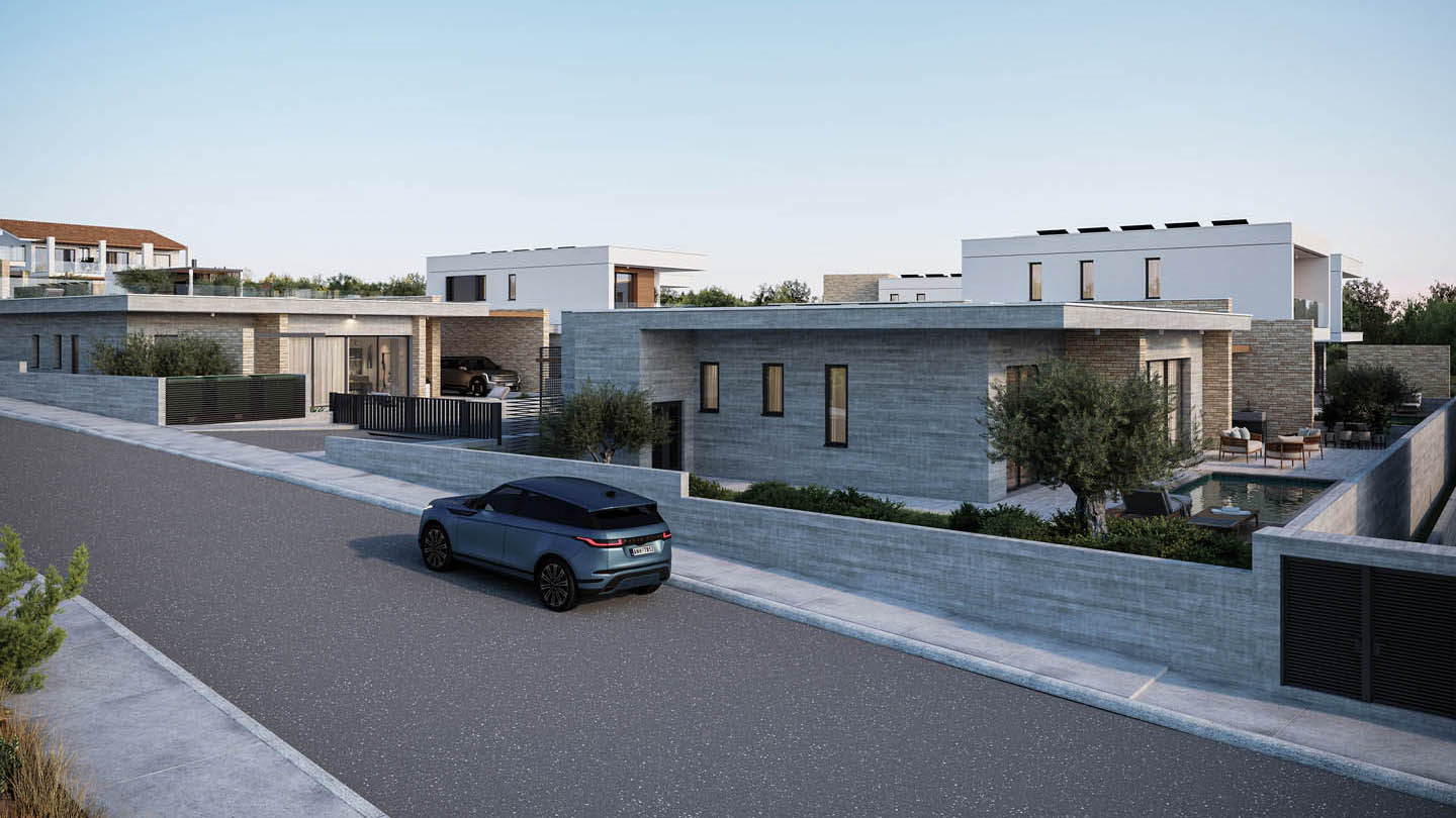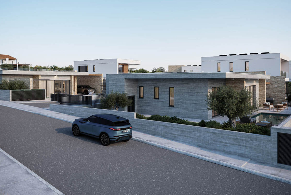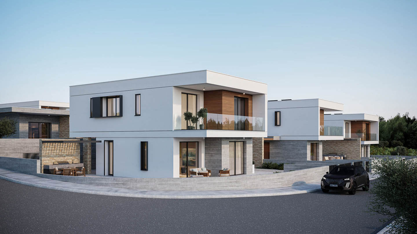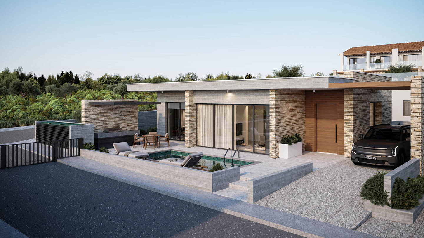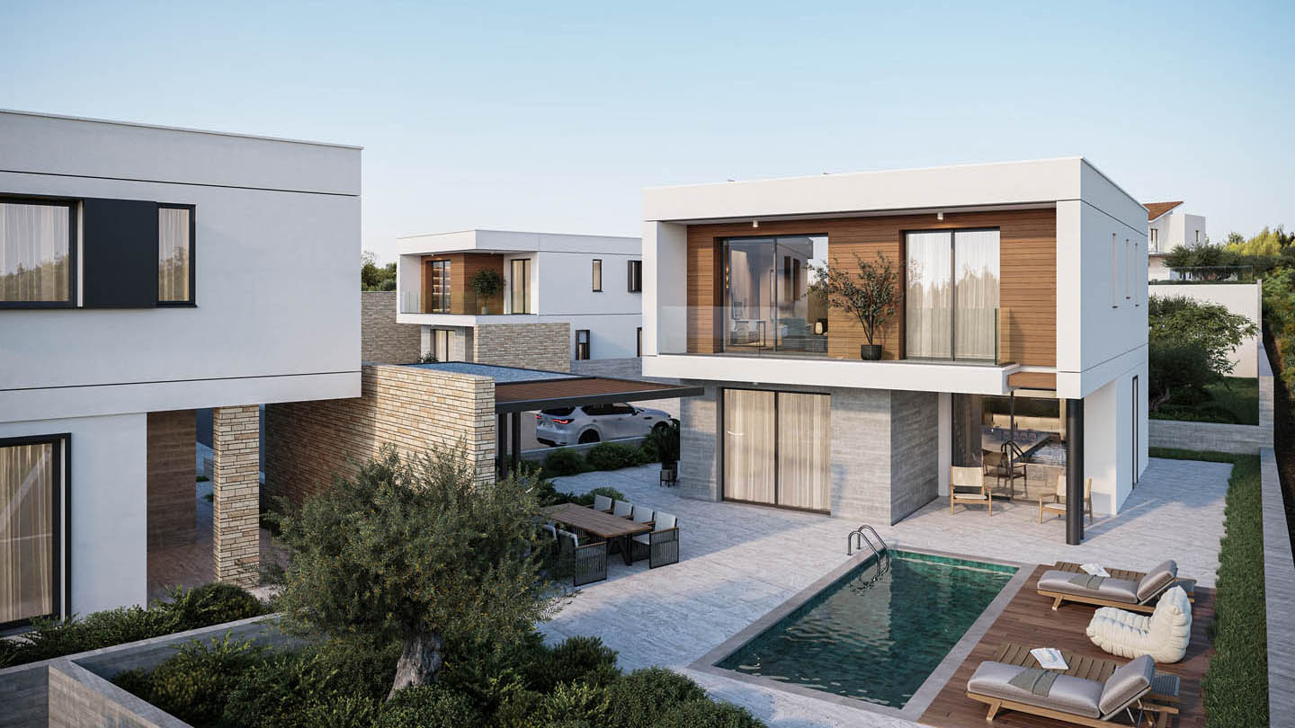 The development has been conceived as an intimate collection of contemporary villas set on generous private plots, where each home is perceived not simply as real estate, but as a personal space filled with calm, dignity, and aesthetic grace. The architectural identity of the villa is shaped by a noble contrast of textures: light-toned facades with clean lines are softened by the warmth of timber accents and the expressive character of natural stonework. Because of this, the home feels at once modern and timeless, as though it has always belonged among the Cypriot light, olive trees, and gentle natural shades.
