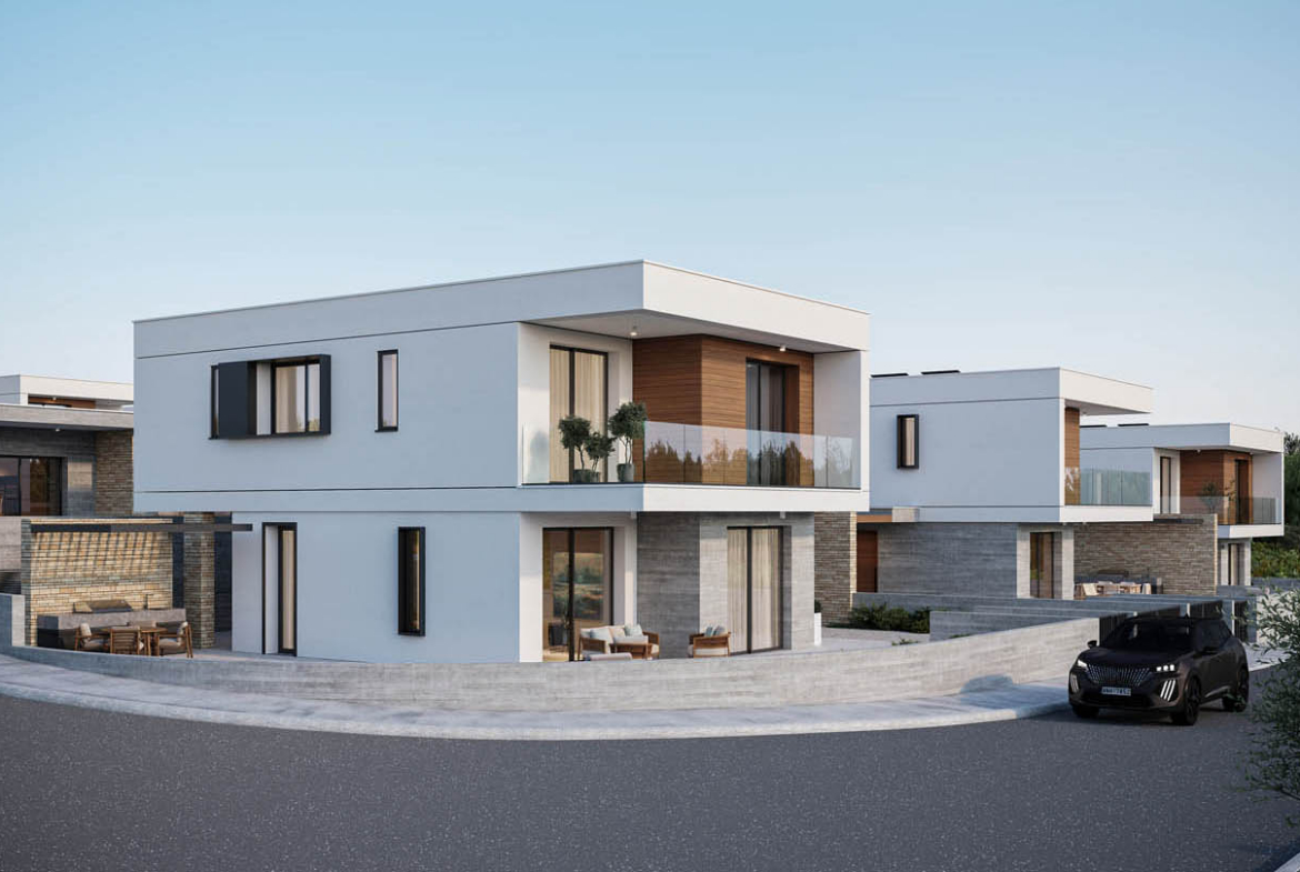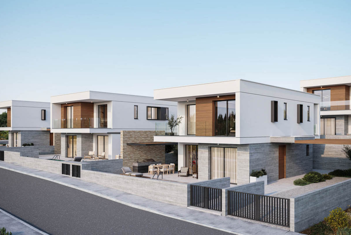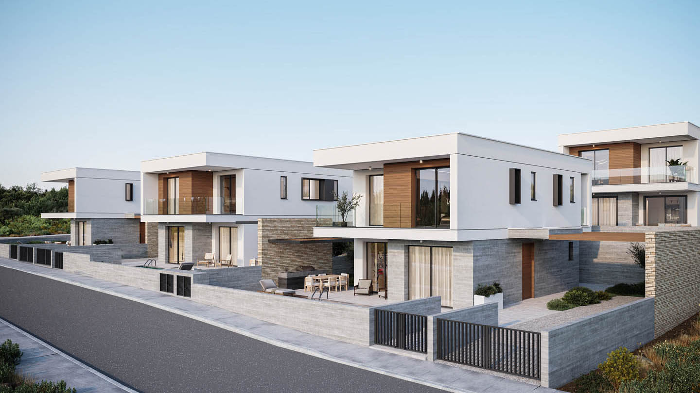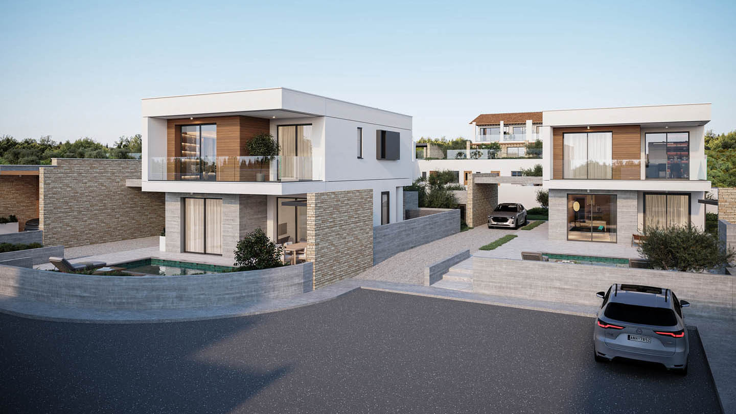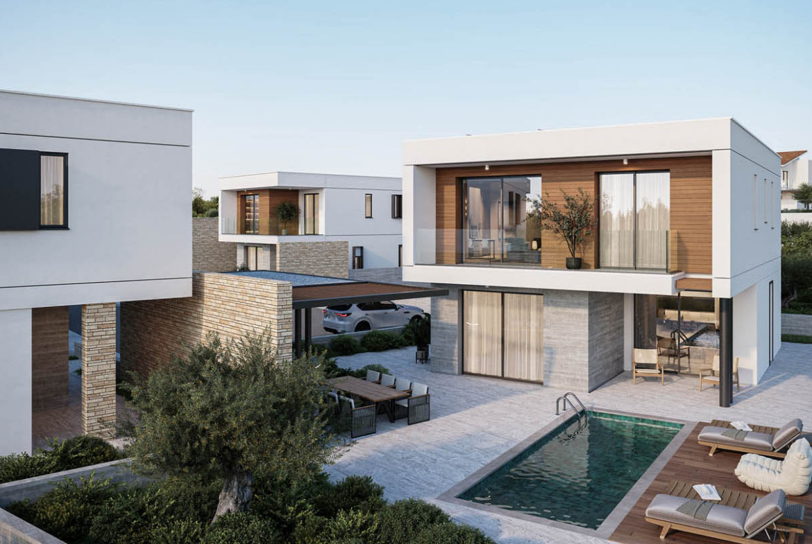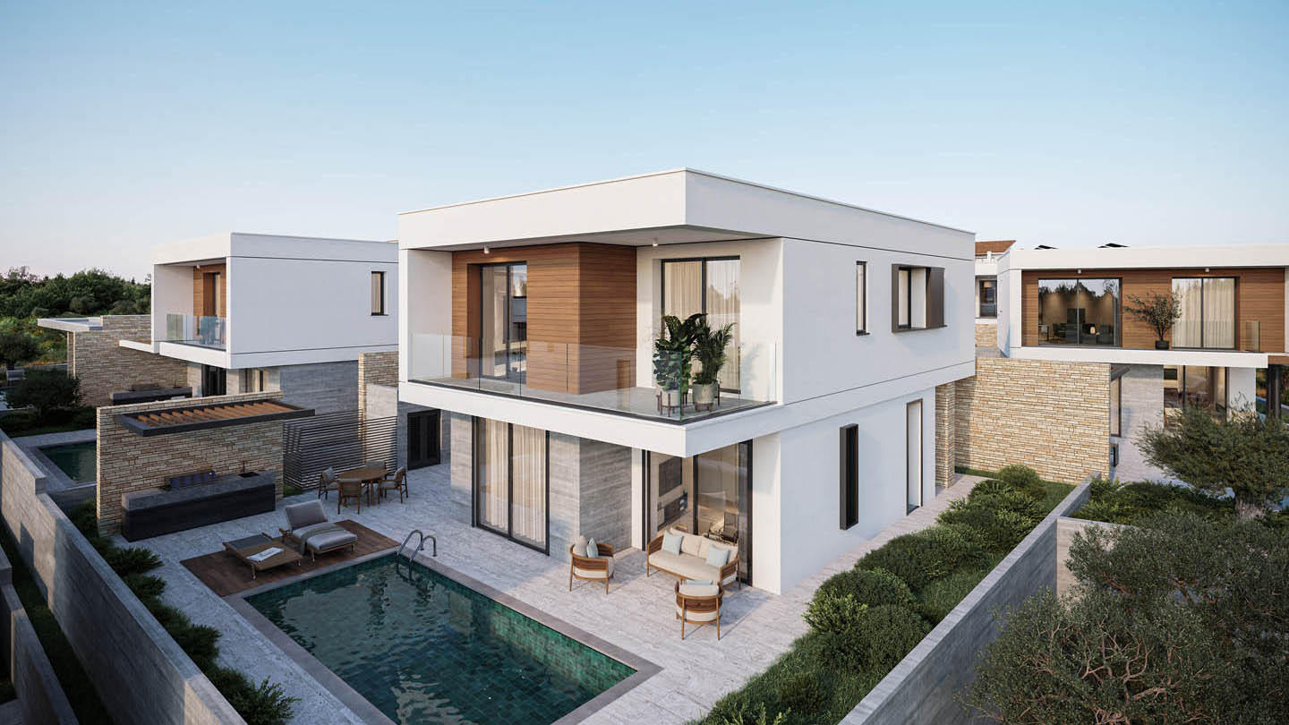 The development has been conceived as an intimate collection of contemporary villas set on generous private plots, where each home is perceived not simply as real estate, but as a personal space filled with calm, dignity, and aesthetic grace. The architectural identity of the villa is shaped by a noble contrast of textures: light-toned facades with clean lines are softened by the warmth of timber accents and the expressive character of natural stonework. Because of this, the home feels at once modern and timeless, as though it has always belonged among the Cypriot light, olive trees, and gentle natural shades.