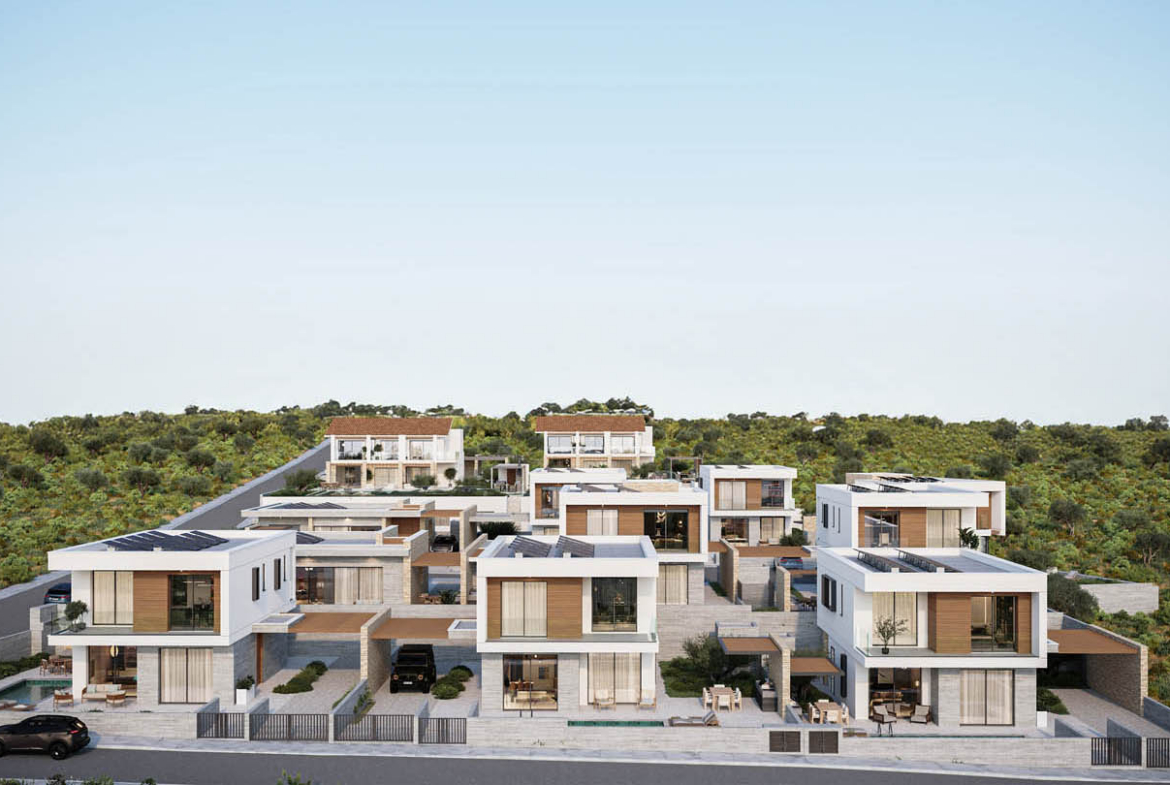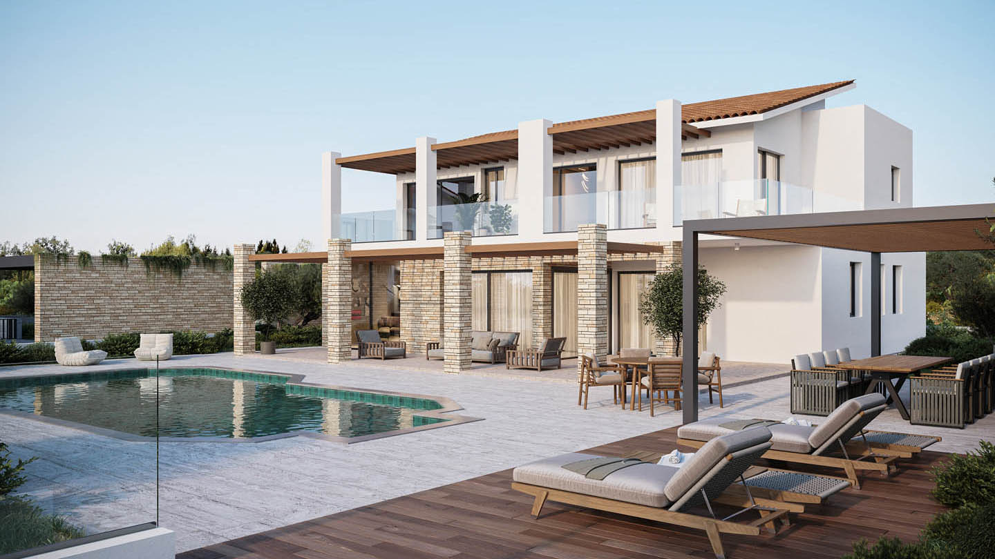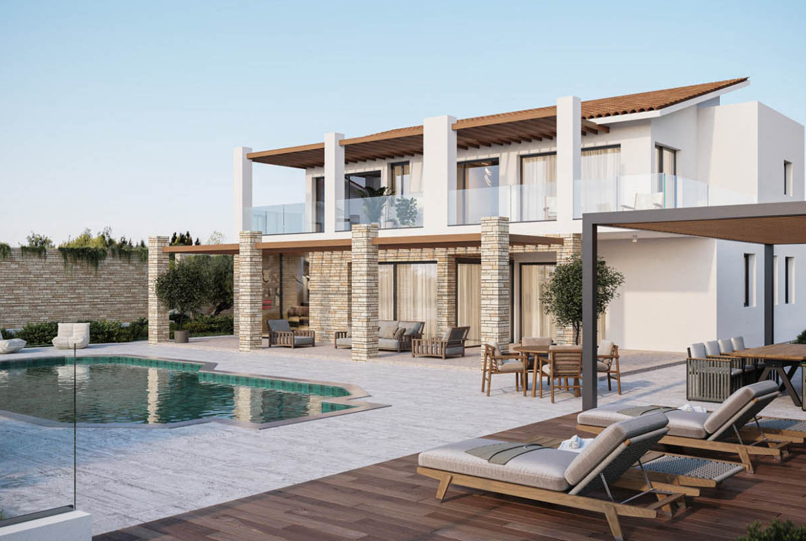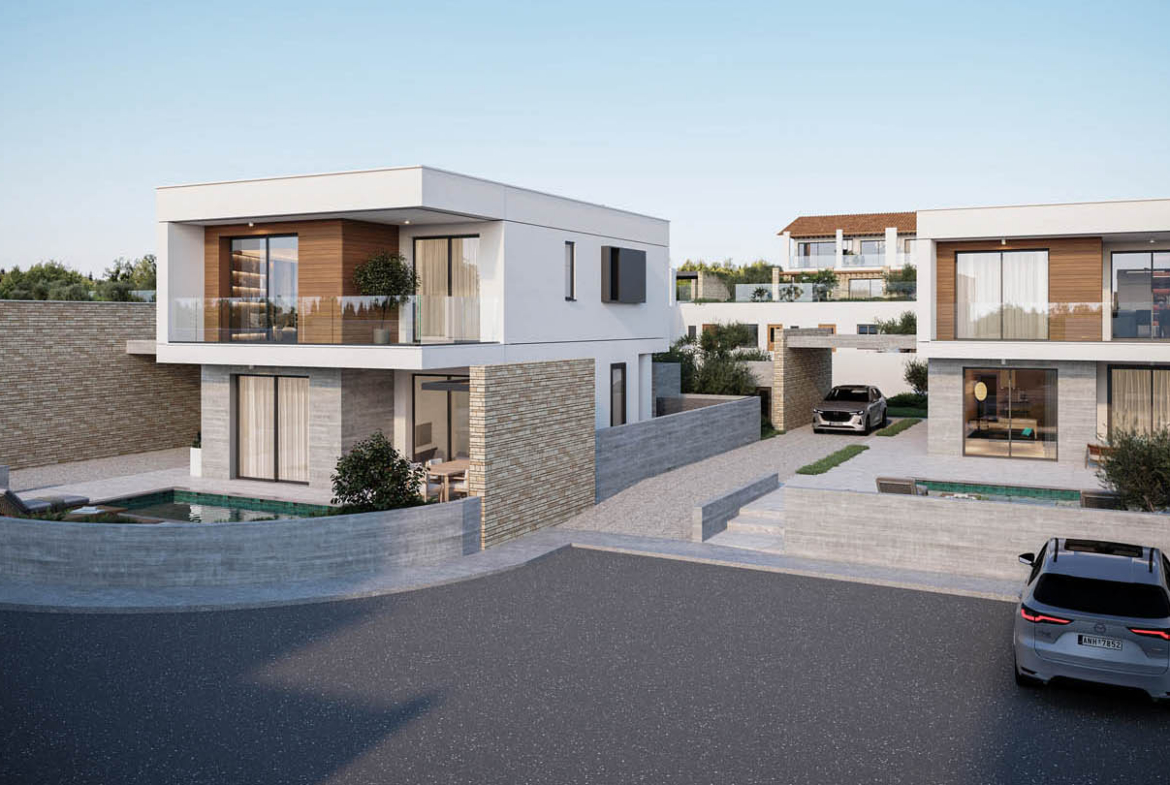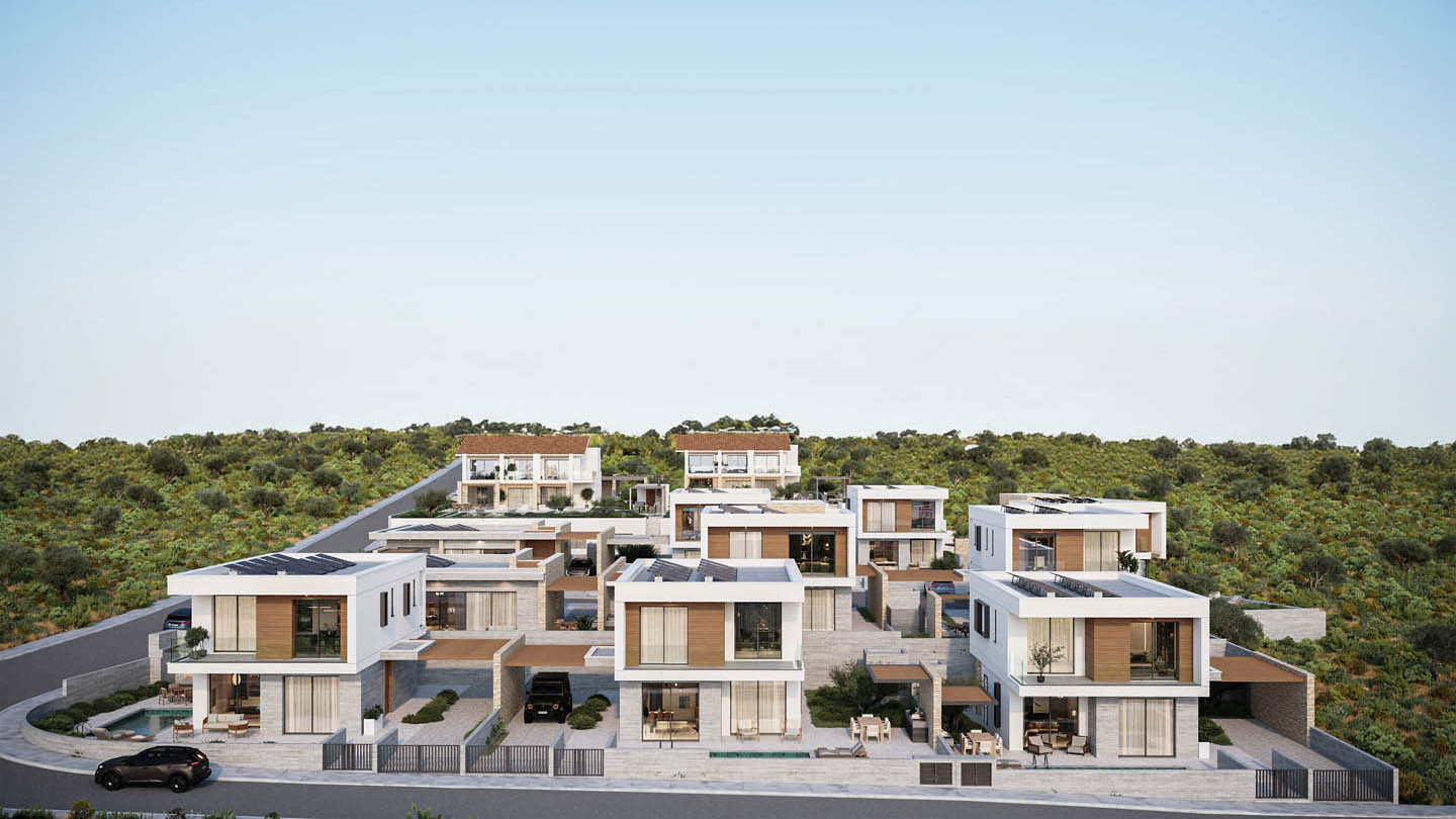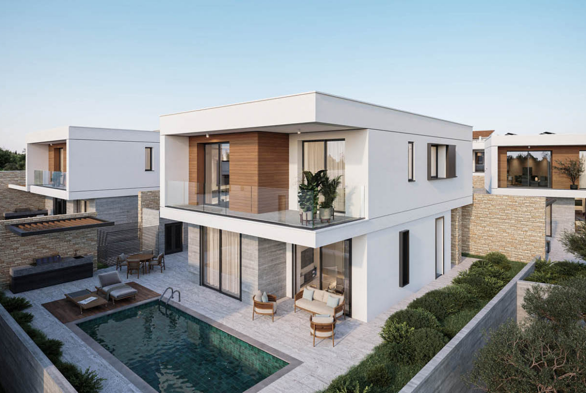 The development has been conceived as an intimate collection of contemporary villas set on generous private plots, where each home is perceived not simply as real estate, but as a personal space filled with calm, dignity, and aesthetic grace. The architectural identity of the villa is shaped by a noble contrast of textures: light-toned facades with clean lines are softened by the warmth of timber accents and the expressive character of natural stonework. Because of this, the home feels at once modern and timeless, as though it has always belonged among the Cypriot light, olive trees, and gentle natural shades.