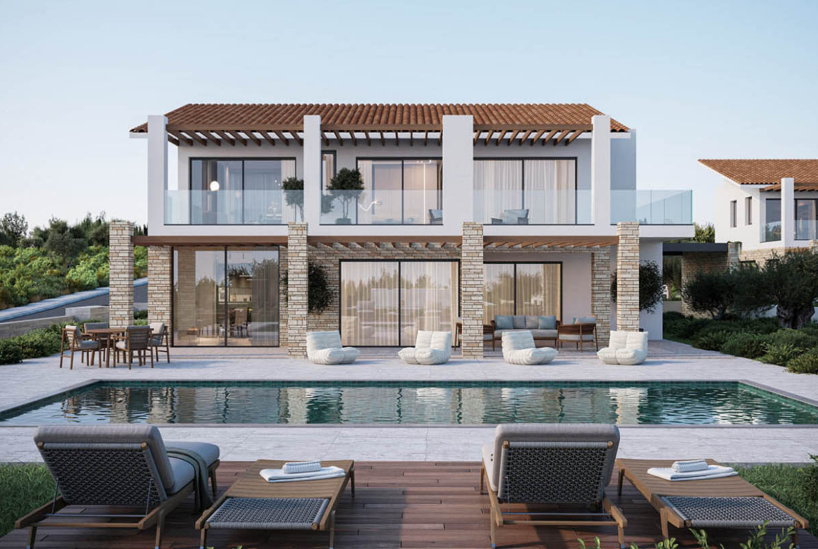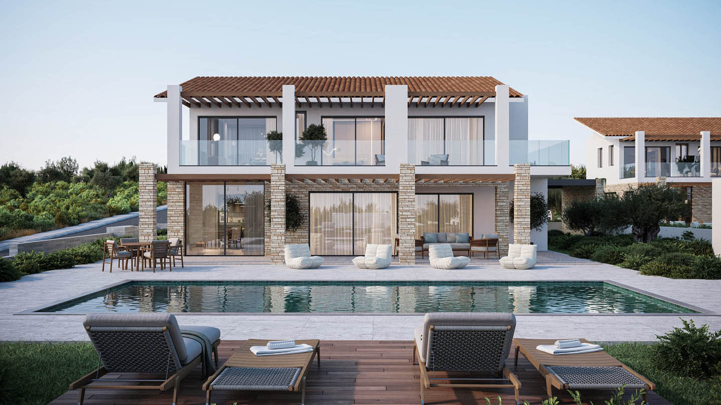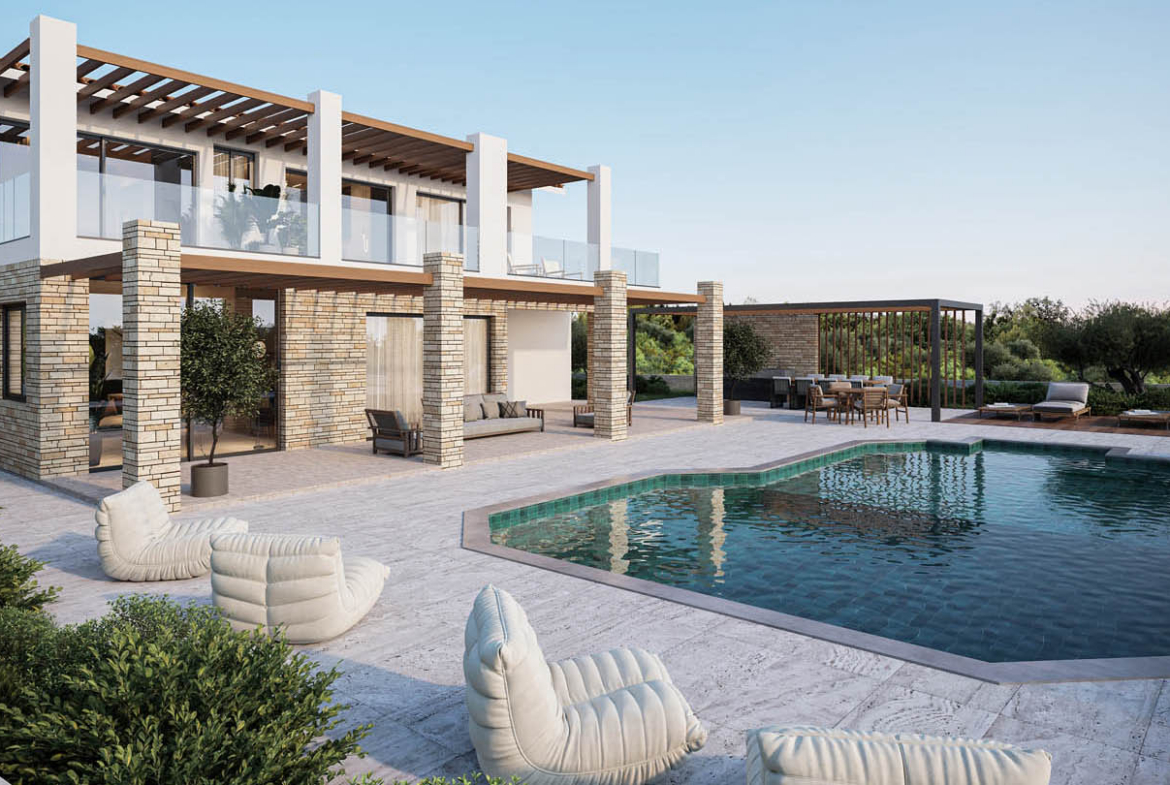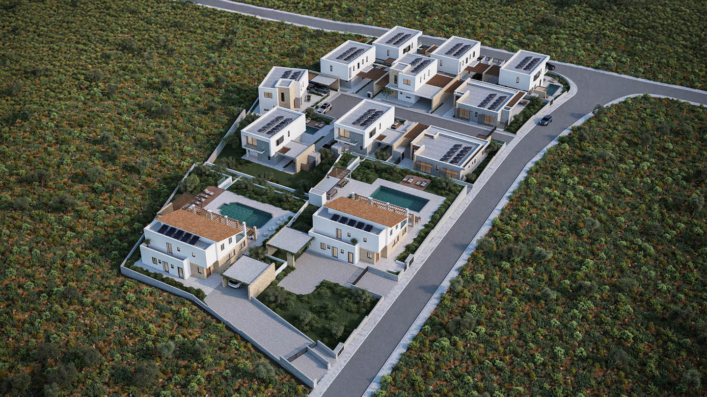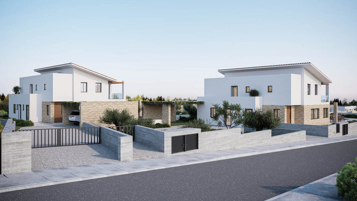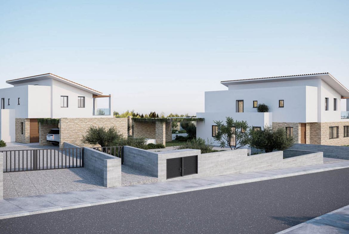 The development has been conceived as an intimate collection of contemporary villas set on generous private plots, where each home is perceived not simply as real estate, but as a personal space filled with calm, dignity, and aesthetic grace. The architectural identity of the villa is shaped by a noble contrast of textures: light-toned facades with clean lines are softened by the warmth of timber accents and the expressive character of natural stonework. Because of this, the home feels at once modern and timeless, as though it has always belonged among the Cypriot light, olive trees, and gentle natural shades.