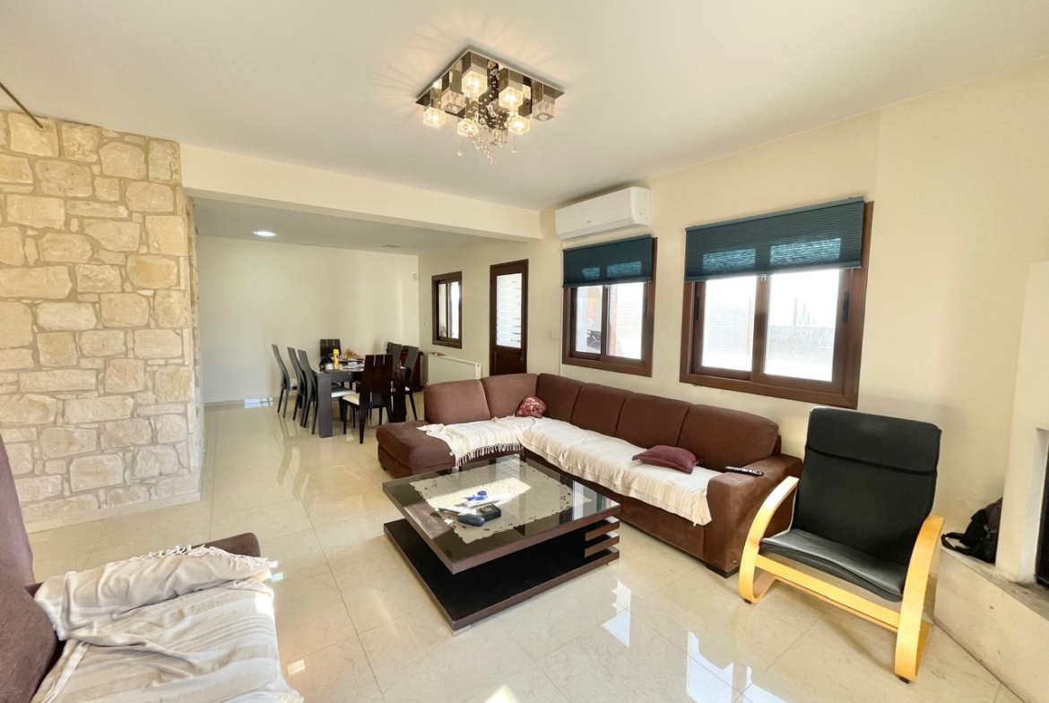 The dining area is spacious, anchored by a large table that effortlessly gathers people together. From here, the living room with a fireplace opens naturally—an inviting focal point for winter evenings, when Polemi’s gentle warmth at home is especially treasured. The second lounge is more “salon-like”: bright, airy, and framed by wide sliding doors leading out to the terrace. A white corner sofa, glossy floors, and calm neutral walls create a sense of openness and clarity—like a home where light and order are truly valued. This is exactly the place for family movie nights, for welcoming friends, or for simply opening the doors to the courtyard and letting fresh air and village stillness drift indoors.