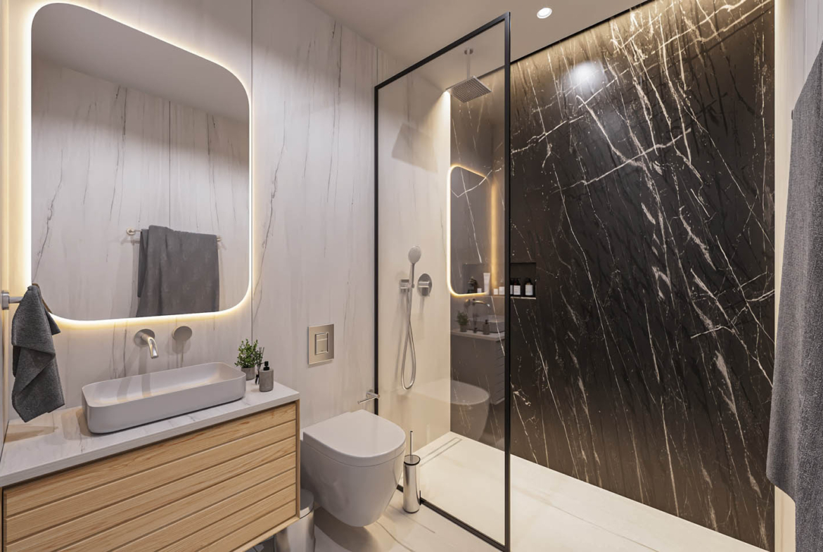 Bathrooms evoke a boutique hotel feel with bold marble accents, soft lighting, and premium fixtures by GROHE. The home is equipped with water-based underfloor heating, concealed VRV air conditioning, a video intercom system, and alarm. Provision for electric vehicle charging is also included.