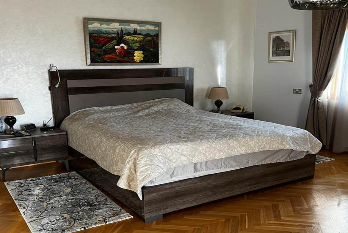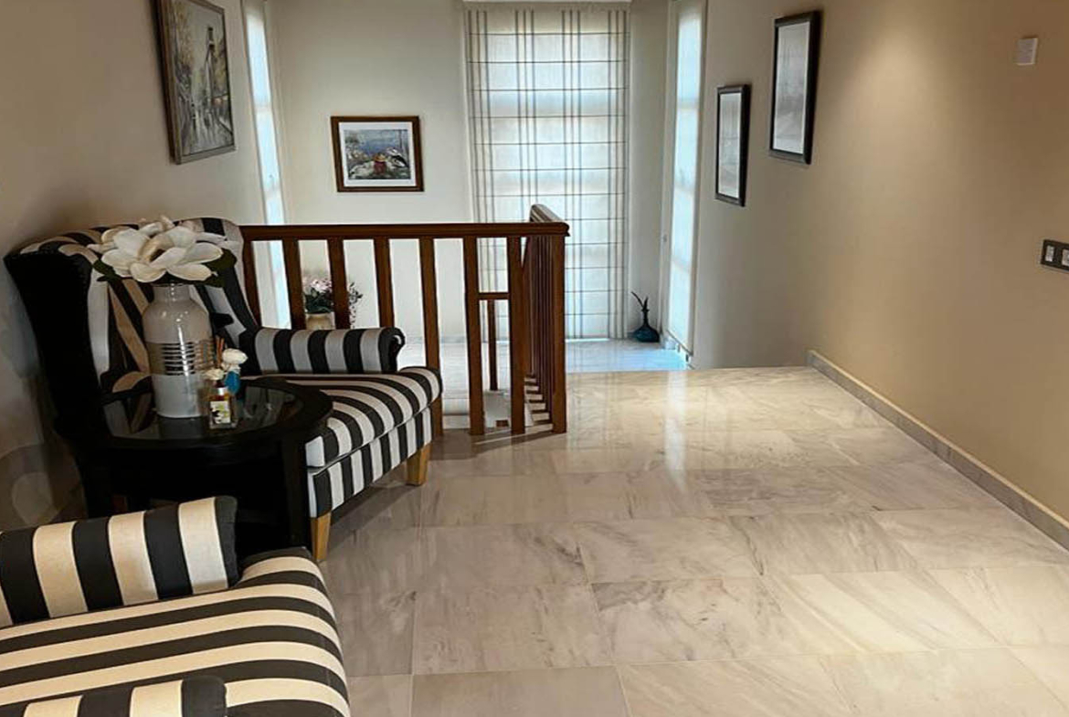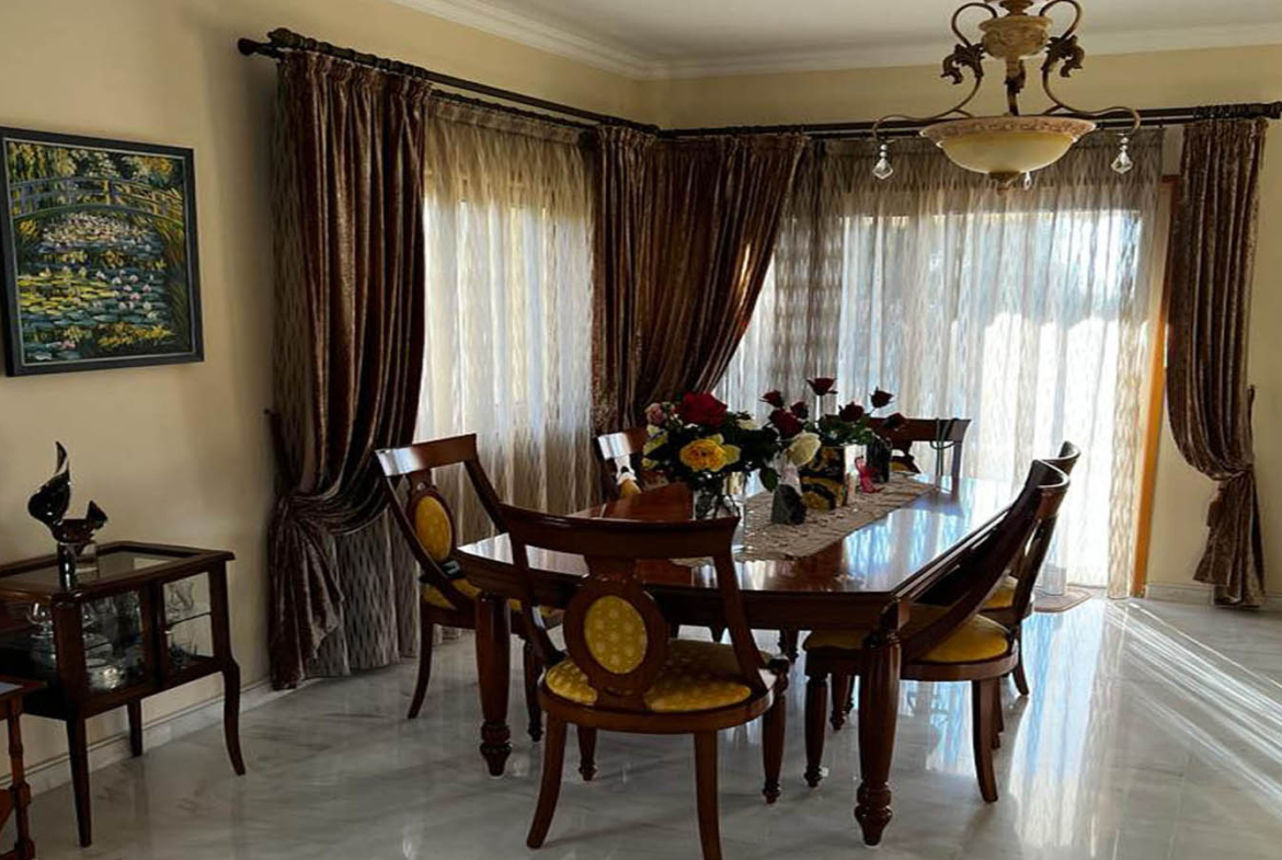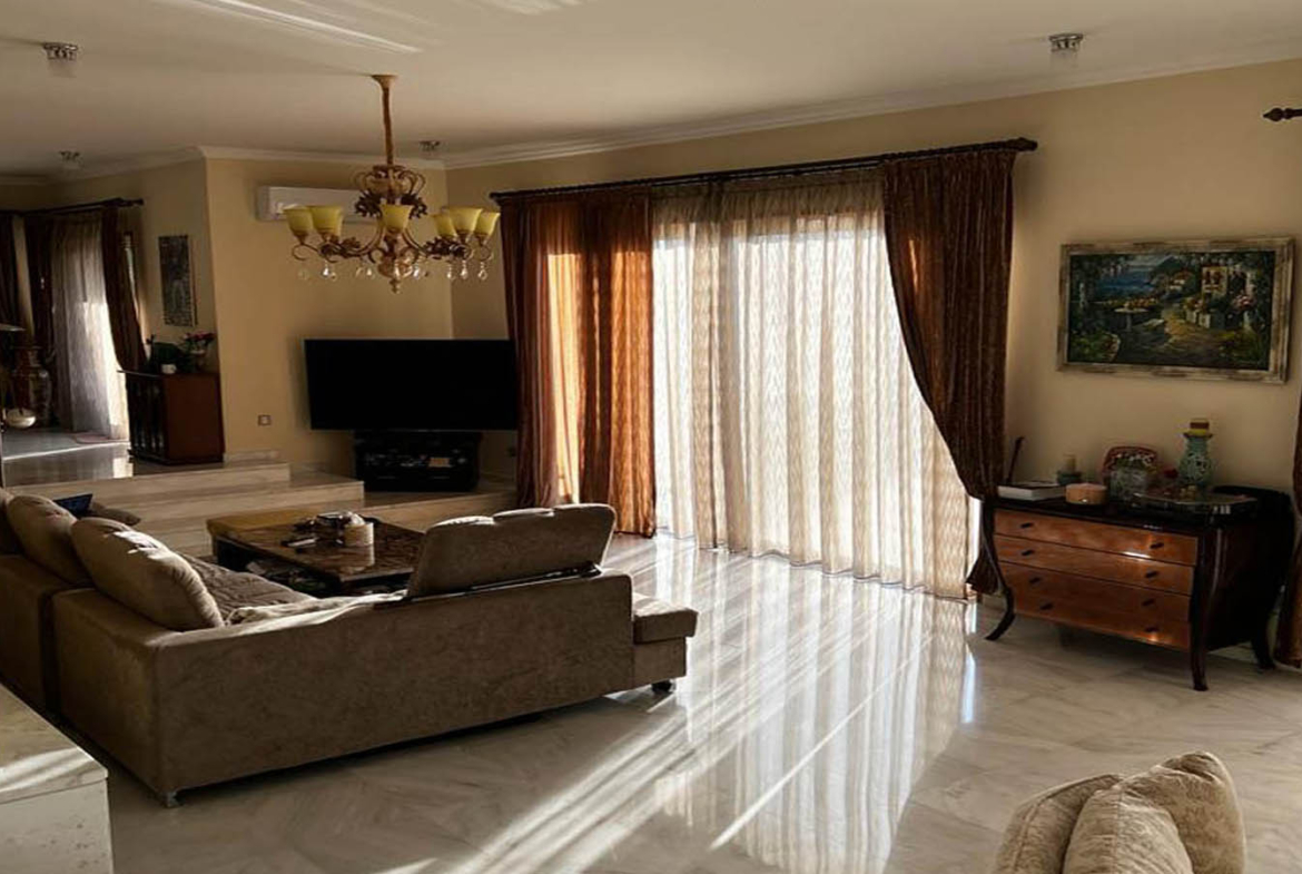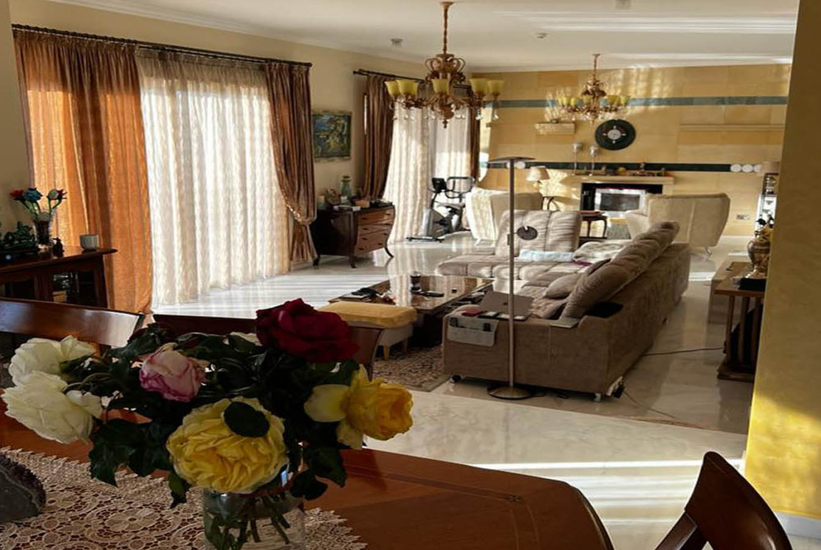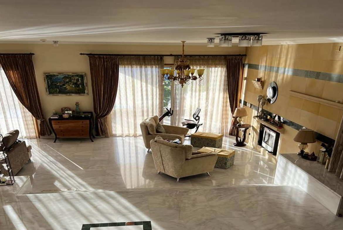 Inside, the villa greets you with something rare in large homes: a feeling of readiness. Nothing needs imagining, fixing, or “bringing up to standard.” The ground floor is bright, spacious, and finished in light marble that reflects daylight and visually expands the rooms even further. The living area feels layered and thoughtful—there’s room for hosting, and there’s a more intimate corner centered around the fireplace. In winter, it becomes the heart of the home: the soft hush of evening, a warm throw, and the steady comfort of real flame. The interior palette is warm and mature, with expressive chandeliers, rich curtains, classic furnishings, and elegant wall paneling that gives the room a salon-like character—sophisticated, welcoming, and lived-in, without any theatrical excess.