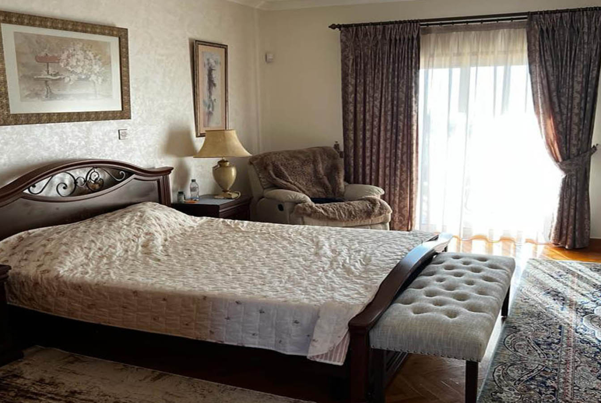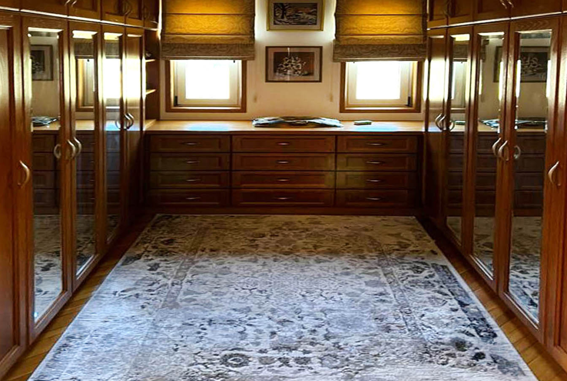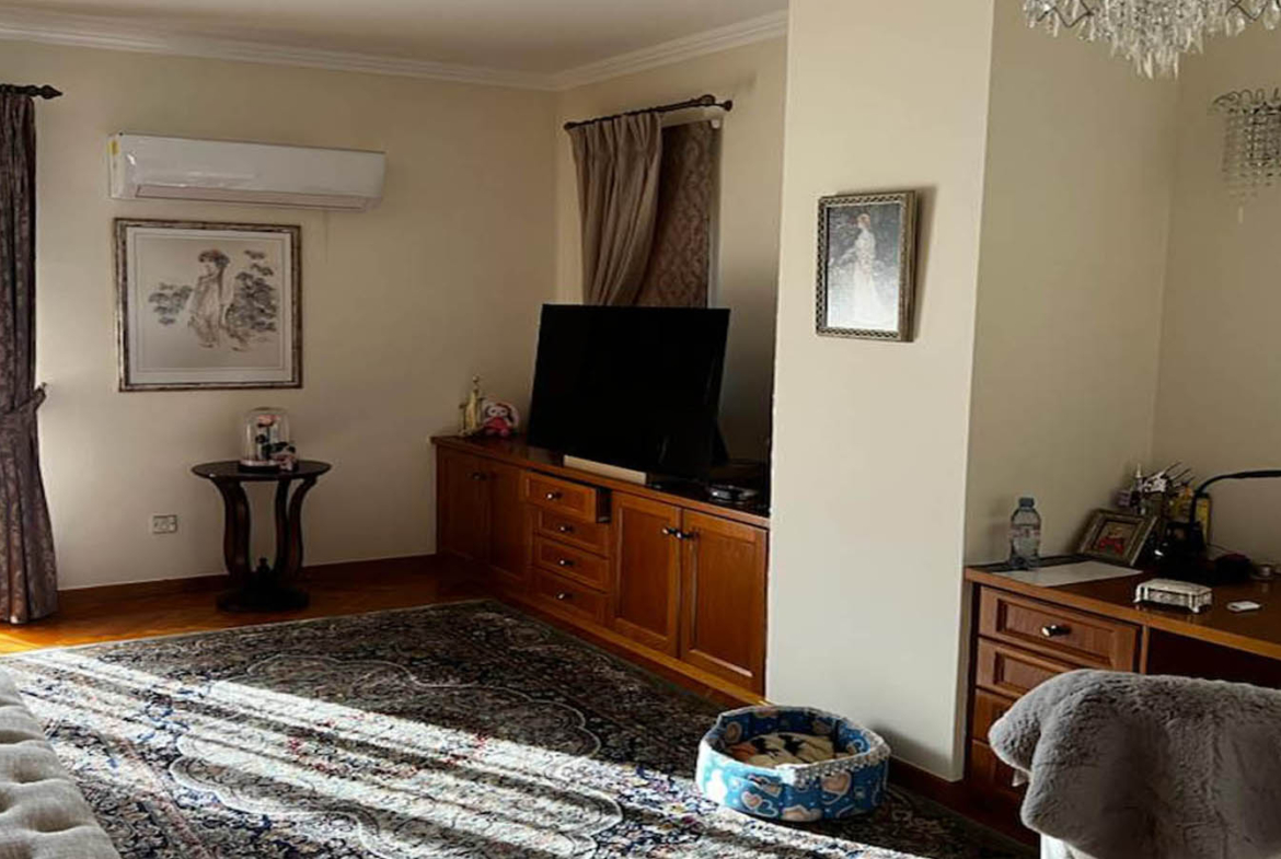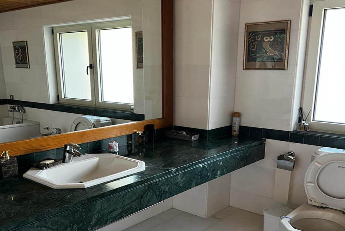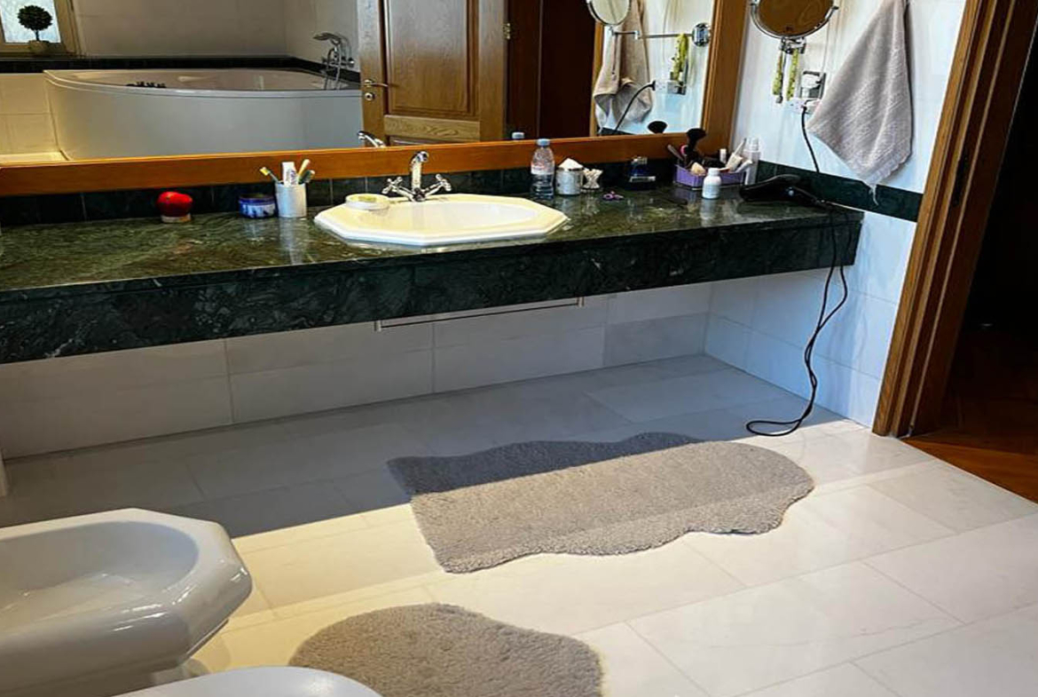 The bedrooms are private and comfortable, while the master suite feels like a personal retreat: generous proportions, access to a large balcony with seating space, and those views that gently remind you, again and again, that you live in Paphos—between sea and mountains. The en-suite bathroom supports that “private resort” mood with a jacuzzi, a long stone-topped vanity in a deep, elegant shade, and clean, well-kept finishes. The walk-in wardrobe is a room of its own—wood and mirrored elements creating a boutique-like feel where mornings start without rush.