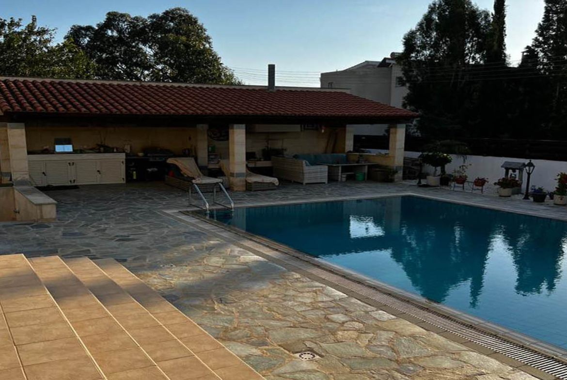 One of the home’s standout features is the covered BBQ area under a terracotta roof—less a “grill corner,” more a true outdoor living room designed for Cyprus life. There is generous shade, plenty of room for a long dining table, comfortable lounge seating, and that easy openness where family and friends can spread out without ever feeling cramped. It’s the kind of space made for weekend gatherings, for birthdays, for simple meals that turn into long evenings—effortlessly.