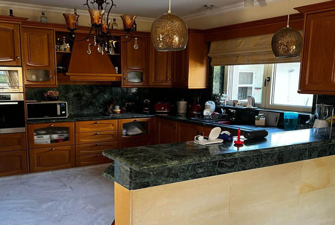 This villa in Konia is set on a generous 1,510 m² plot, it feels grounded and confident, as if it was built to hold family life with ease: morning routines, long lunches, evenings that stretch by the pool, and winter nights drawn in close around the fireplace. Warm stone tones, a terracotta-tiled roof, and clean two-storey lines give the property a timeless, refined presence—elegant without trying too hard.