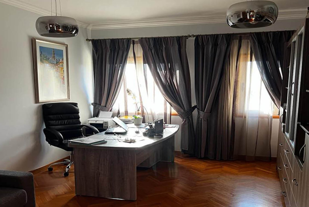 Upstairs, the home continues to impress with its scale. The staircase with wooden balustrade leads to a wide landing that feels like a space in its own right rather than a corridor—somewhere you naturally pause, breathe, and take in the calm. One of the rooms has been reimagined as a dedicated office: parquet flooring, a generous desk, tidy storage, and soft daylight from the windows. It’s a true work-from-home solution—close the door, focus fully, and keep the rest of the house restful and undisturbed.