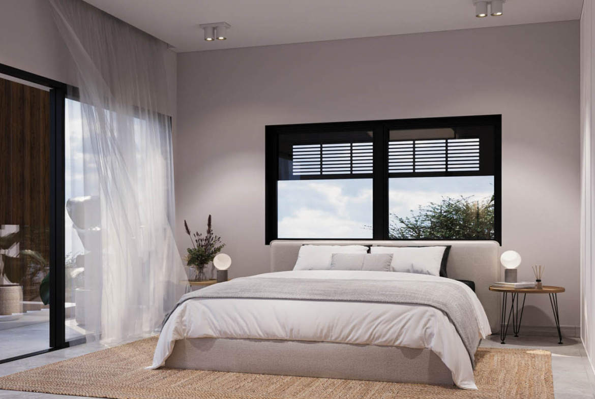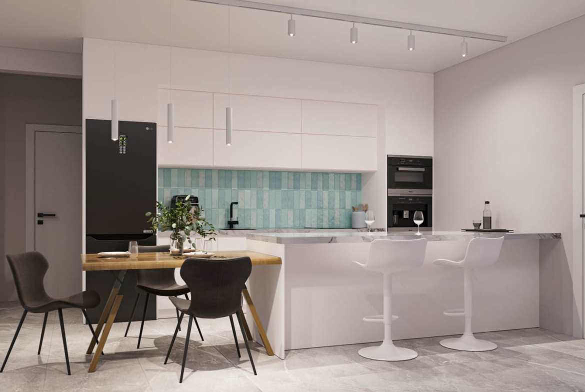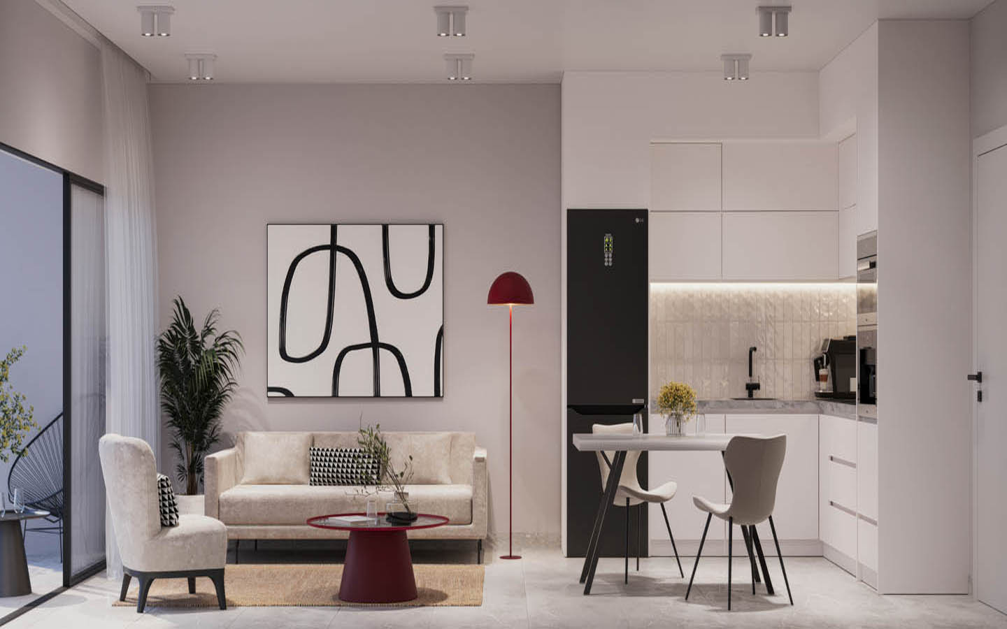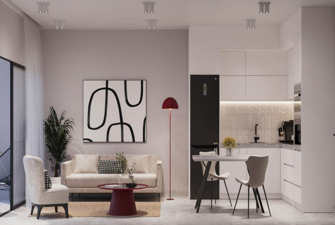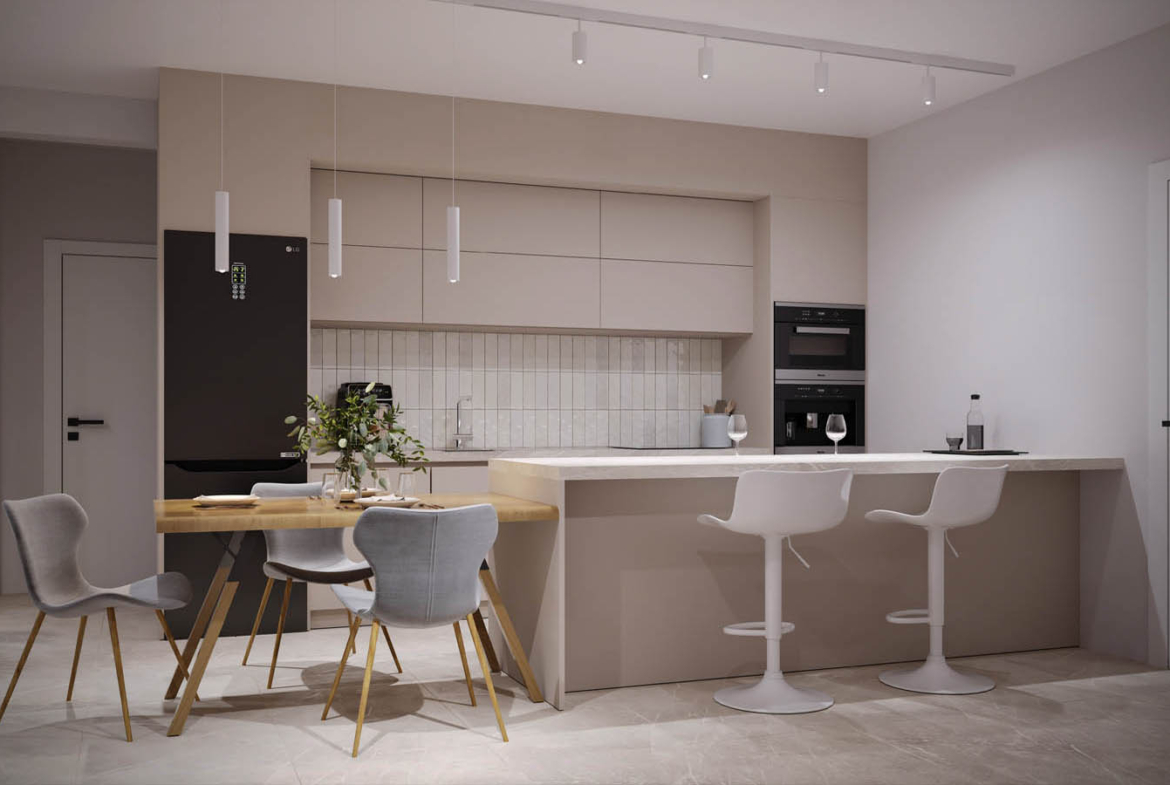 The atmosphere of the future interiors is already evident in the renderings. The living area is designed in a soft and sophisticated palette, where cream, sand, and light grey-beige tones prevail. These colours do more than decorate the space — they create a feeling of calm, light, and visual freedom. Expansive sliding glazing draws daylight deep into the interior, while sheer curtains soften it, transforming ordinary sunlight into an element of mood. The open-plan layout unites the kitchen, dining area, and living room into one fluid space where every element feels natural and perfectly placed. This is an interior not intended for showy luxury, but for someone who appreciates purity of line, tactile materials, visual calm, and the quiet beauty of everyday living.