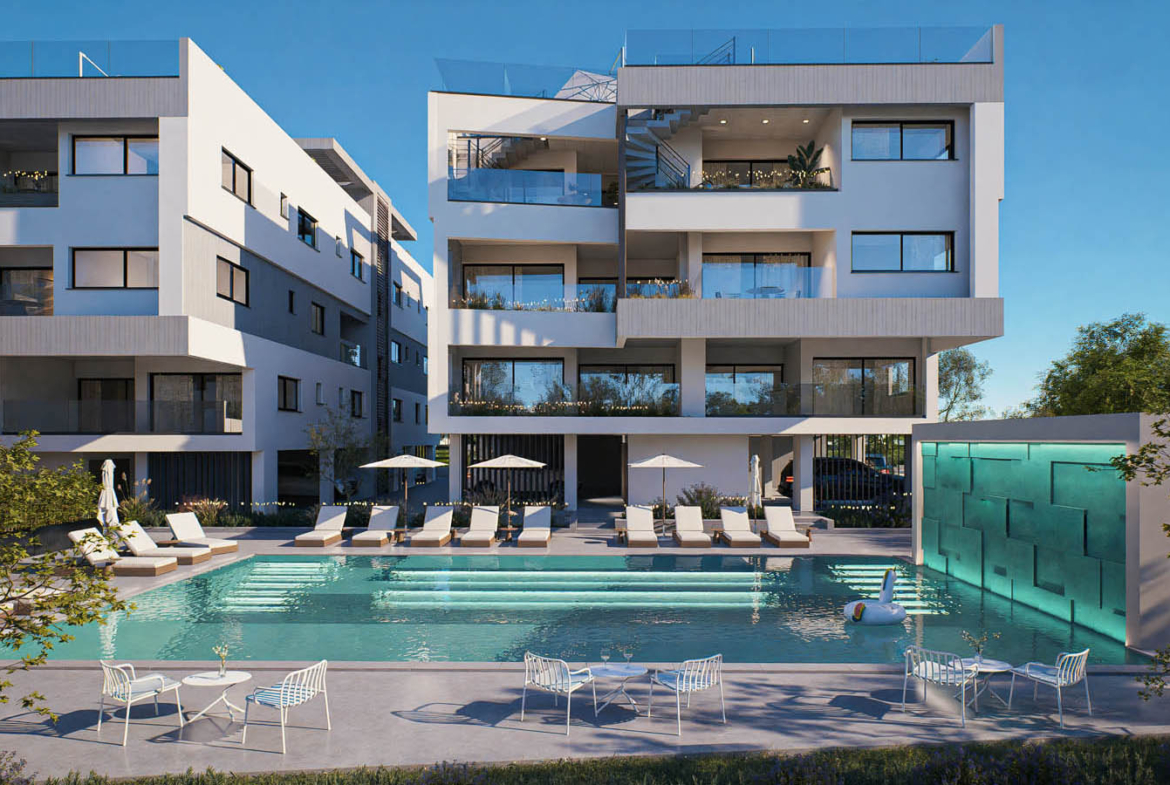 The architecture of this new development in Paphos conveys a sense of quiet luxury: clean horizontal lines, expansive terraces, glass balustrades, a soft white façade palette, and delicately integrated green accents create an environment where contemporary aesthetics do not compete with nature, but instead enter into a subtle, almost artistic dialogue with it. Even from the visuals, one can clearly feel the architects’ intention to give the building lightness and rhythm: the volumes appear to unfold in tiers toward the light, the inner courtyard, and the open sky, while the entire composition looks refined, current, and undeniably distinguished.