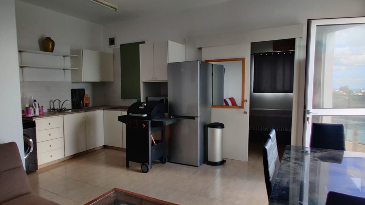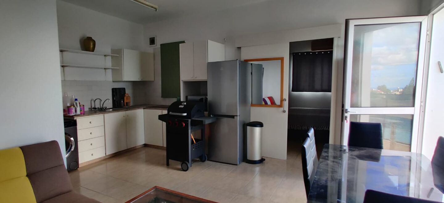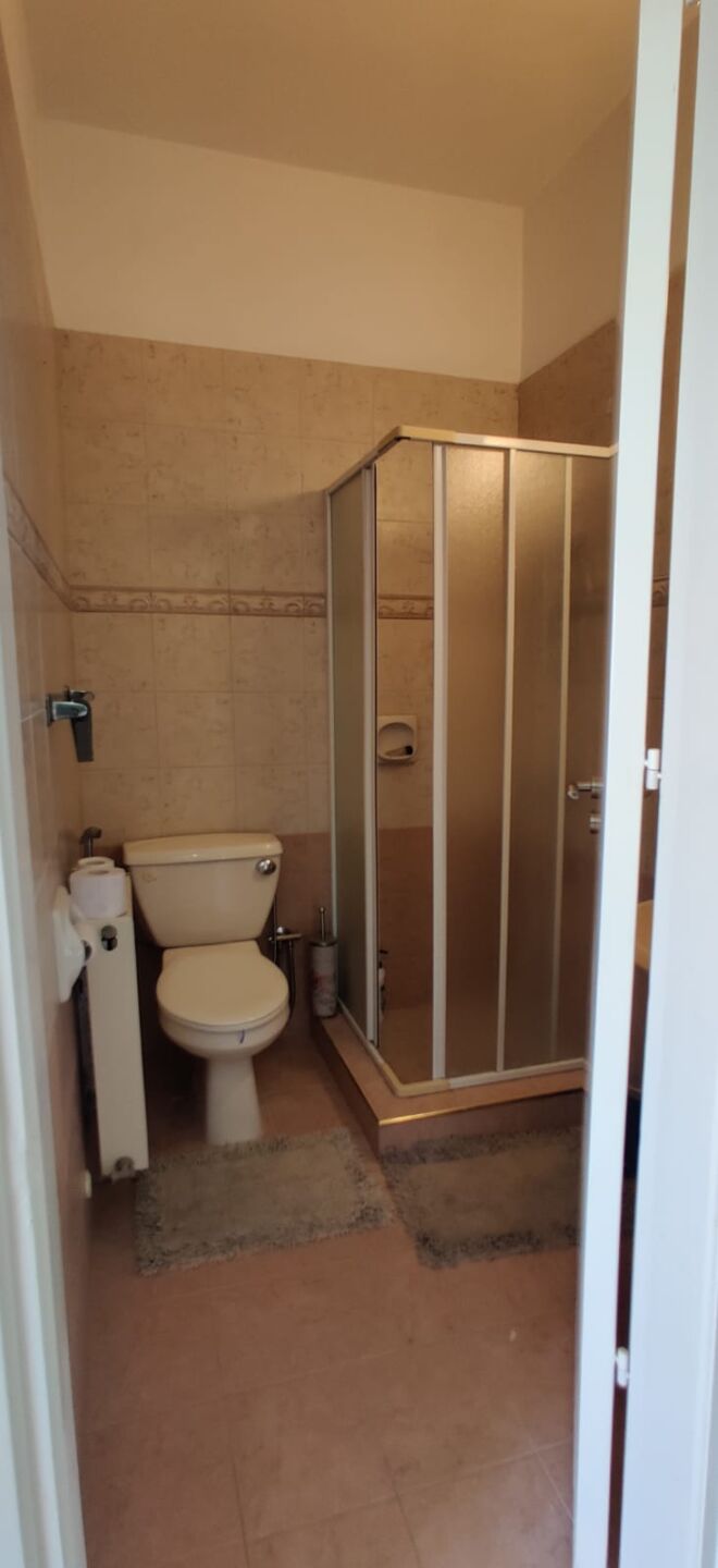 The apartment has its own warm, home-like atmosphere—as if it were a small independent residence for guests or family. The space combines a lounge-dining area with a compact kitchen corner: light walls and clean tiled floors create an airy feel, while a bright multi-coloured sectional sofa brings a playful touch, hinting at an easy holiday rhythm. Close by sits a dining table with sleek black chairs and a glass top—perfect for breakfast before a swim or a late supper when the air turns pleasantly cool. The kitchen is practical and straightforward: simple white cabinetry, a work surface, space for appliances, and even a barbecue/grill area—an excellent bonus for anyone who enjoys cooking over flame and entertaining without turning the main house into a “host zone.” The bedroom is calm and neat, with generous built-in white wardrobes spanning the wall, thick curtains for daytime privacy and welcome coolness, and that satisfying sense of order when everything is exactly where it should be.
