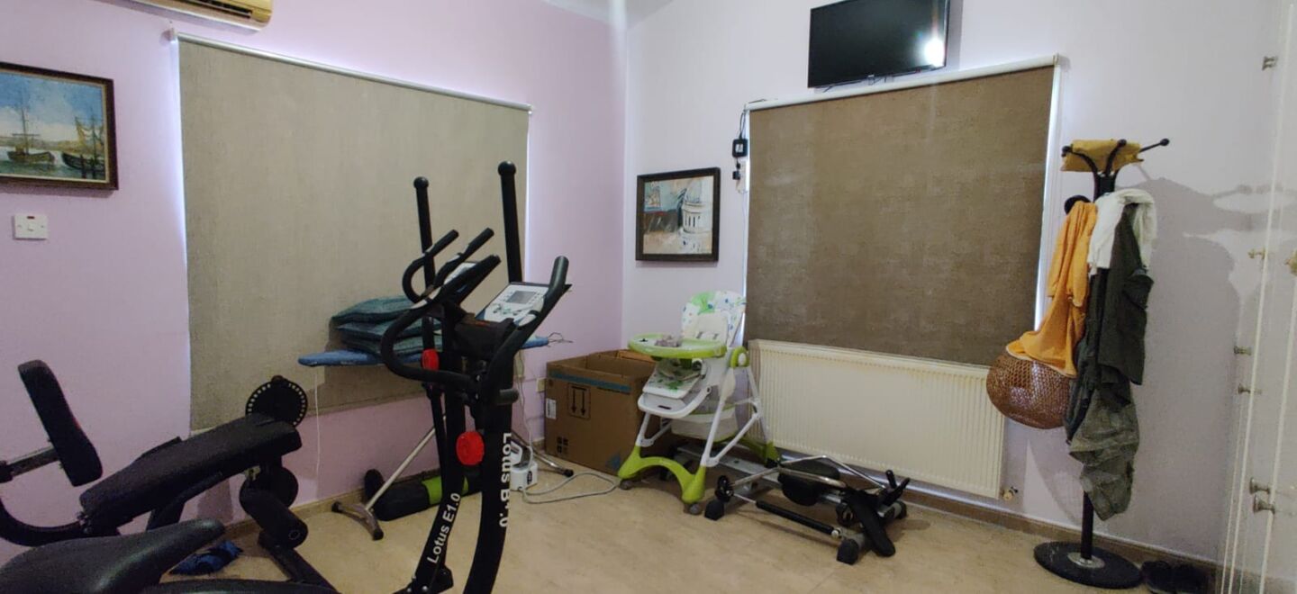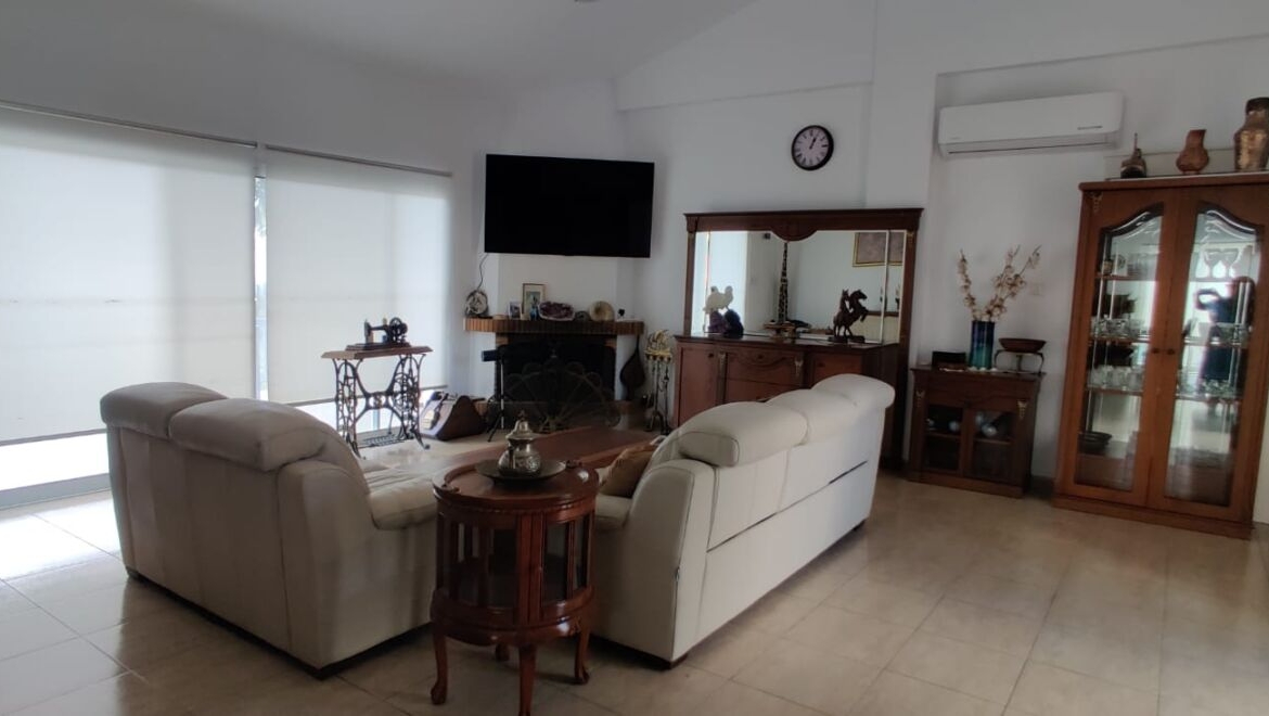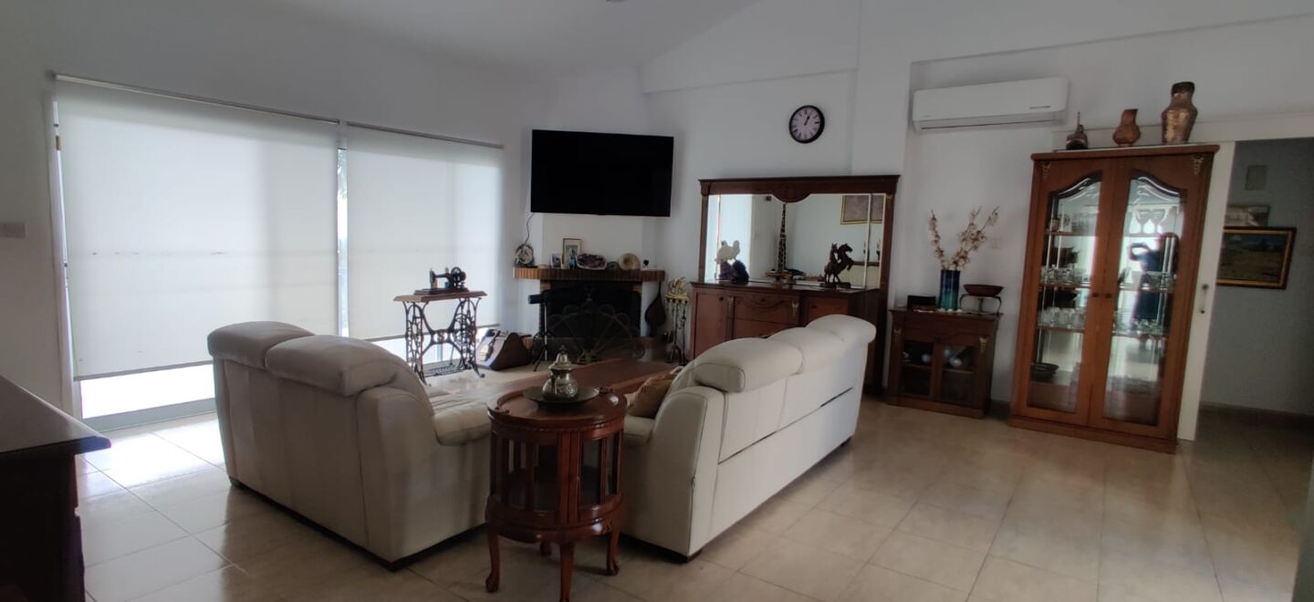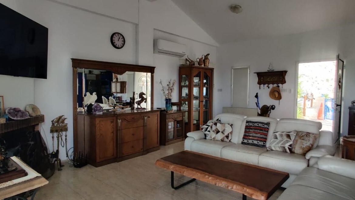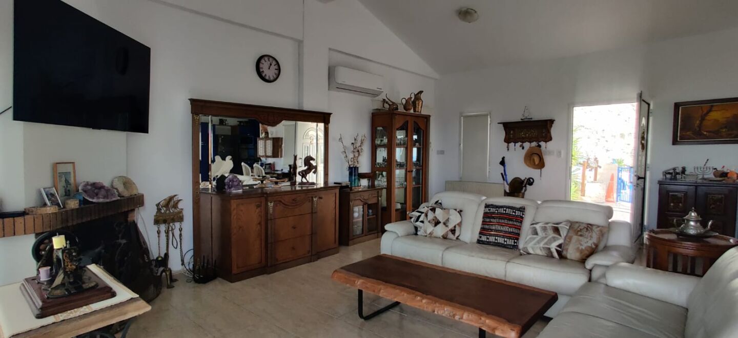 Inside the bungalow, the interiors echo that same lightness. The living room feels open and bright: wide sliding doors with simple roller blinds, smooth pale floor tiles, and a high ceiling that visually lifts the whole space. At the centre is a fireplace—easy to imagine on a cool Paphos winter evening with a glass of wine, when warmth becomes something you genuinely savour. Soft leather seating is arranged for easy conversation, while solid wooden sideboards and display cabinets add a lived-in, welcoming character. Air conditioning is already installed, so summers stay fresh and shoulder seasons remain comfortable.