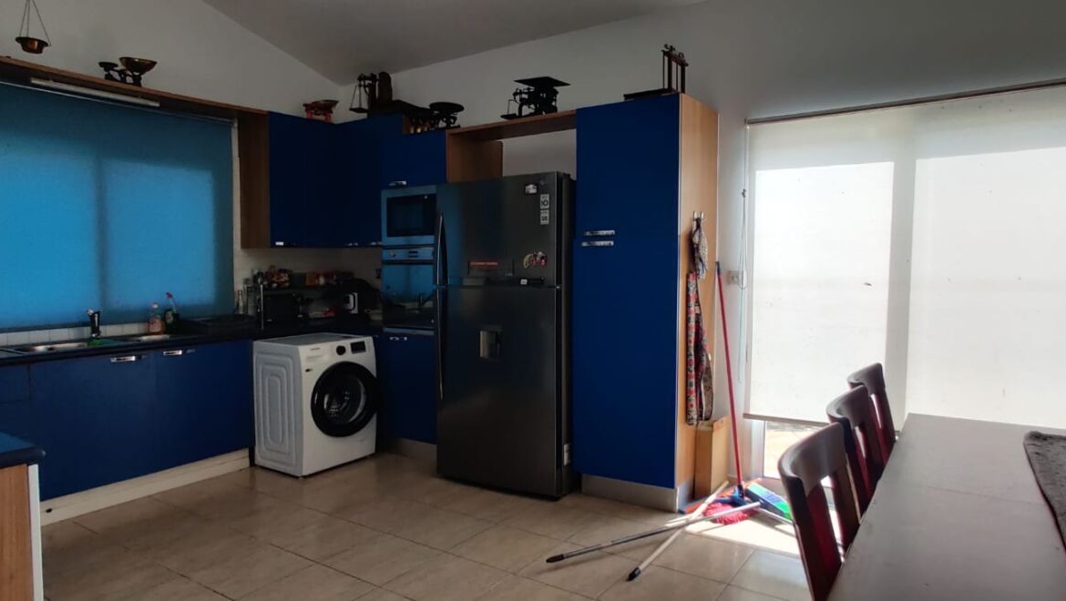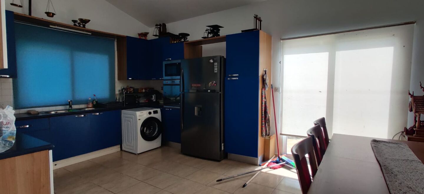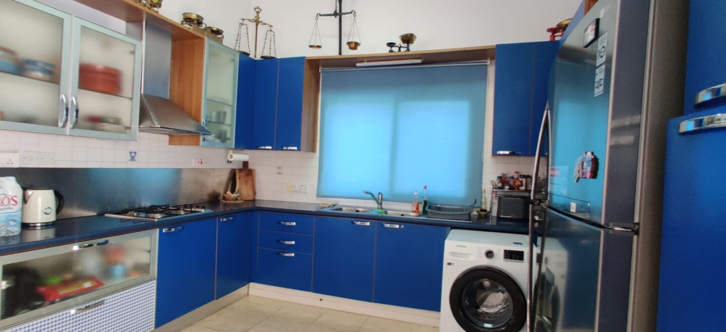 The kitchen is large and truly functional—no compromises. A blue U-shaped layout offers generous worktops and plenty of storage, appliances are placed logically, and the window draws in natural daylight. This is a kitchen made not only for everyday cooking, but also for gathering loved ones around home dinners—those evenings when conversation carries on, time slips by unnoticed, and the house becomes the backdrop to your daily happiness.