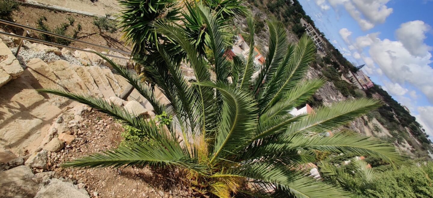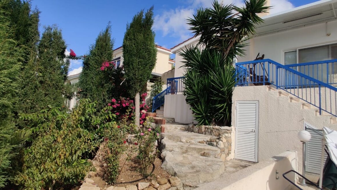 This property feels genuinely special—an intimate, characterful space designed with privacy in mind. The main residence is a spacious bungalow: whitewashed walls, terracotta roof tiles, a neat porch with columns, and a welcoming entrance courtyard where the Cypriot sun paints soft shadows across warm textured plaster. Around it stretches a garden that feels alive rather than decorative—lush greenery, mature plants, stone steps leading down toward the pool area, and flowering touches that give the whole home an effortless resort mood.