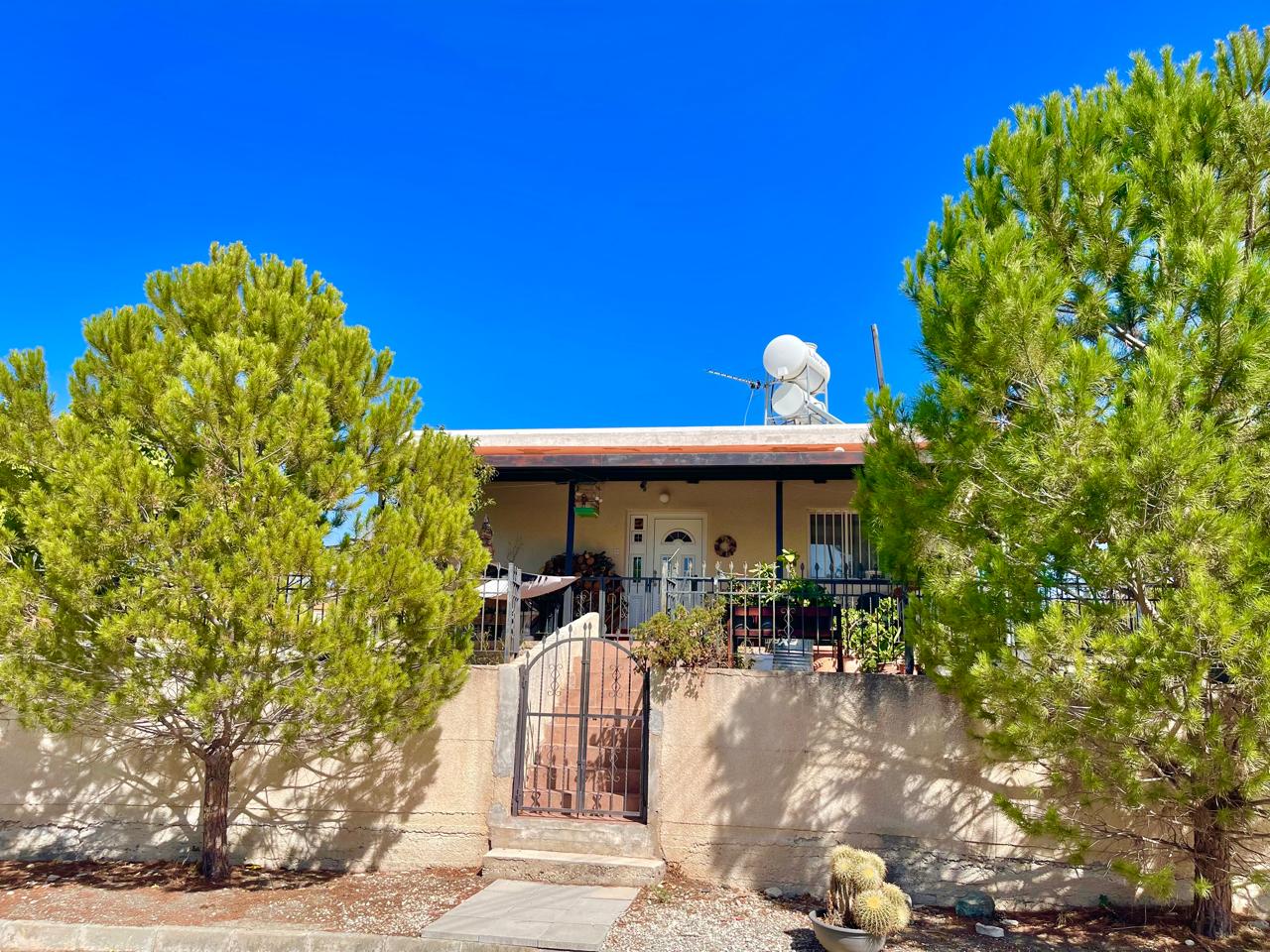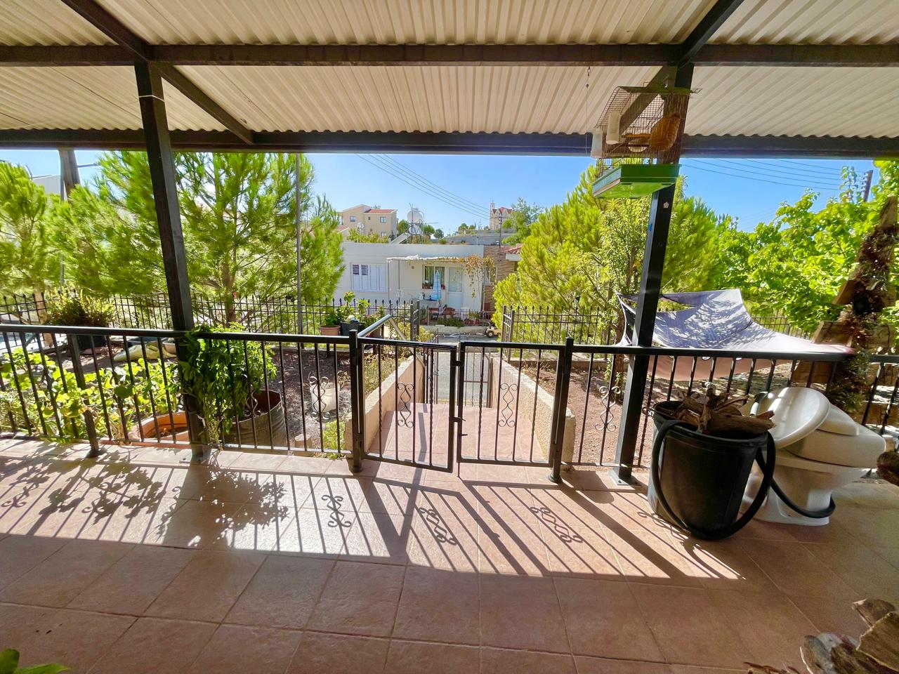 This bungalow welcomes you with a sense of calm and of “your own place.” The exterior is simple and honest: warm-toned plaster, a white front door, and an iron balustrade with decorative curls that frames a neat little courtyard. Two pines seem to hold the façade in a green embrace, while the solar water heater on the roof glints in the sun—an unfailing companion of the Cypriot summer that warms your water with nothing but daylight.