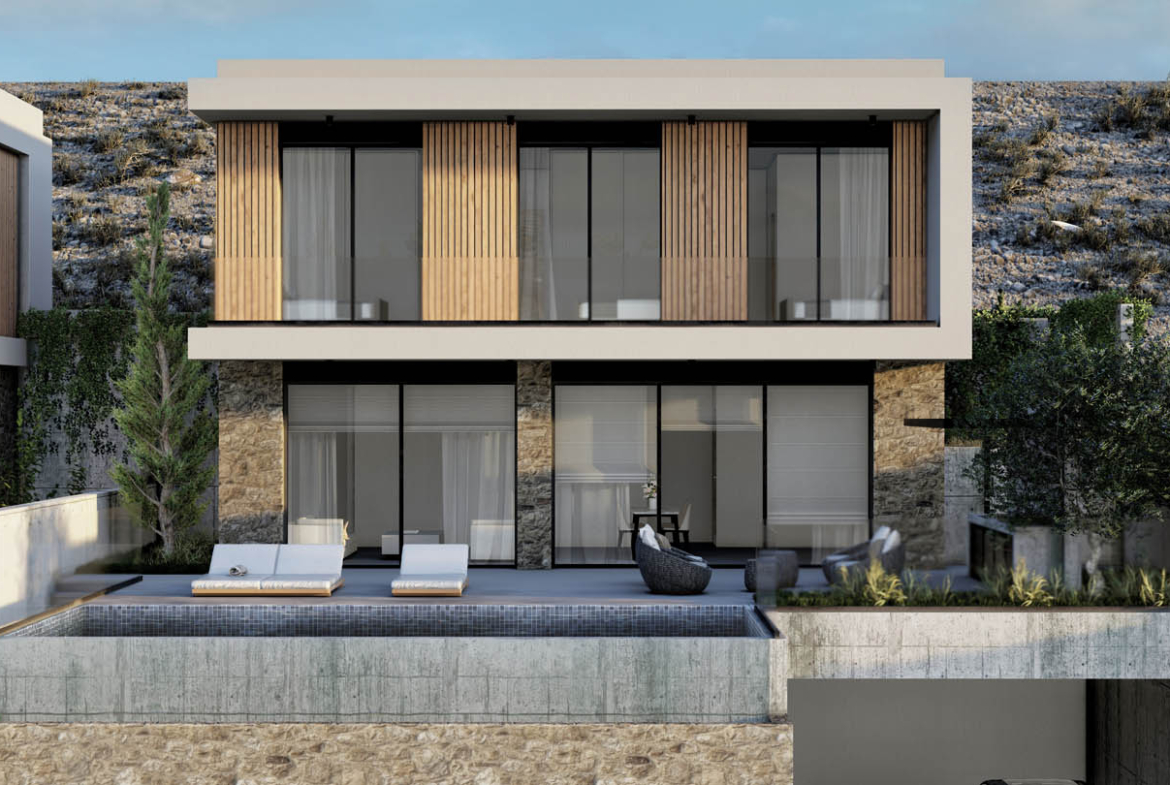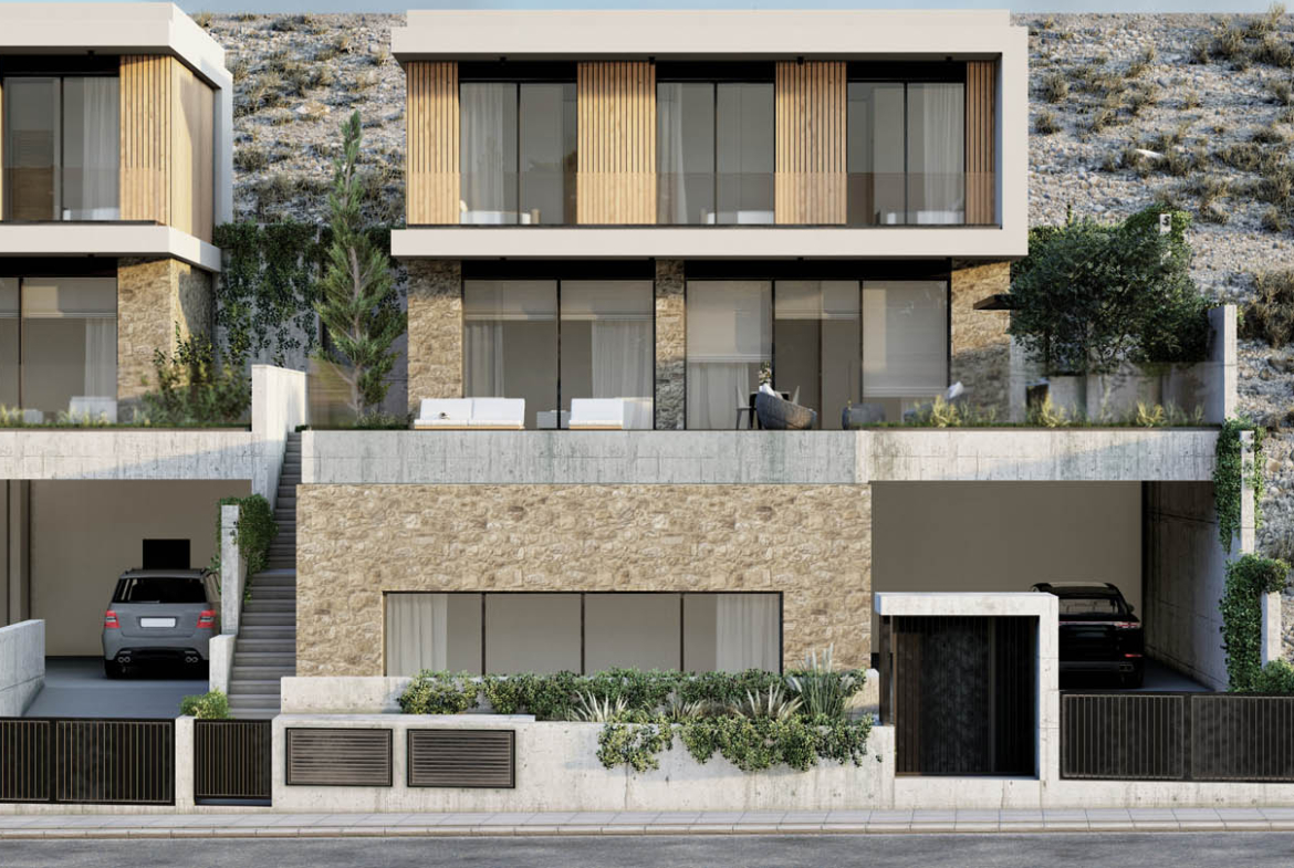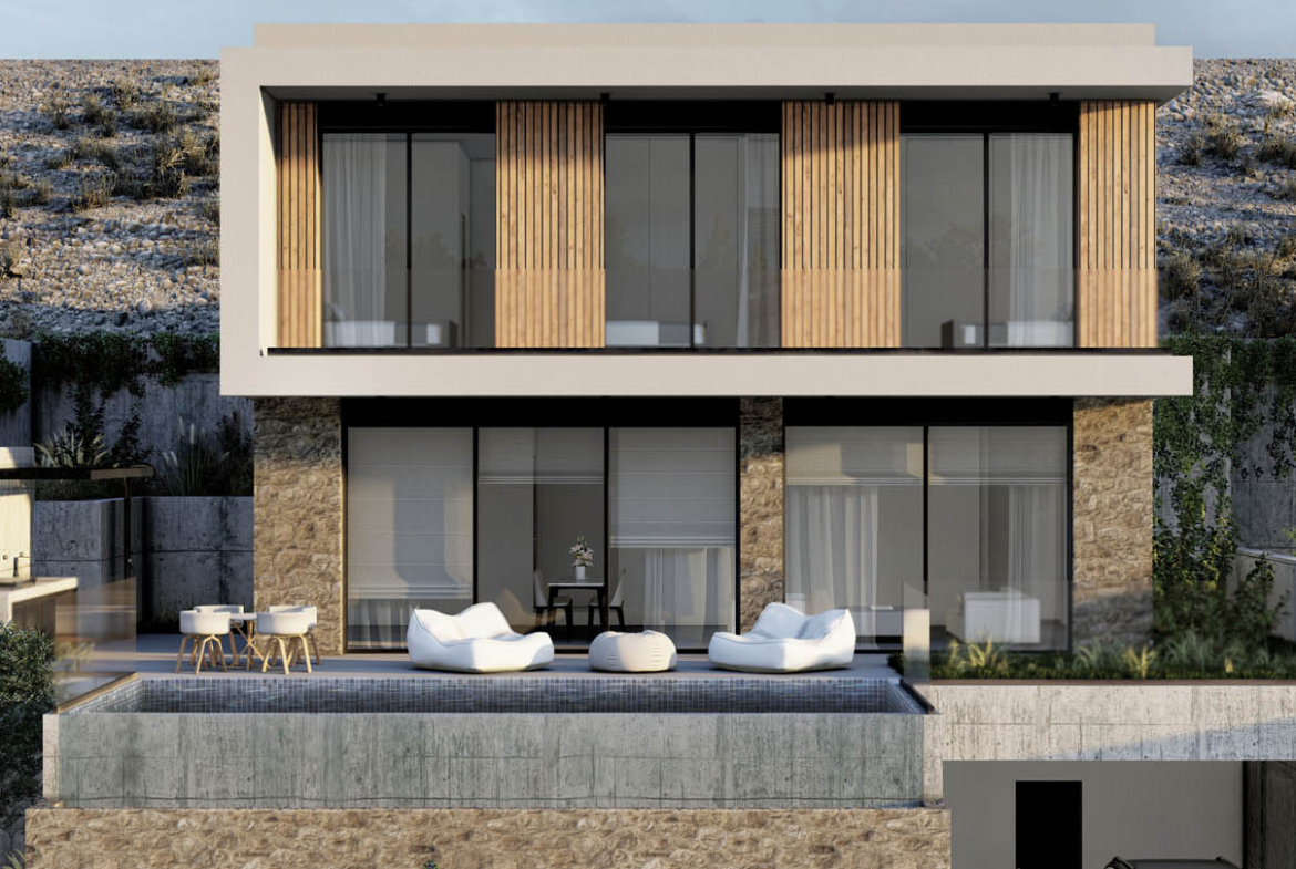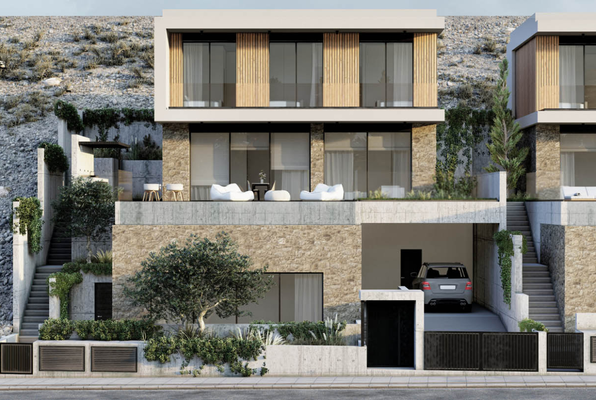 Carved into the hillside, this contemporary villa seems to hover above the city—poised where the horizon melts into the shimmer of the sea. Architectural thought has been distilled here, on a southern coastal slope dotted with wild herbs and olive trees. Stone, glass, and concrete don’t clash, but rather complement each other, converging into a refined geometric language. The natural slope becomes a co-author of form, while sunlight acts as a silent decorator, casting shadows across each surface.