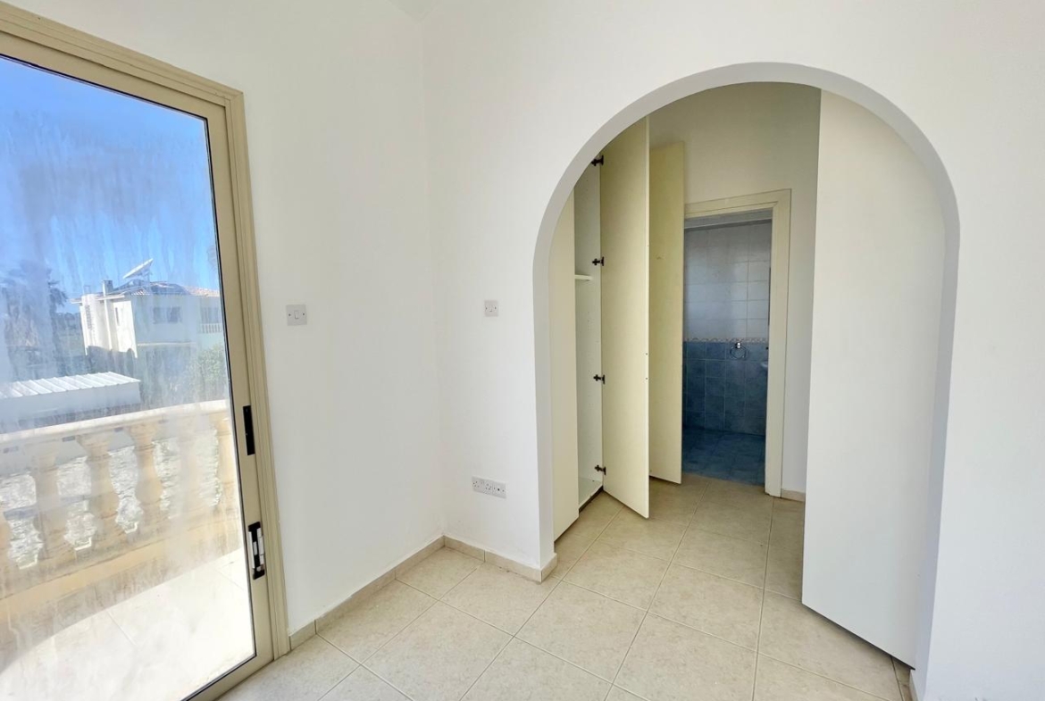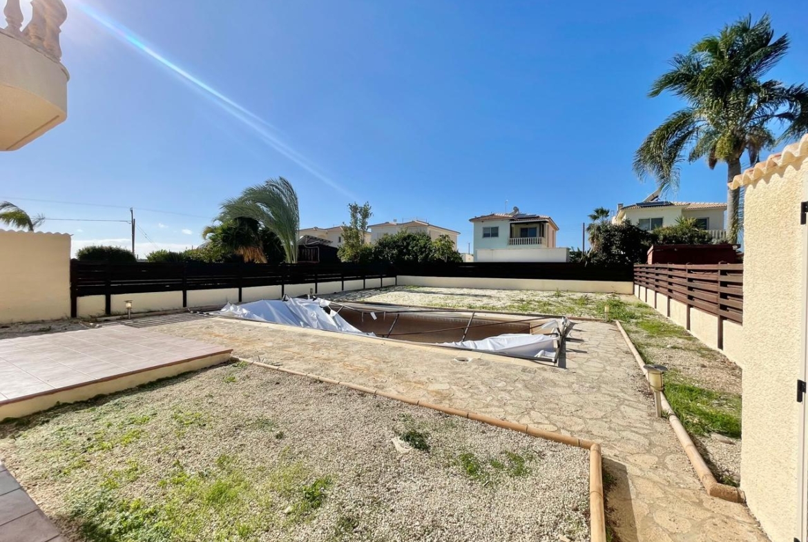 Its façade, painted in soft, sun-warmed tones, is framed by a modest perimeter wall—just enough to offer privacy without shutting out the brilliant Cypriot light. Elegant balcony curves with classical balustrades lend the exterior a nostalgic charm, as if summer evenings with cicadas and the gentle ripple of water in the pool once filled this space. And the pool, right at the heart of the paved courtyard, is ready for a refresh—soon to be the place for a brisk morning swim or relaxed evening gatherings beneath the shaded veranda.