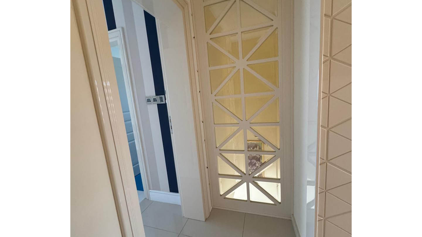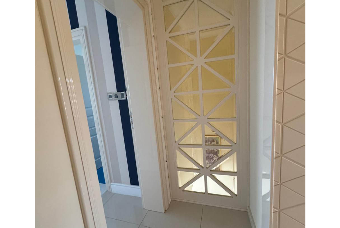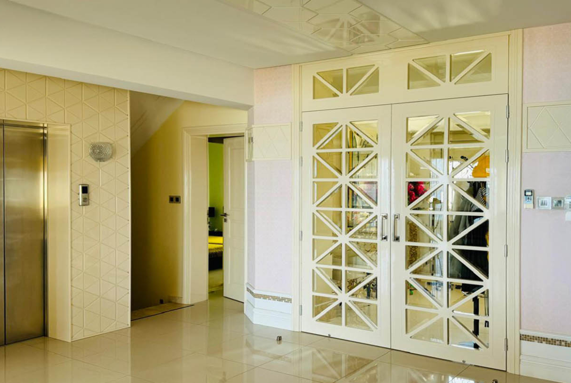 The ceiling is finished with modern decorative panels, introducing a subtle play of light and shadow. Golden chandeliers and integrated lighting add warmth and depth, creating a particularly inviting atmosphere in the evening. The décor is supported by carefully chosen materials — including English and Italian wallpaper and Italian crystal light fixtures, which bring a fine sparkle without ever feeling excessive.