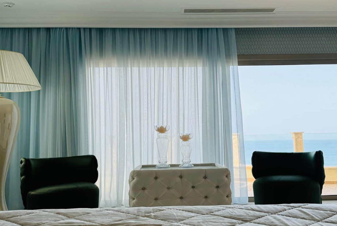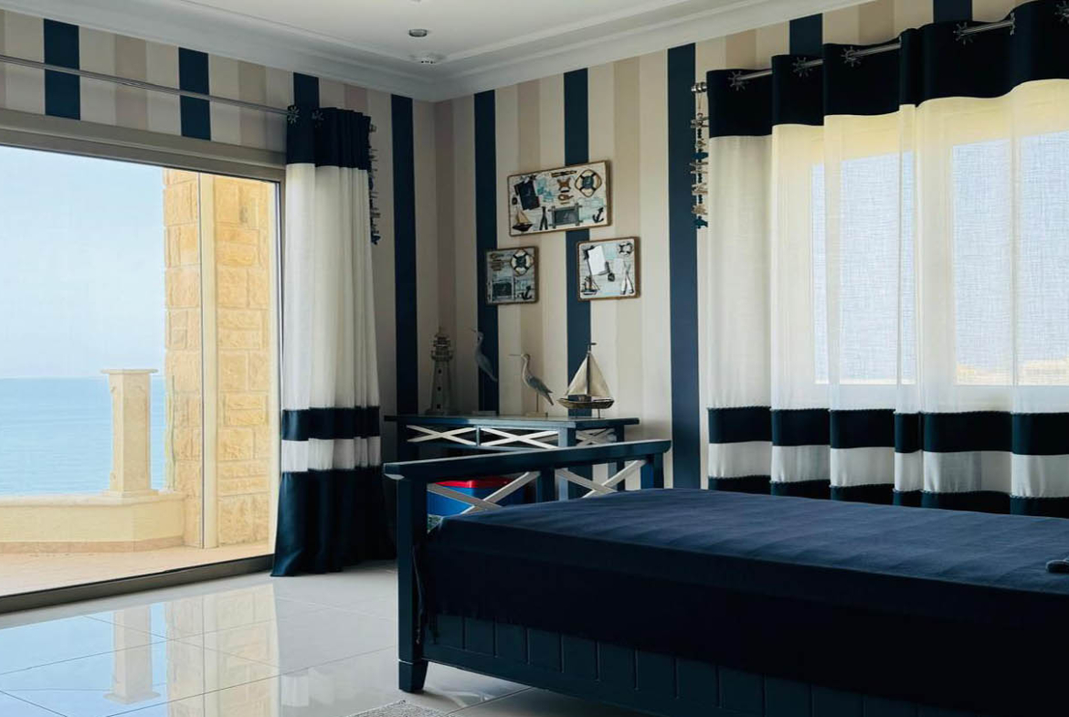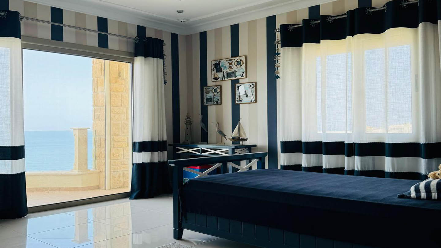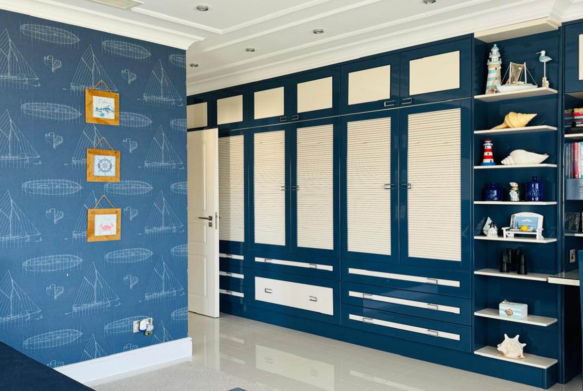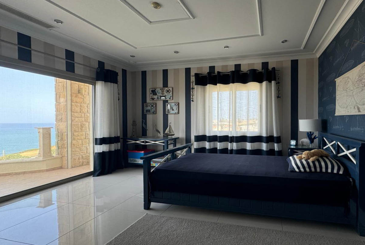 The villa’s bedrooms are designed with an individual approach, each reflecting a distinct mood and style. The master bedroom embodies serenity and elegance: a soft blue palette, textured wall finishes, and gentle lighting create an atmosphere of complete balance. A large bed with a tall headboard and refined accessories underline its status as a private oasis for rest. The second bedroom follows a marine theme, with striped wallpaper, blue-and-white accents, details reminiscent of sea journeys, and windows opening to uninterrupted sea views. The third bedroom feels almost like a fairy tale — delicate butterfly wallpaper, a headboard shaped like wings, and soft textiles create a joyful, inspiring ambience, ideal for a child.