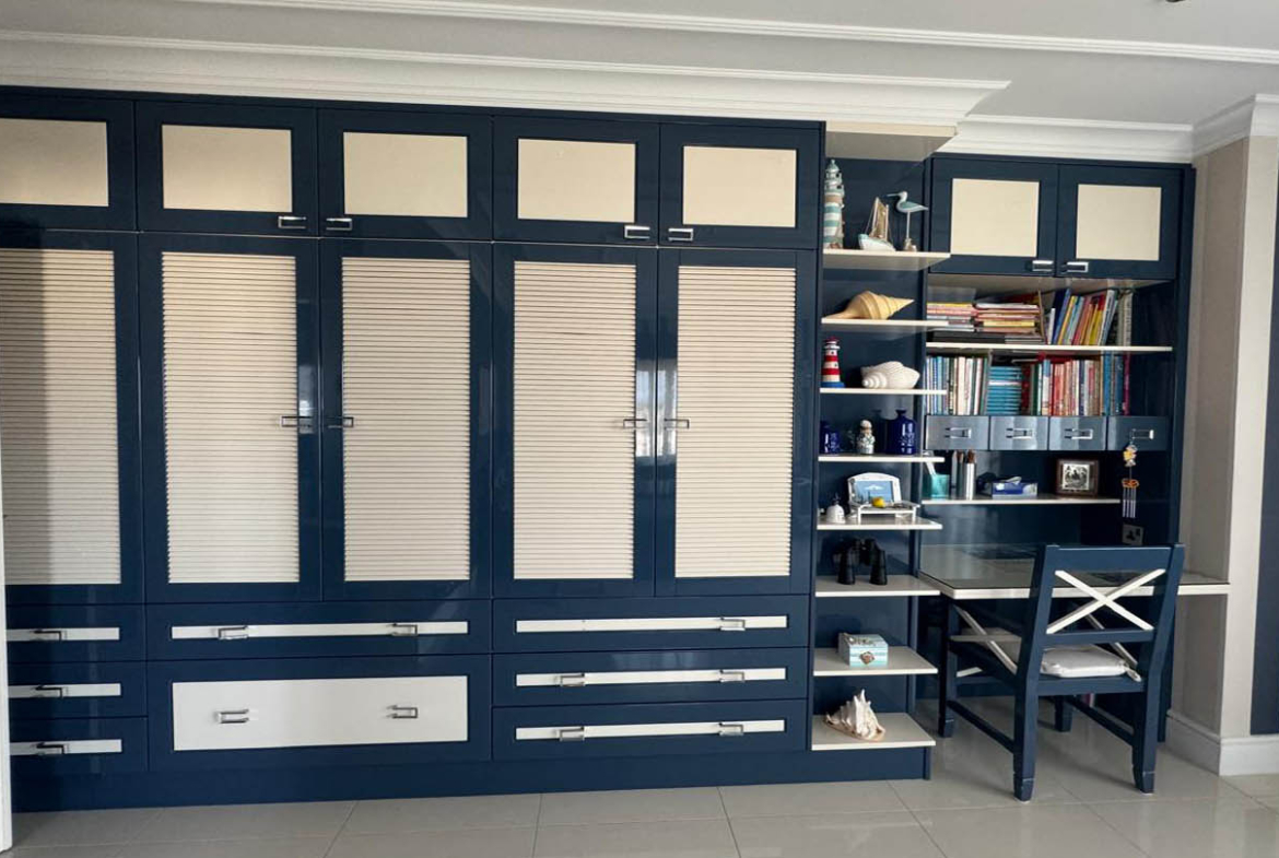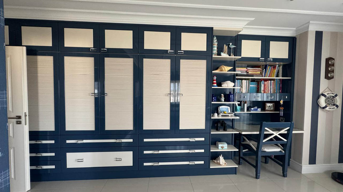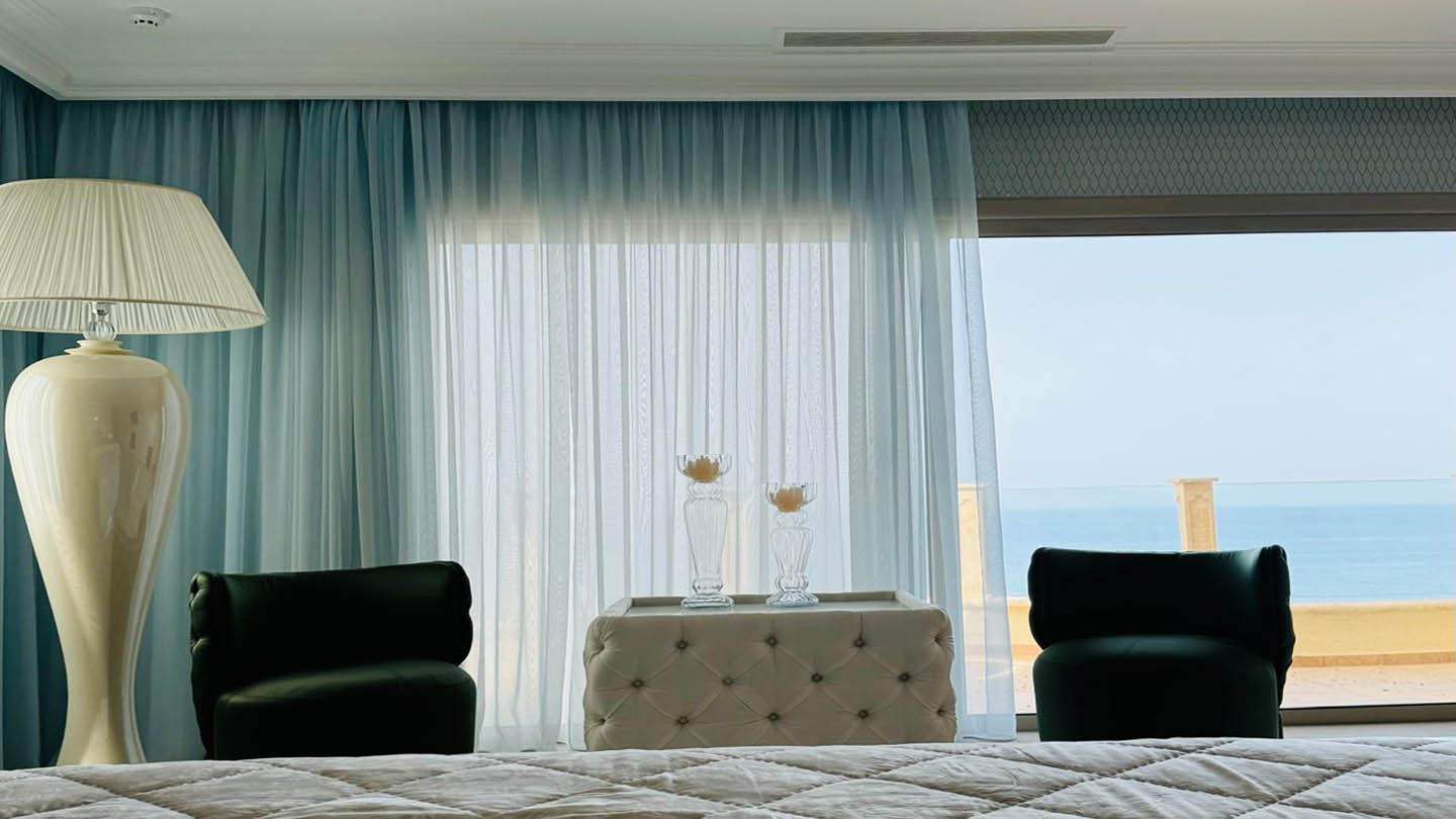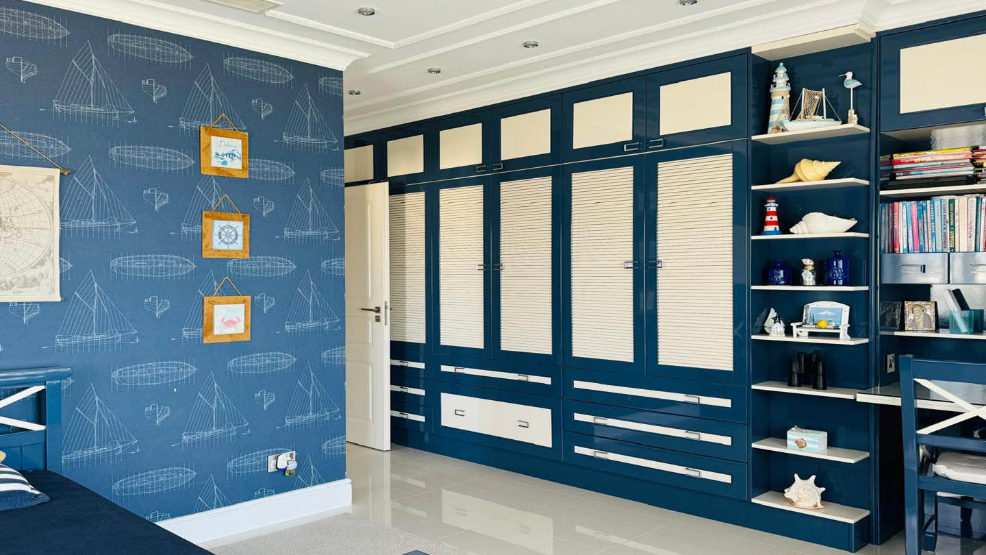 The villa’s bedrooms are designed with an individual approach, each reflecting a distinct mood and style. The master bedroom embodies serenity and elegance: a soft blue palette, textured wall finishes, and gentle lighting create an atmosphere of complete balance. A large bed with a tall headboard and refined accessories underline its status as a private oasis for rest. The second bedroom follows a marine theme, with striped wallpaper, blue-and-white accents, details reminiscent of sea journeys, and windows opening to uninterrupted sea views. The third bedroom feels almost like a fairy tale — delicate butterfly wallpaper, a headboard shaped like wings, and soft textiles create a joyful, inspiring ambience, ideal for a child.