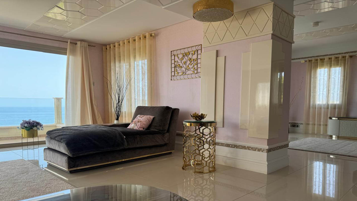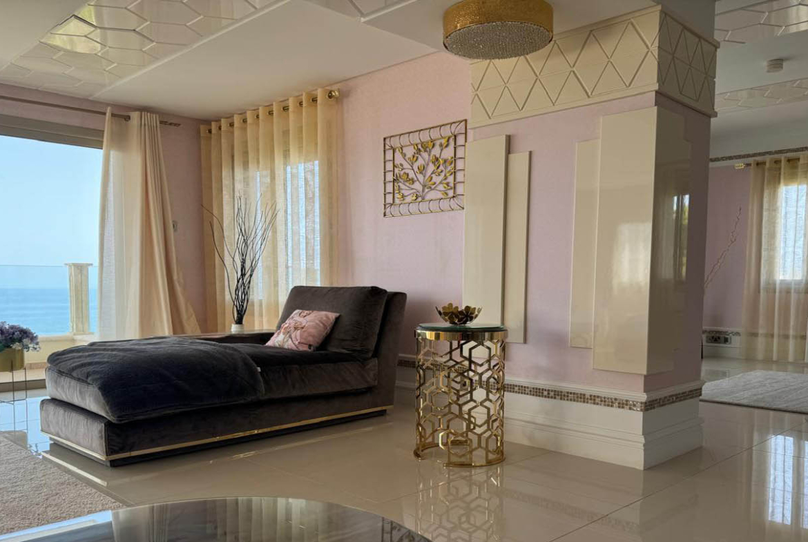 Inside, the villa is filled with light and a sense of openness, felt most strongly in the spacious living room with panoramic windows. This living area is a true expression of luxury and refined taste. The heart of the interior is formed by elegant armchairs and sofas in grey velvet upholstery, complemented by golden accents on decorative side tables. Their precise geometric silhouettes bring dynamic rhythm to the space, while glass tabletops add airiness and light. The contrast between dark furniture and glossy ceramic floor tiles further highlights the sophistication of the design.